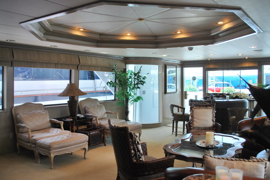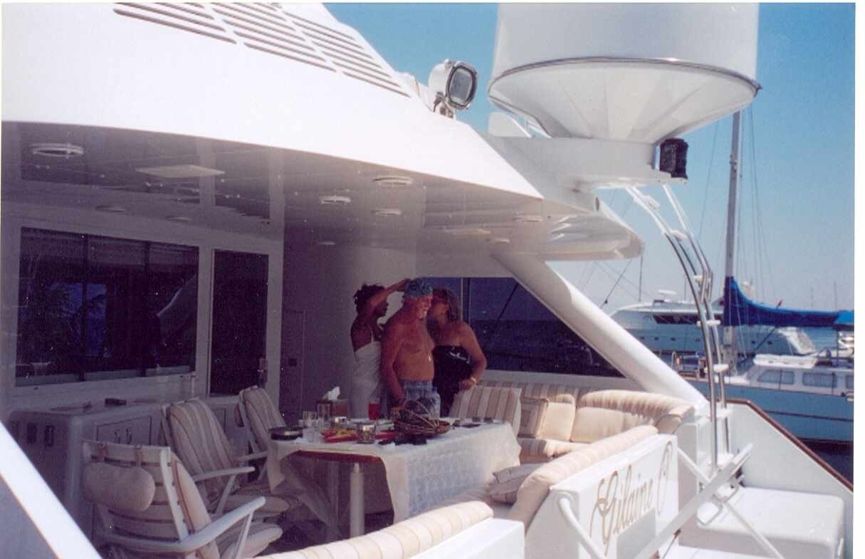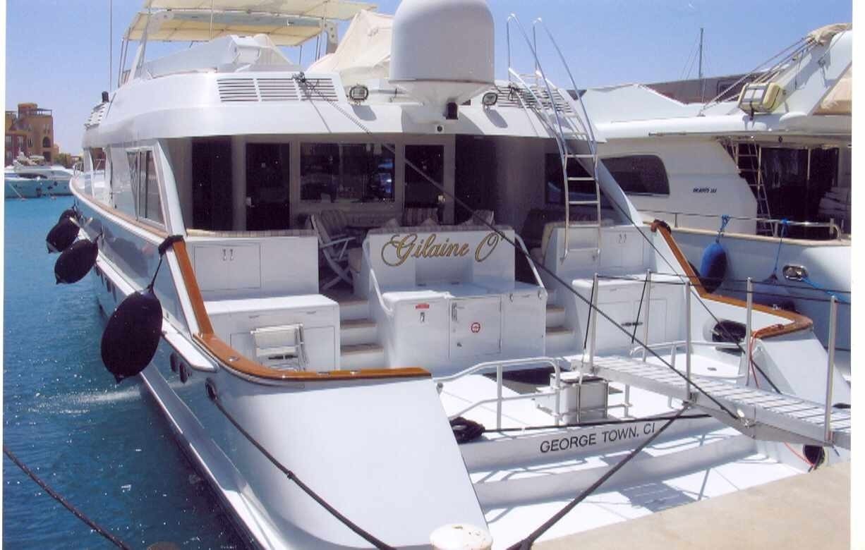 Powered by 1872hp engines, yacht GILAINE O cruises at 15 knots and can reach top speeds of 24 knots. The yachts GRP hull is fitted with bow thrusters and stabilizers for maneuverability and comfort.