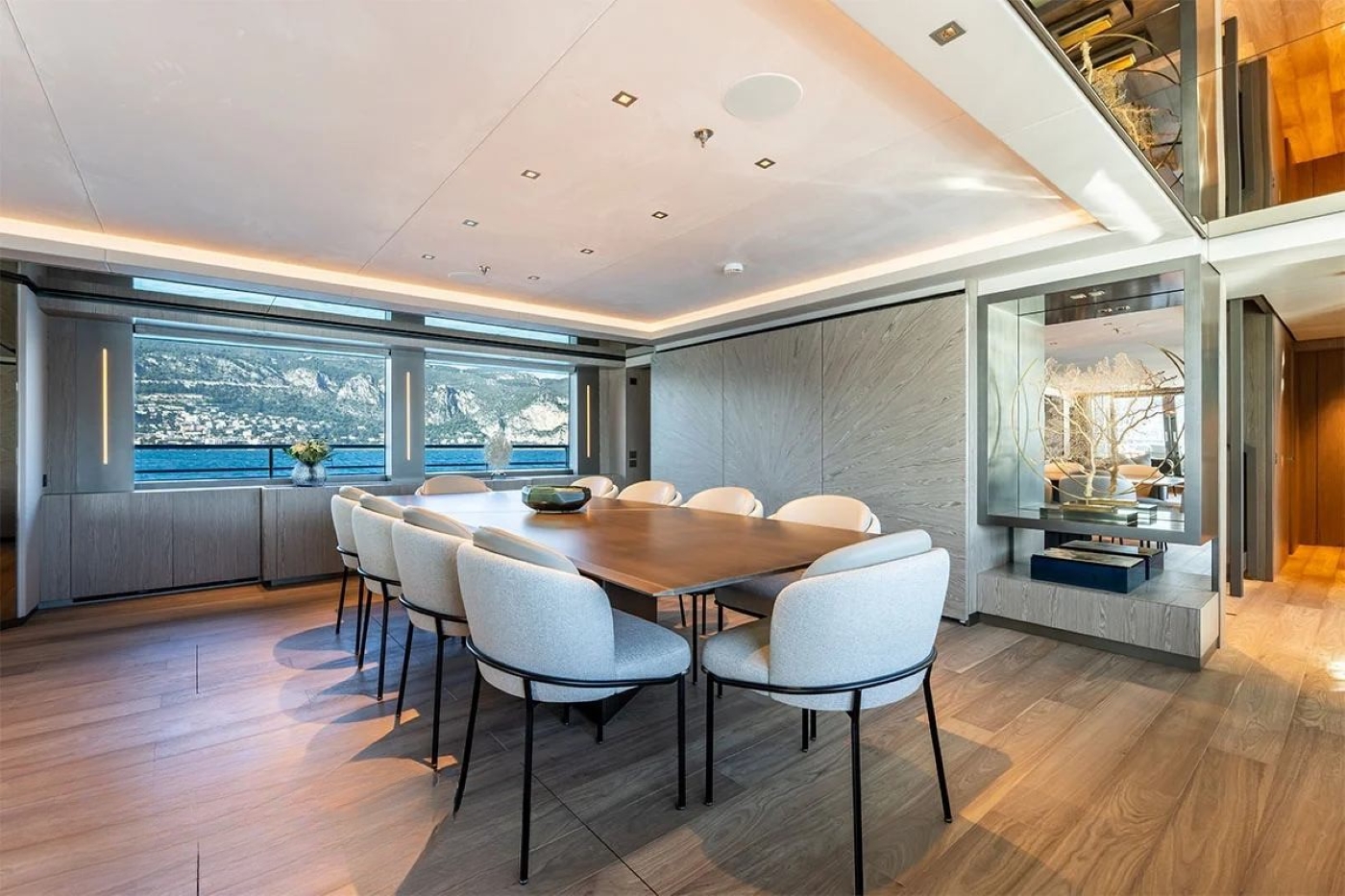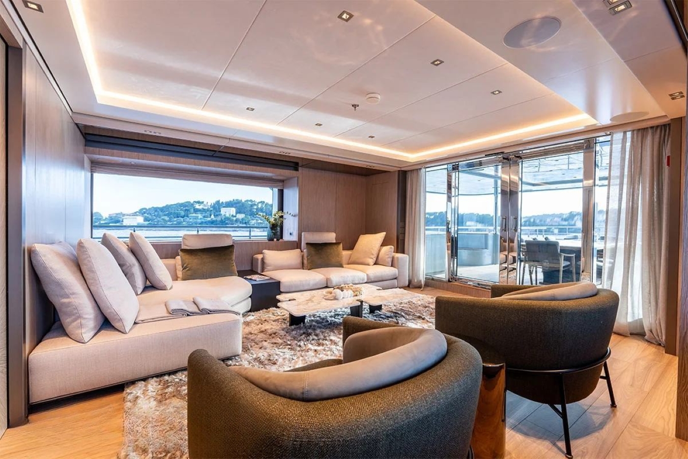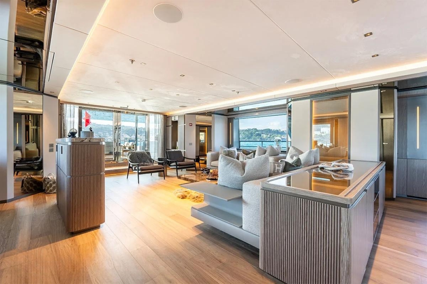 The interior volumes are arranged in two spacious salons and four large guests cabins plus an owner’s suite located on the forward main deck.