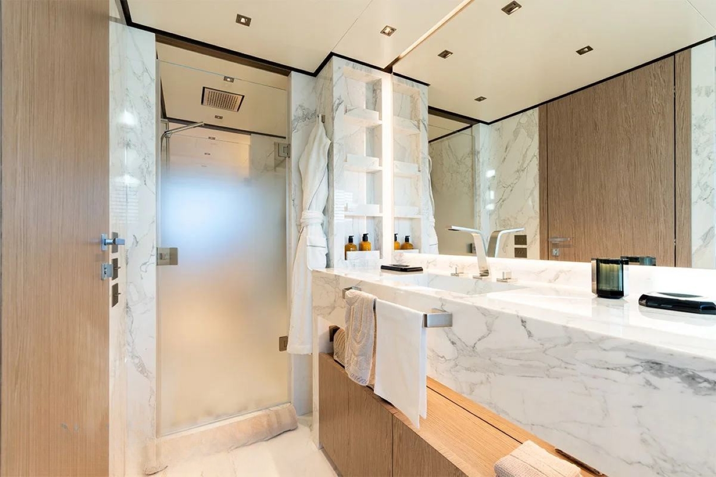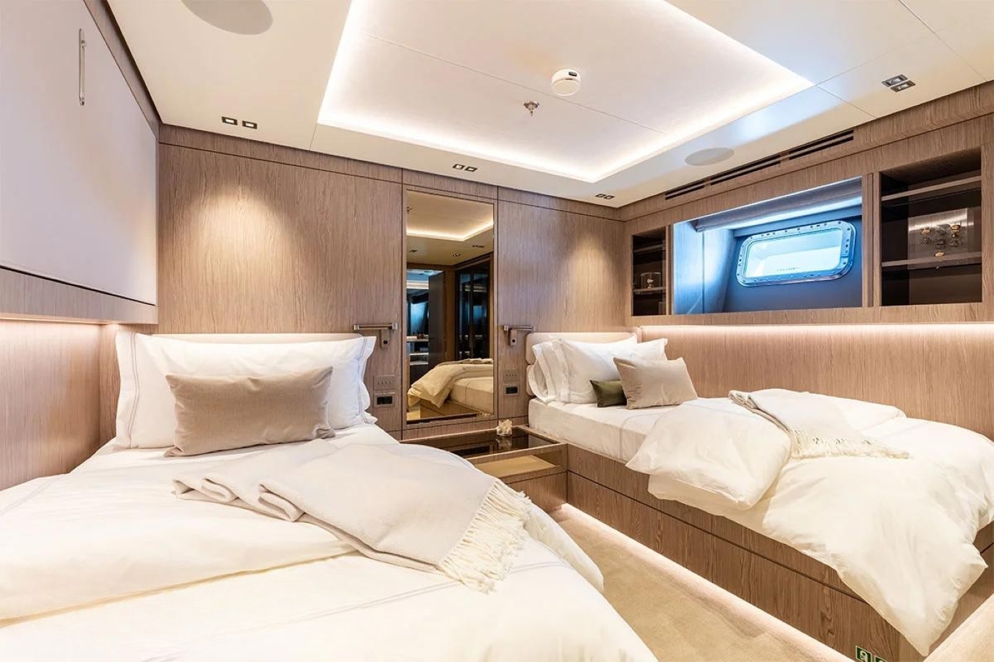 Five suites provide accommodation for up to twelve guests in four guest suites and one owner’s suite. The guest suites are configured as two doubles and two twins – each with an additional pullman bunk. The owner’s suite is forward on the main deck.