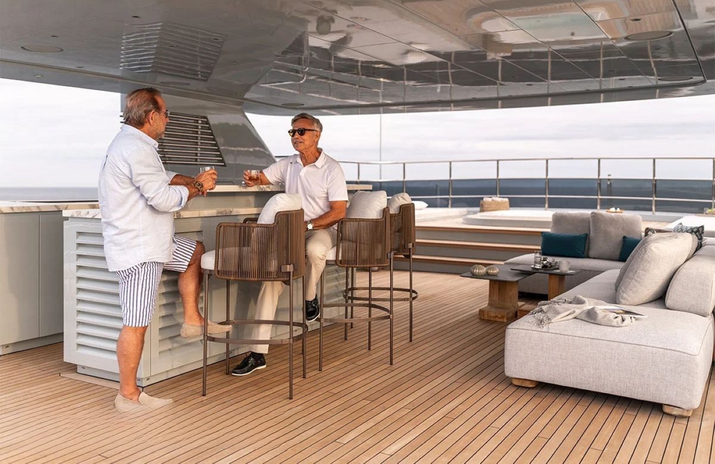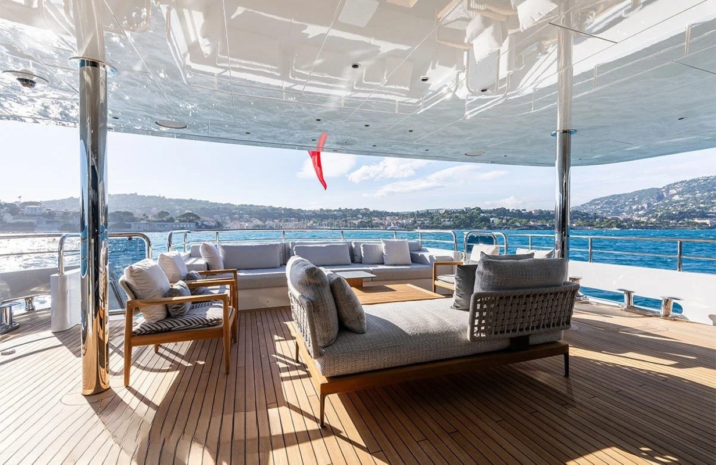 With her vertical bow and large feature windows, she presents with a refined profile and expansive exterior decks with a 9m beam and 2.6m draft which complement the 43m length and tri-deck design.