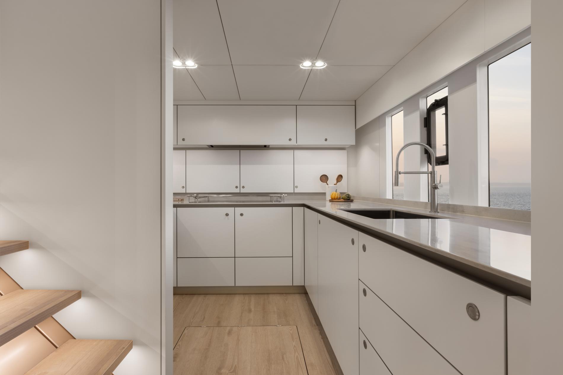 The galley is down in the port hull dedicating the main salon entirely to guest comfort.