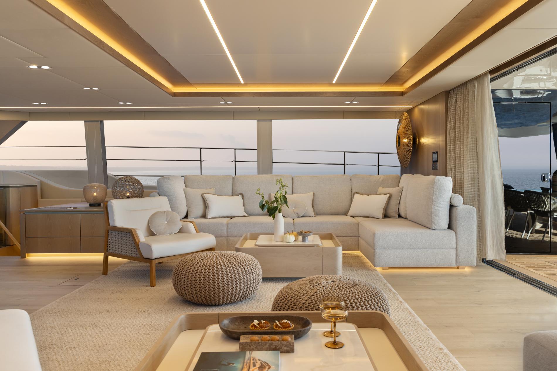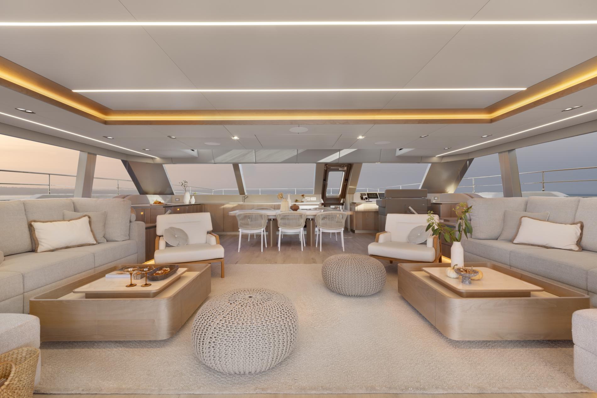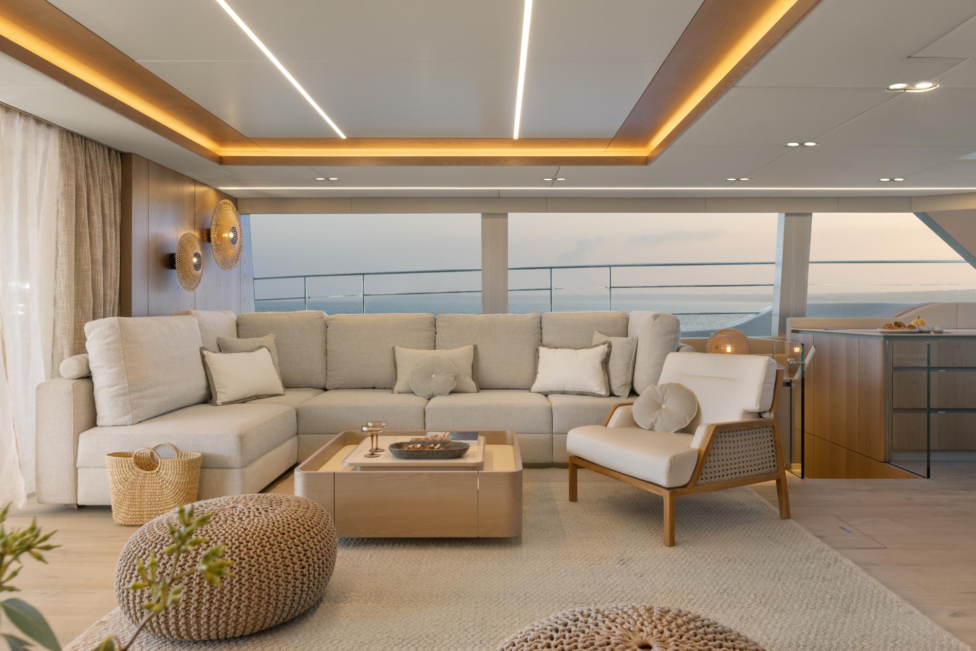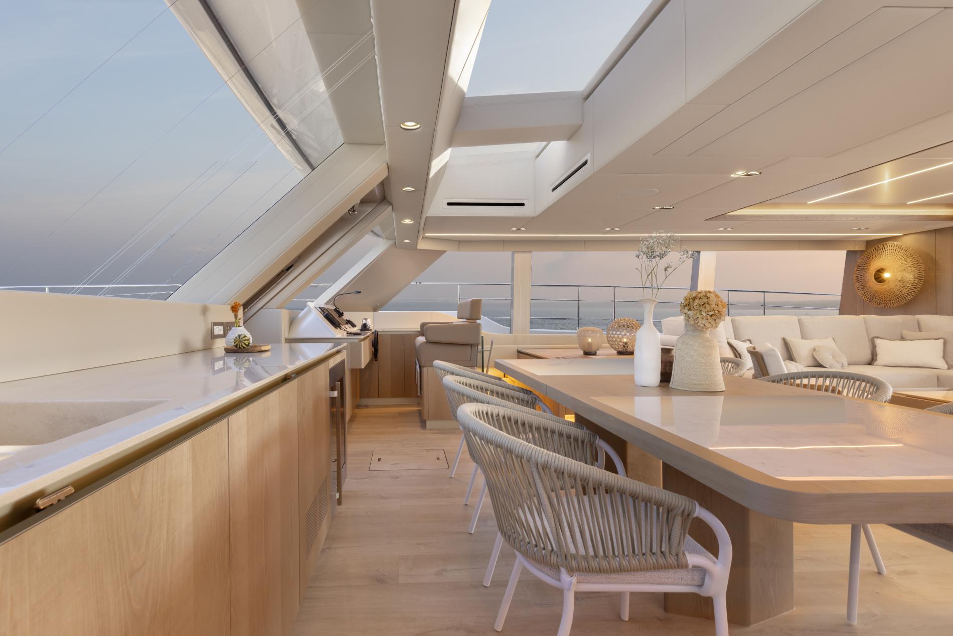 The beautiful interior has an elegant beach house feel with light wood finishes, neutral soft furnishings and sociable layout. On each side is an L-shaped sofa and armchairs surrounding coffee tables while a dining setting is placed forward. Windows on all sides fill the space with natural light during the day while at night the sophisticated lighting creates a warm and welcoming atmosphere. Doors lead out the main cockpit and there is also a useful single door out to the foredeck which gives the yacht a great flow.