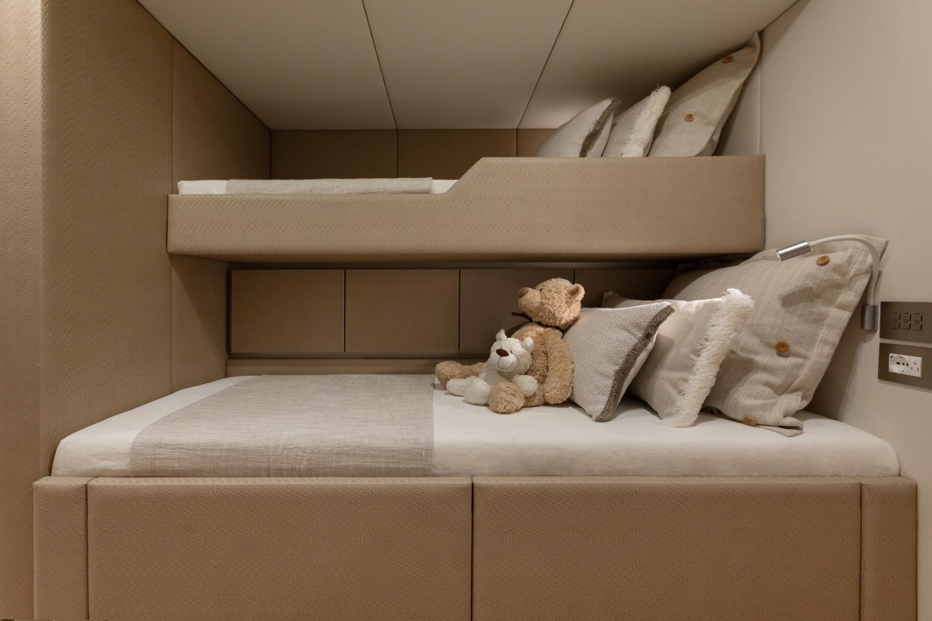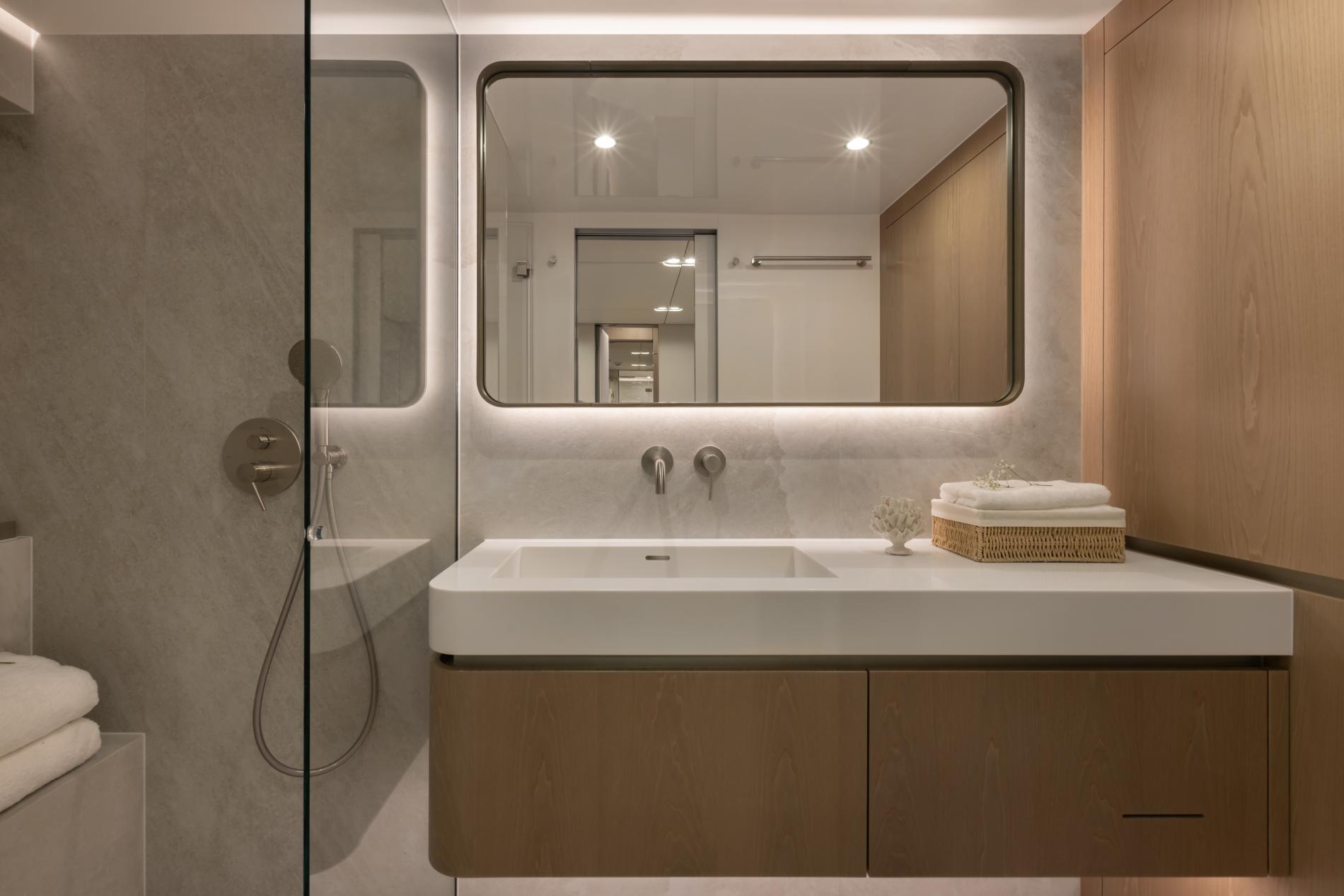 There are four guest suites on the lower deck which can accommodate up to eight guests. In the port hull there is a private master suite with king-sized bed and deluxe ensuite while the starboard hull has a double cabin with private access from the aft deck, adjustable twin/double and a kids cabin with bunk beds – all with ensuite bathroom facilities.