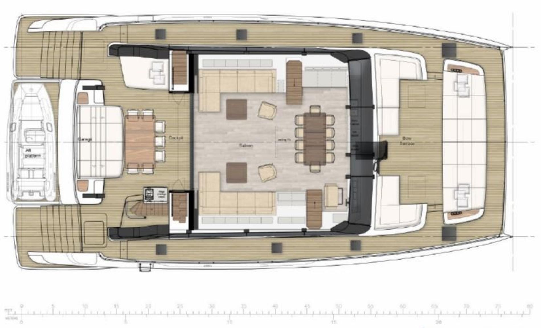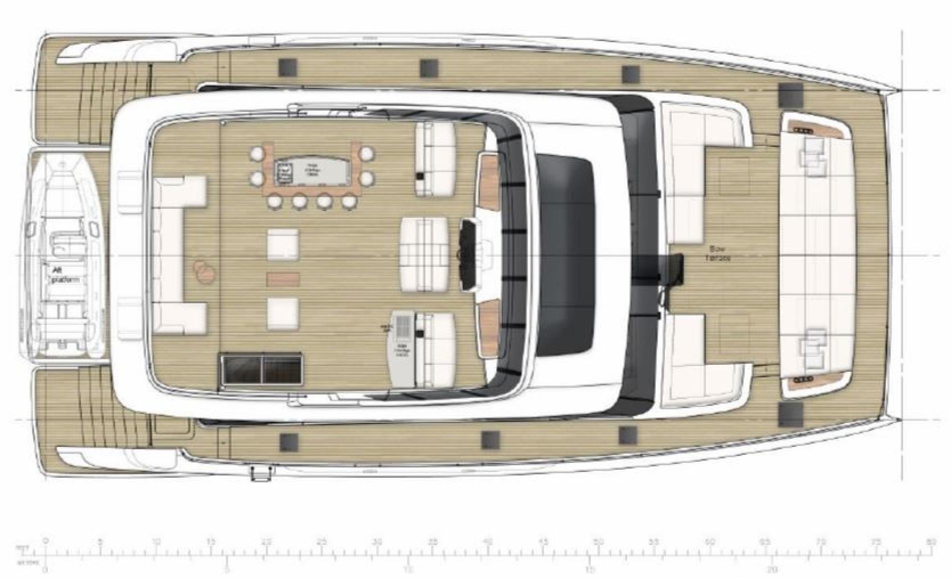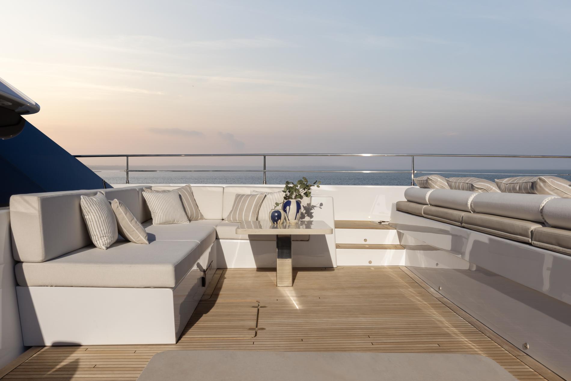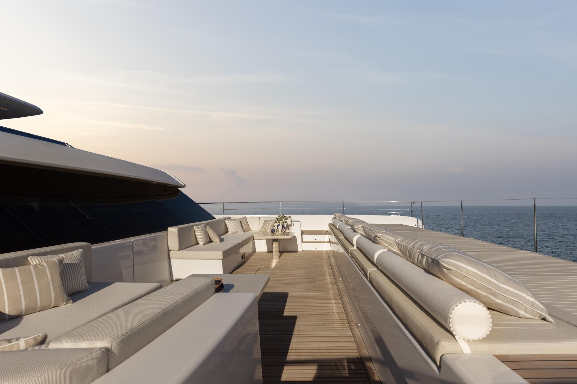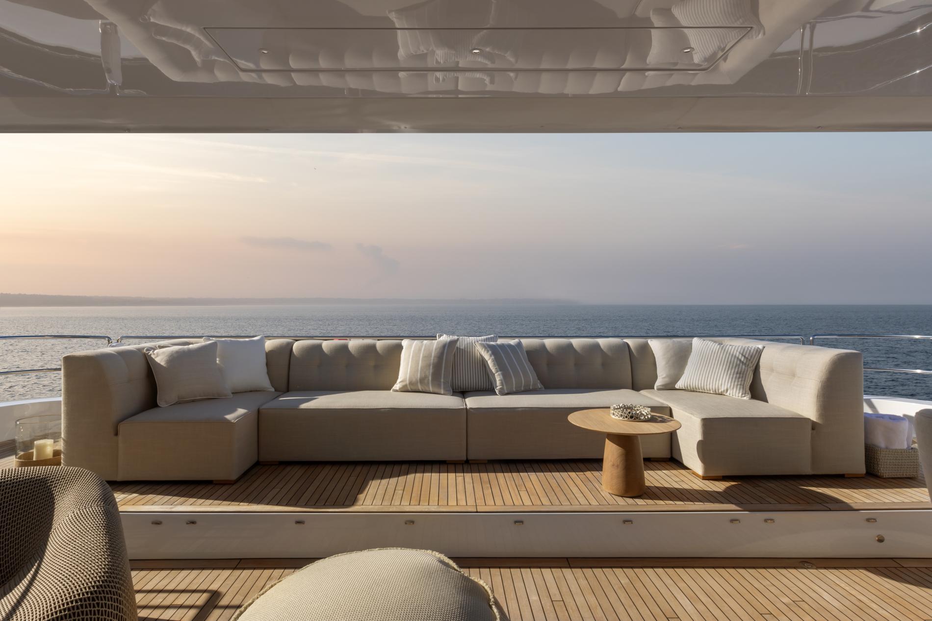 The main deck boasts a bow terrace and sociable aft cockpit. The bow terrace is configured with a choice of seating and a full beam row of sun pads with comfortable cushions. The aft cockpit is an expansive guest space which leads directly into the main salon creating one large entertainment space when the doors are open. The terrace has dining area with a flexible table and seating which can be adjusted from a bench seat to a huge sunpad. Steps on both sides lead down to the water’s edge where there is a substantial hydraulic platform – the perfect stern terrace or swim platform offering easy access to the water.