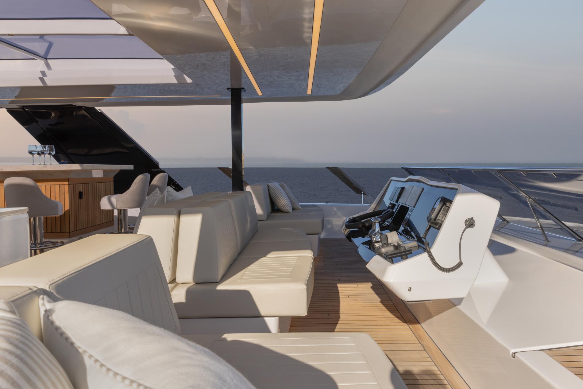 The versatile exterior offers three distinctive sociable zone across the flybridge and main deck. Starting on the flybridge there is a beautiful sun deck with a hard roof creating a shaded terrace furnished with a sit up bar and lounge seating including a sofa and moveable chairs. The helm station is forward with crew and guest seating.
