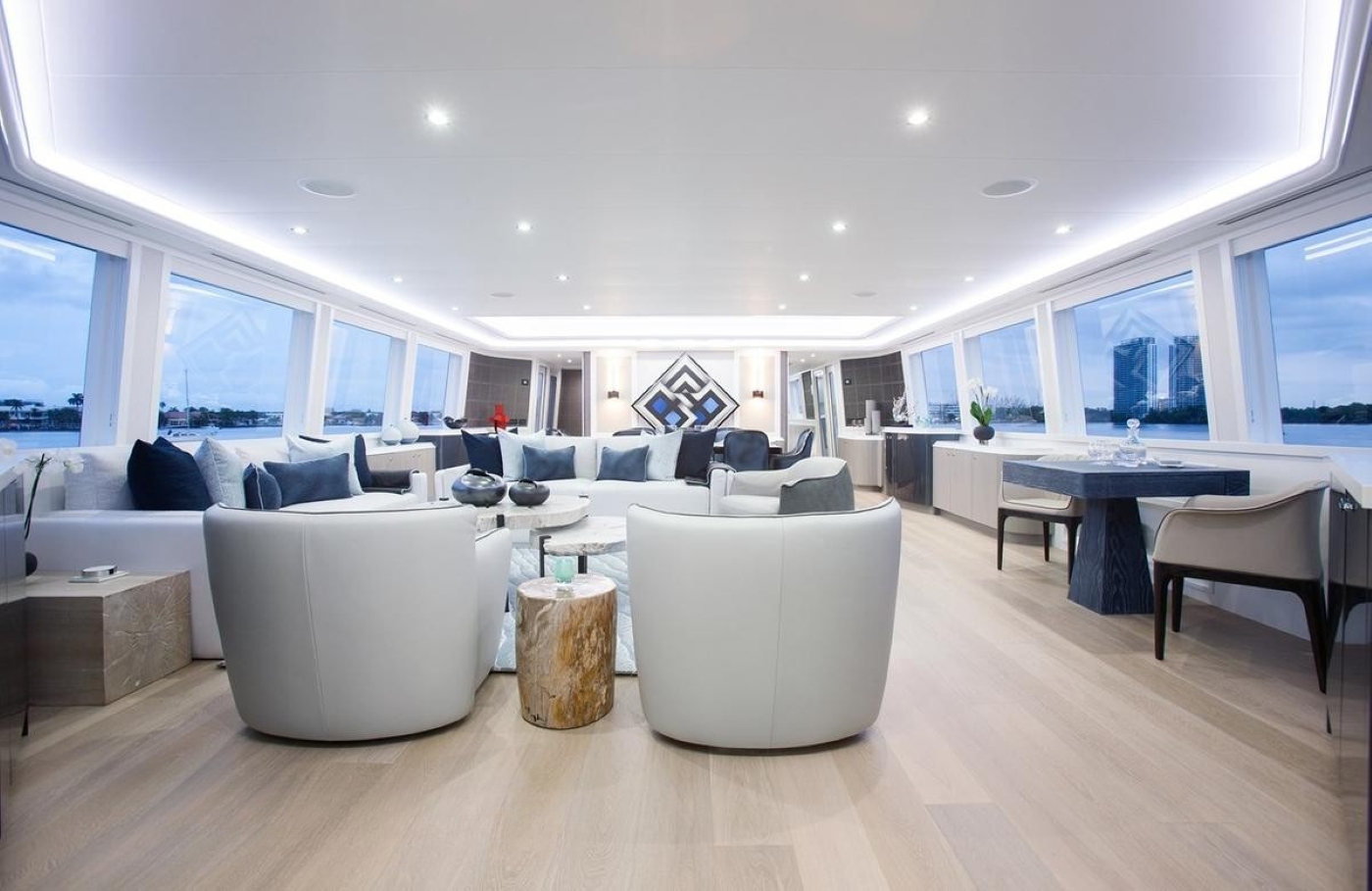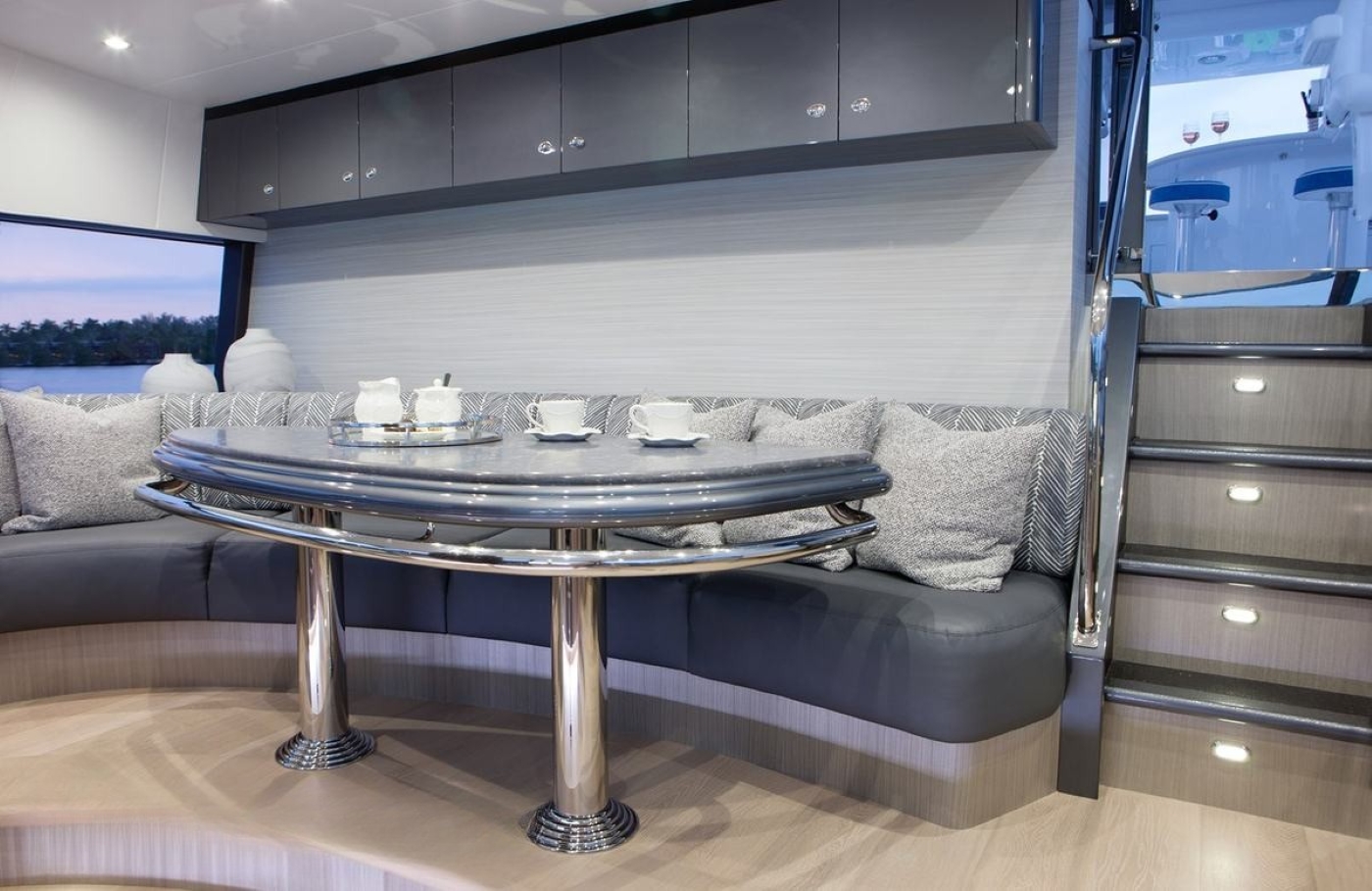 The area amidships and aft on the main deck consists of the formal dining area and salon respectively, combined into one large social area. Eight elegant chairs surround the matching table, while the lounge is laid out with two sofas and three armchairs surrounding a pair of coffee tables. A chess table with doubles as a place for drinks and close conversation is to starboard and is accompanied by two chairs. A 65" widescreen TV on the aft wall offers high-quality entertainment to make the hours fly by during cruising.