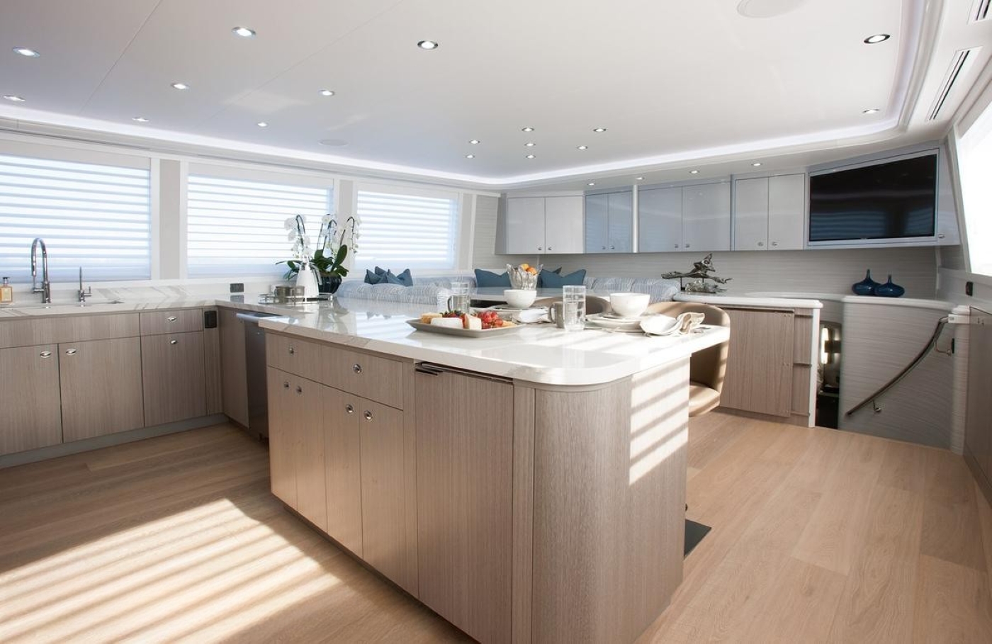 The lower deck hosts the guest and crew accommodation, with room in the stern for storing the water toys. On the main deck, the country kitchen/galley is forward, where a plush J-shaped sofa surrounds a table ideal for breakfast. There is also an island counter for quick meals in smaller groups. A widescreen TV is placed in the corner, keeping the children entertained while the adults plan for the day ahead.