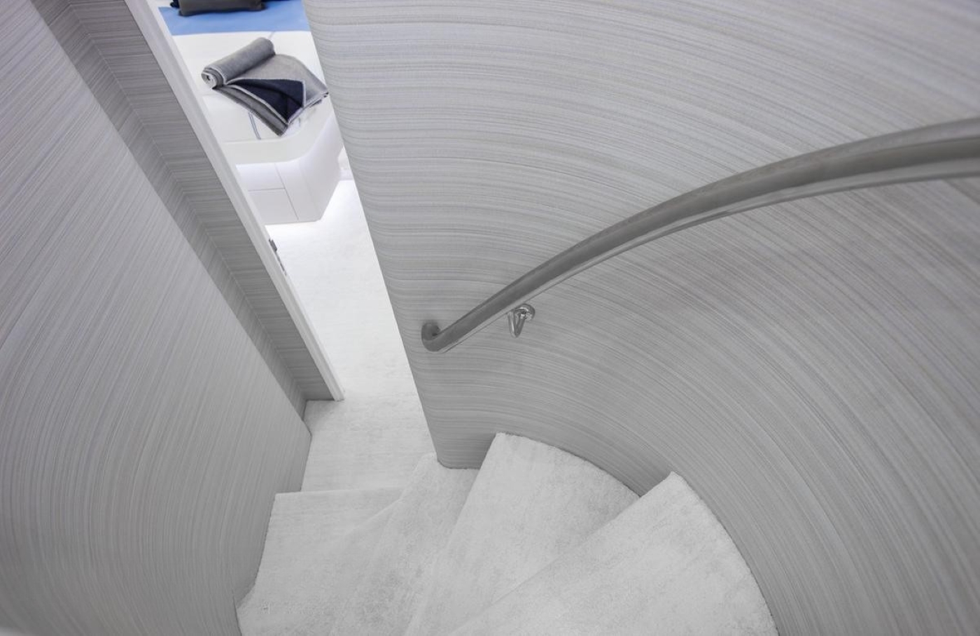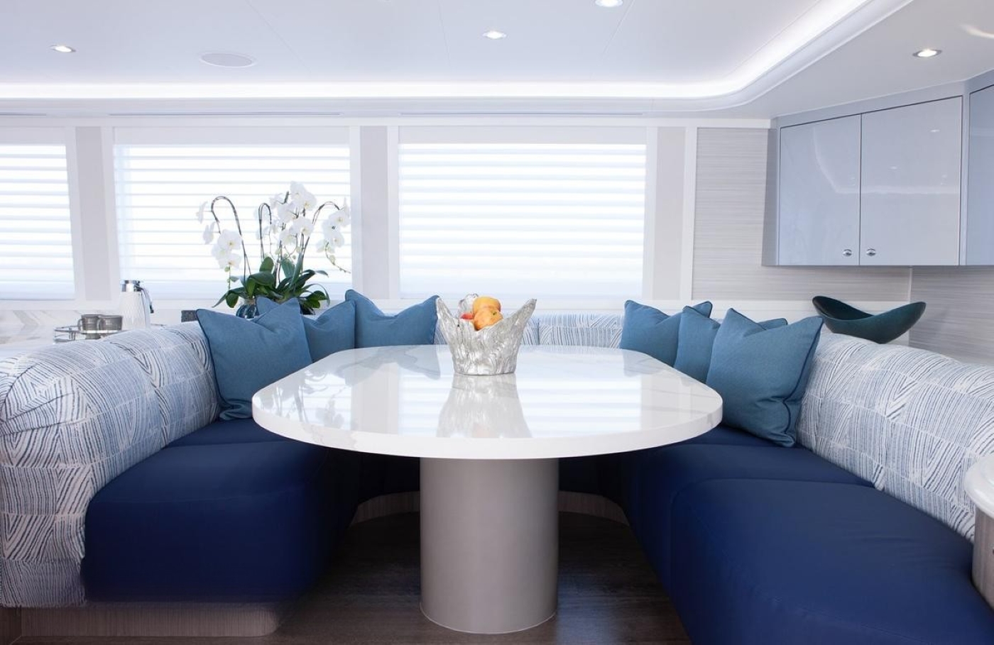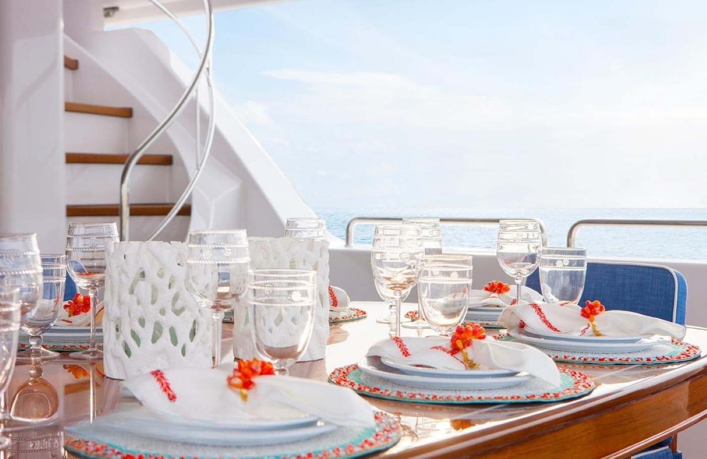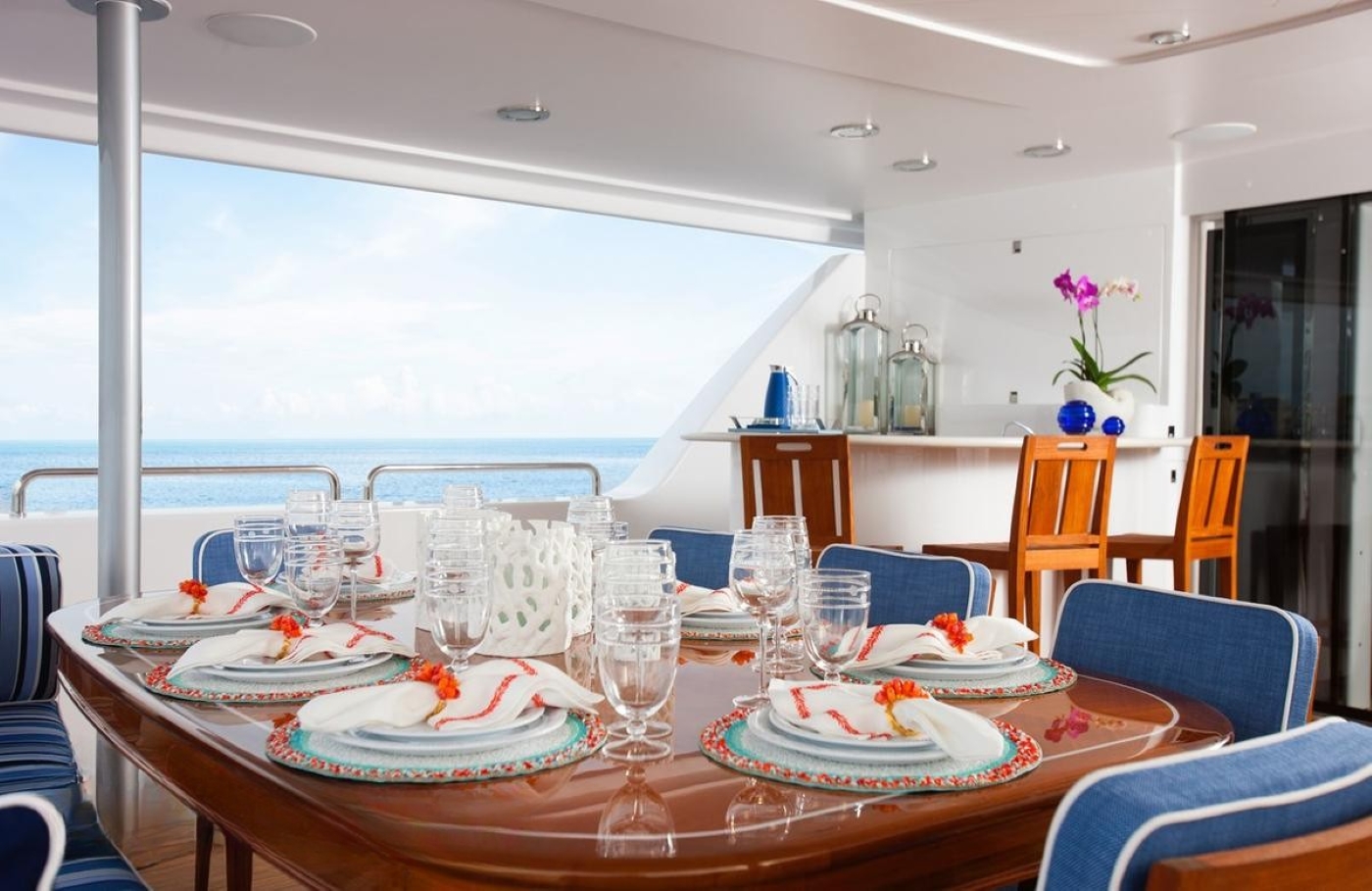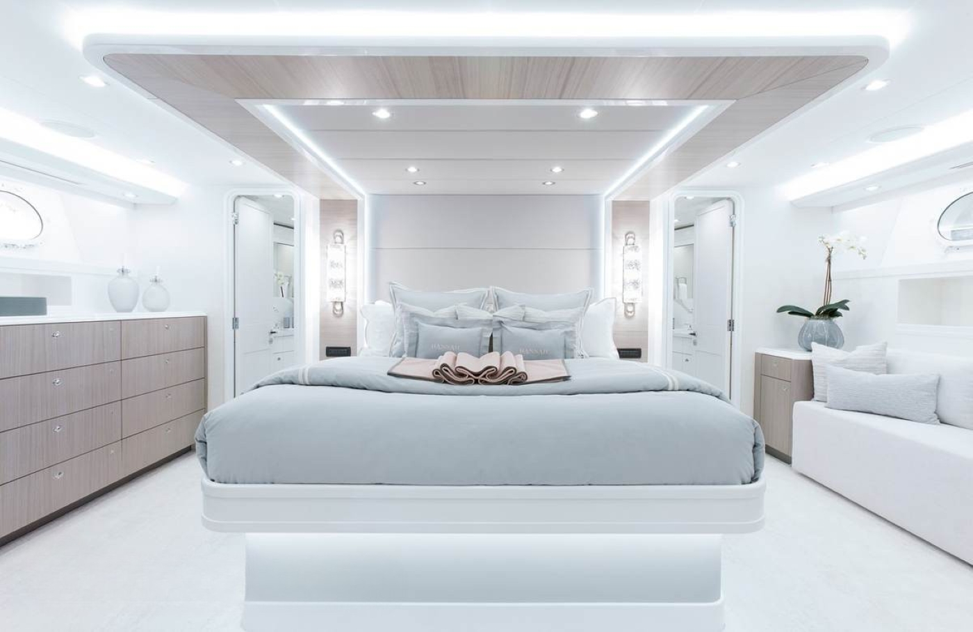 The main deck aft is shaded by the upper deck overhang and provides a place to comfortably dine alfresco on the C-shaped sofa and additional chairs surrounding the large table. A bar is placed in the port corner, and stairways lead down to the swim platform, for access to the tender and water toys. Side walkways take guests around to the foredeck, where there is a circular sofa for the group to enjoy drinks and conversation at sunset, and the sunbeds along the bow make a quiet, secluded place to sunbathe.
