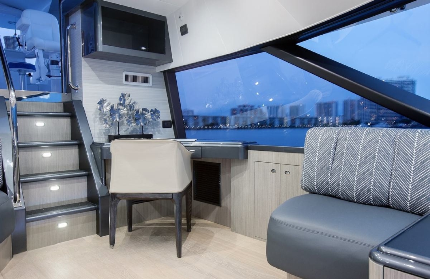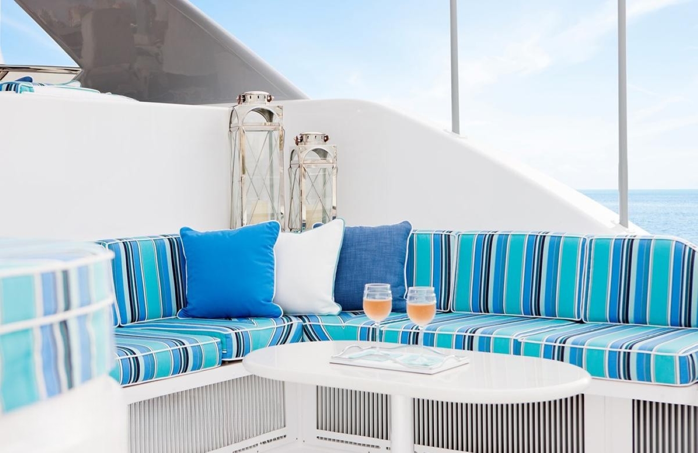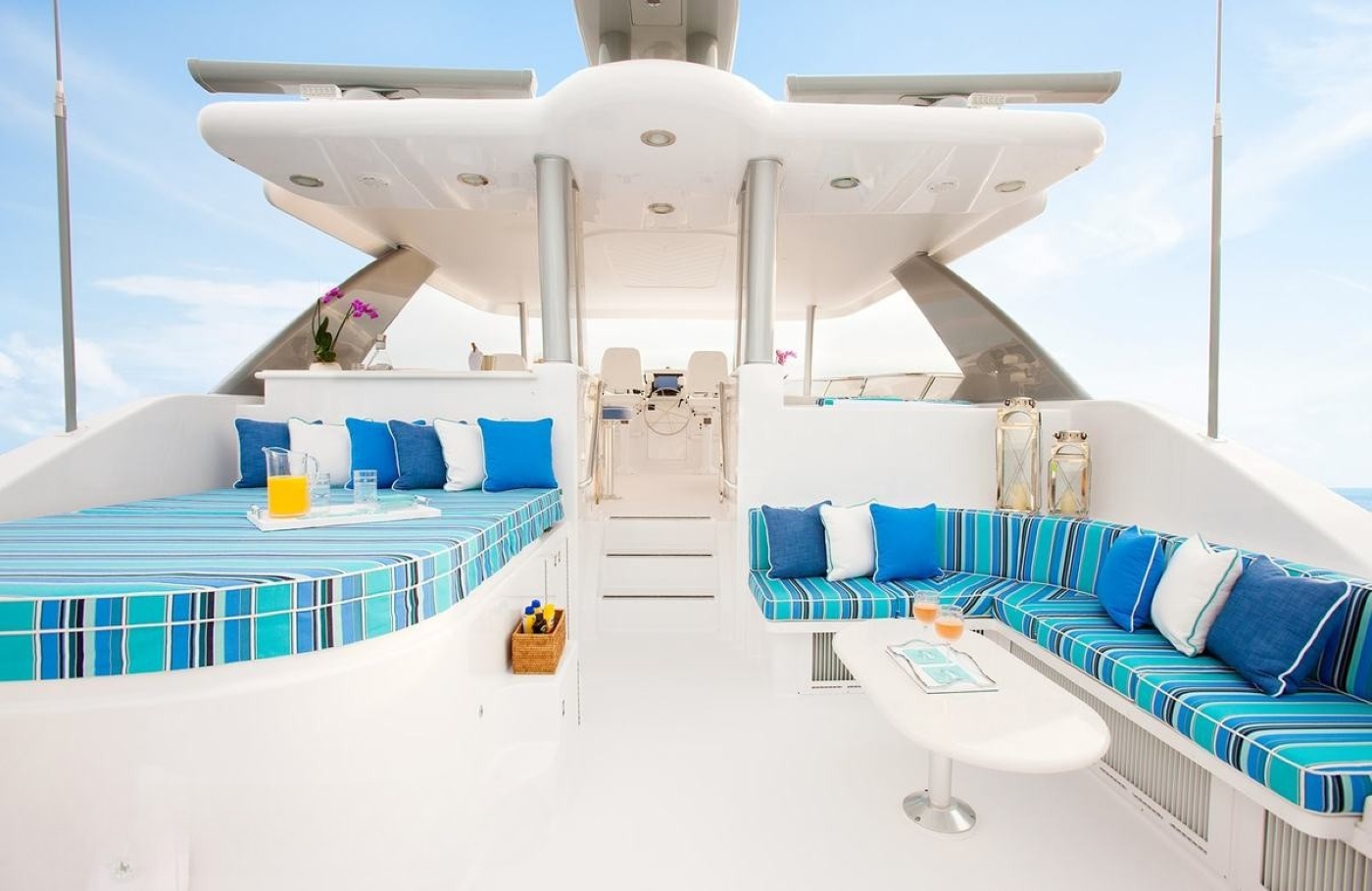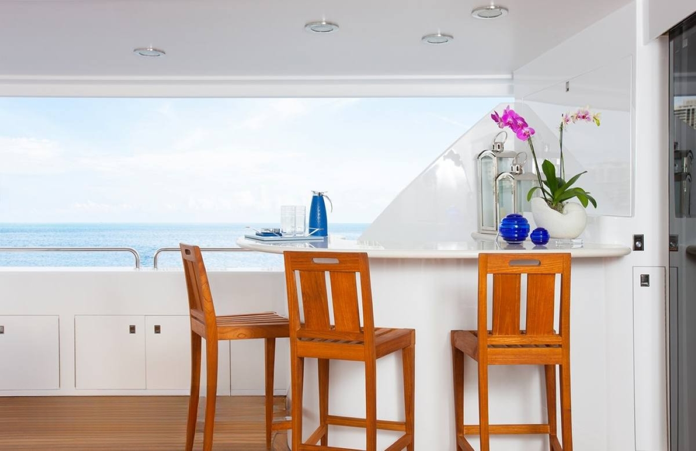 The flybridge above can be accessed through the raised pilothouse, and grants guests commanding views in the fresh sea air. The aft section is used for storing the tender and motorised water toys, which can be launched and retrieved using the Davit crane. The Jacuzzi is amidships to port, and when covered it can be used as an additional sunbed. An L-shaped seating area and coffee table is to starboard, and steps lead up into the shaded forward section where a wet bar is situated to port and another sofa and coffee table to starboard.