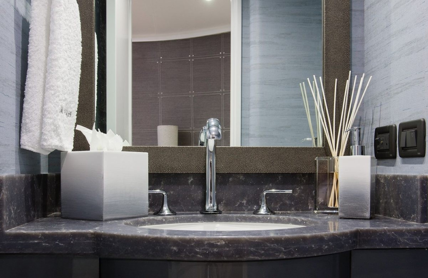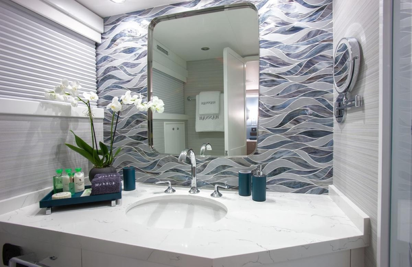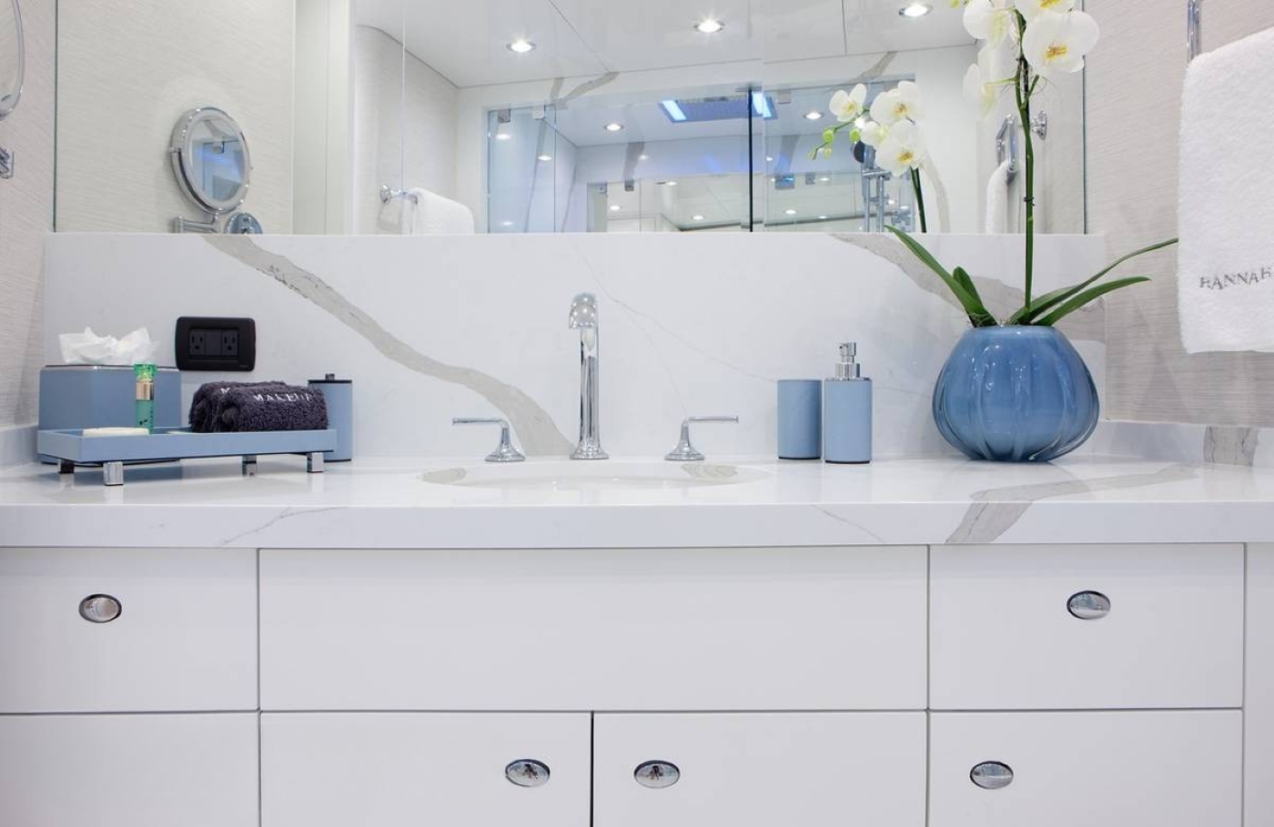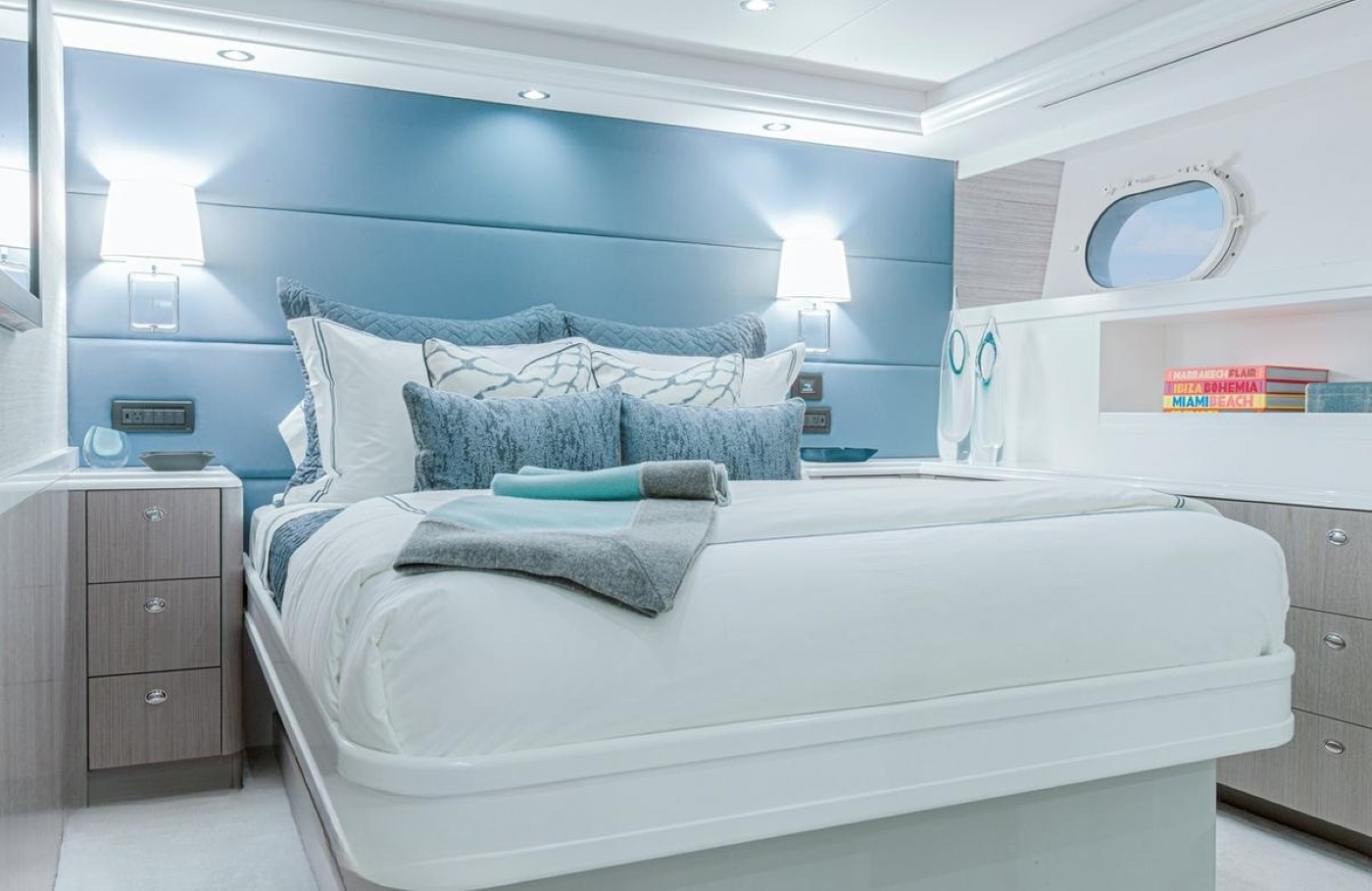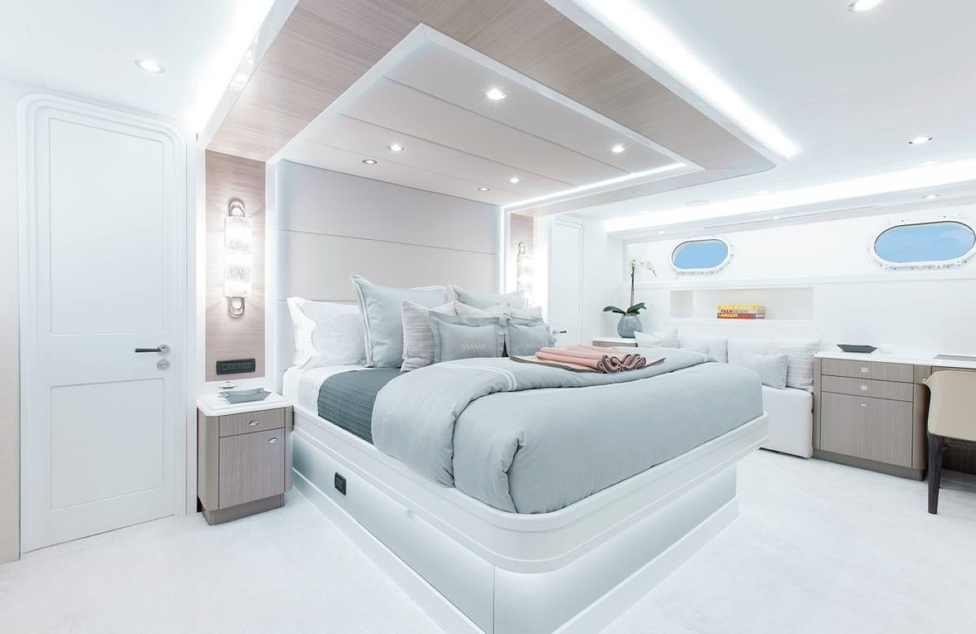 The accommodation sleeps a total of 8-9 guests over 4 en-suite cabins: 1 Master suite, 1 VIP stateroom, 1 double cabin and 1 twin cabin that has a Pullman berth. ~ The Master suite on the lower deck makes use of the full beam to provide a king-sized bed with a widescreen TV mounted on the wall opposite, a desk, a sofa along the one wall and plenty of clothes storage in the closet and drawers on the other side of the room. The en-suite bathroom has his-and-hers entrances, with both providing a sink as well as a toilet and shower. ~ The VIP stateroom is forward on the lower deck and has a queen-sized bed with a widescreen TV opposite, a sofa, closet, and an en-suite bathroom with sink, toilet and shower. ~ The double cabin has a queen-sized bed with a widescreen TV opposite and a closet, plus an en-suite bathroom with a sink, toilet and shower. ~ The twin cabin has two single beds and a Pullman berth suitable for a child, allowing for a 9th guest with the ~ Owner's/Captain's approval. The room also has a widescreen TV, closet and an en-suite bathroom with a sink, toilet and shower. ~ The expert crew of 5 will provide first-class service to everyone on board.