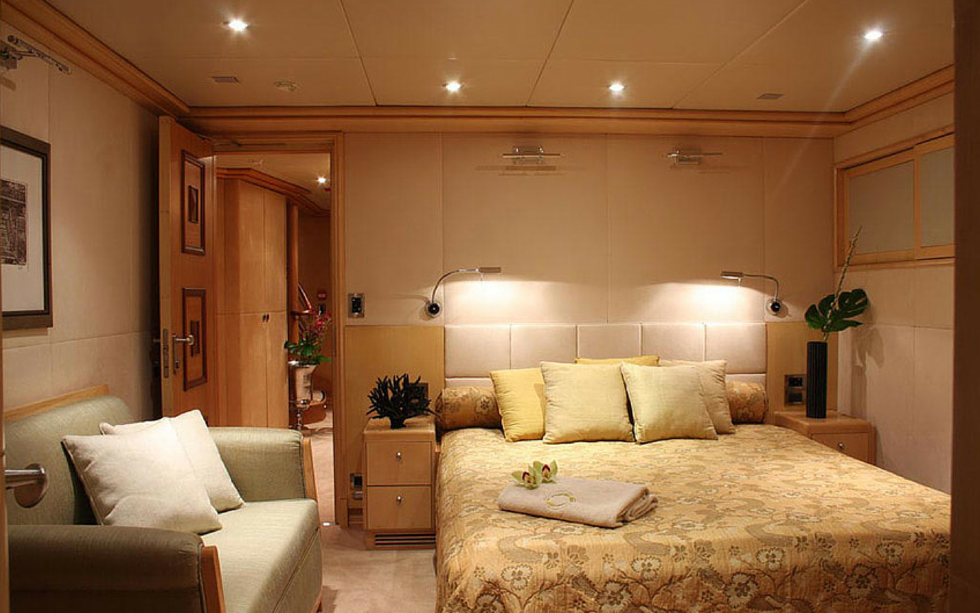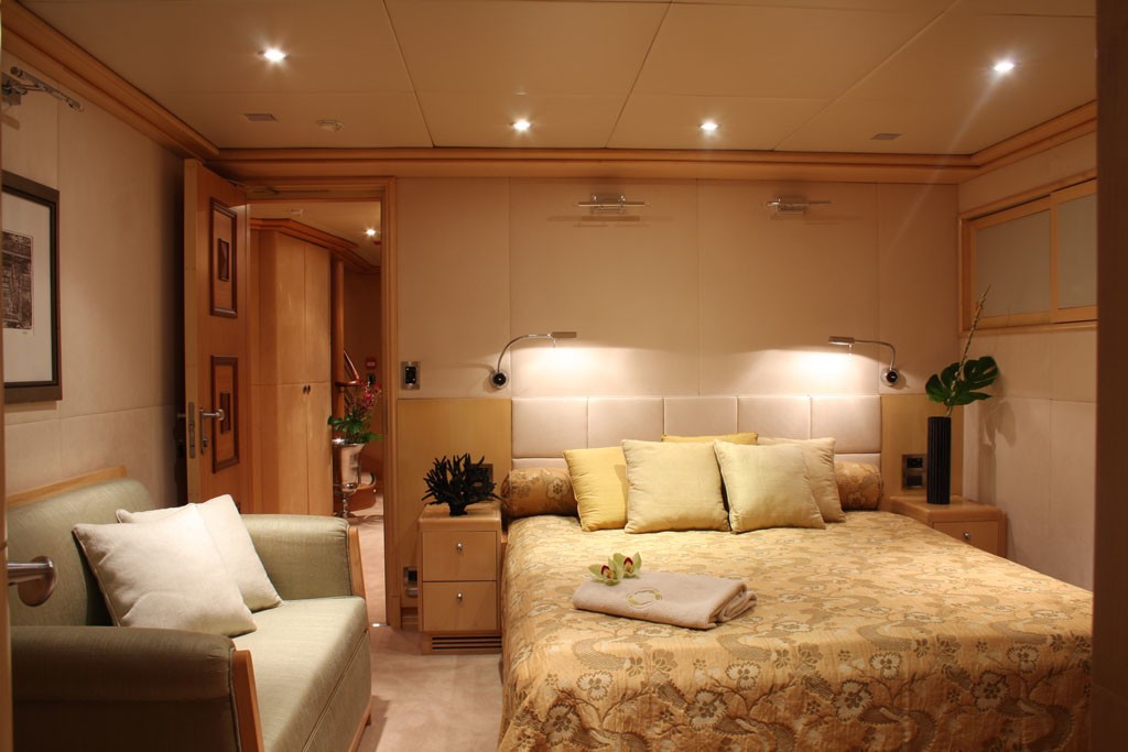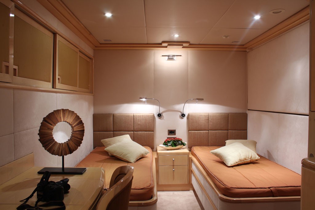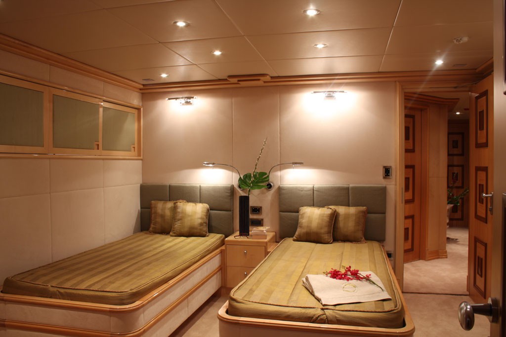 Once below decks, the first cabin is the twin cabin. Here, there are two very comfortable single beds and Pullman berth to accommodate an extra guest. This cabin has Satellite TV, DVD, audio player and air-conditioning. A small night table is situated between them and reading lights above each bed. The en-suite bathroom has one water basin and both a bath-tub and spacious glass case shower. Ample closet space is provided for your wardrobe.