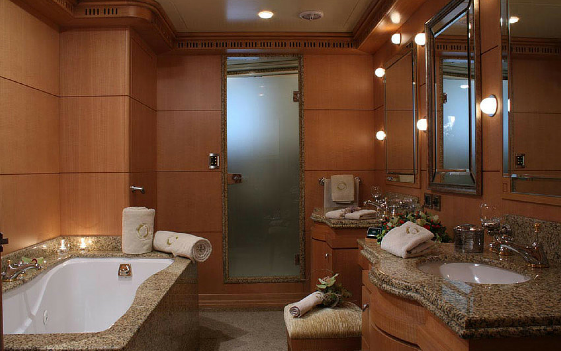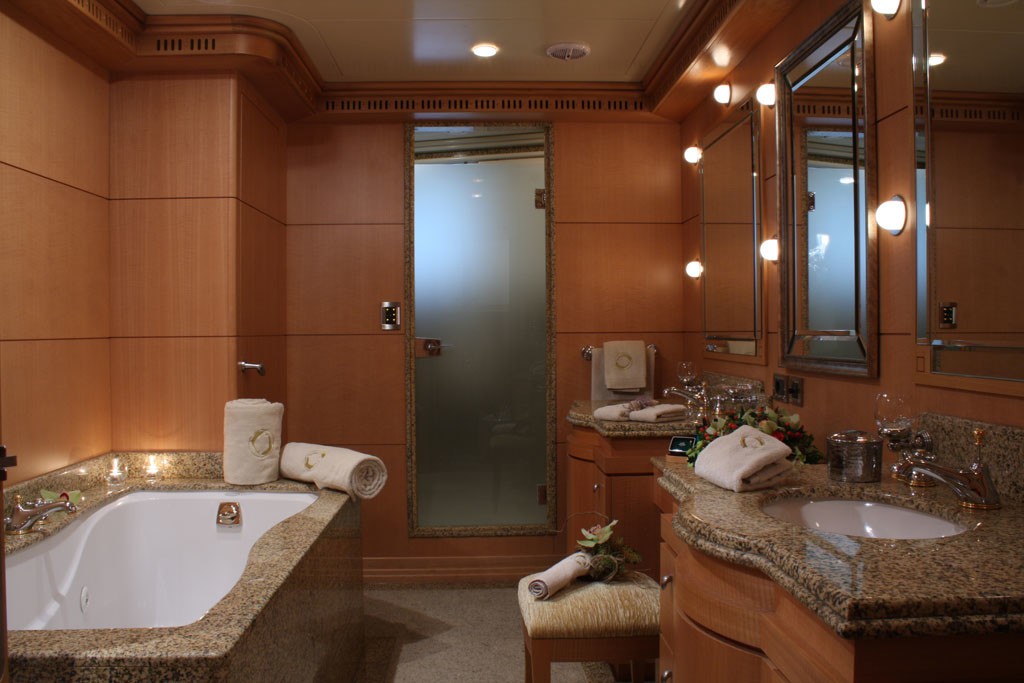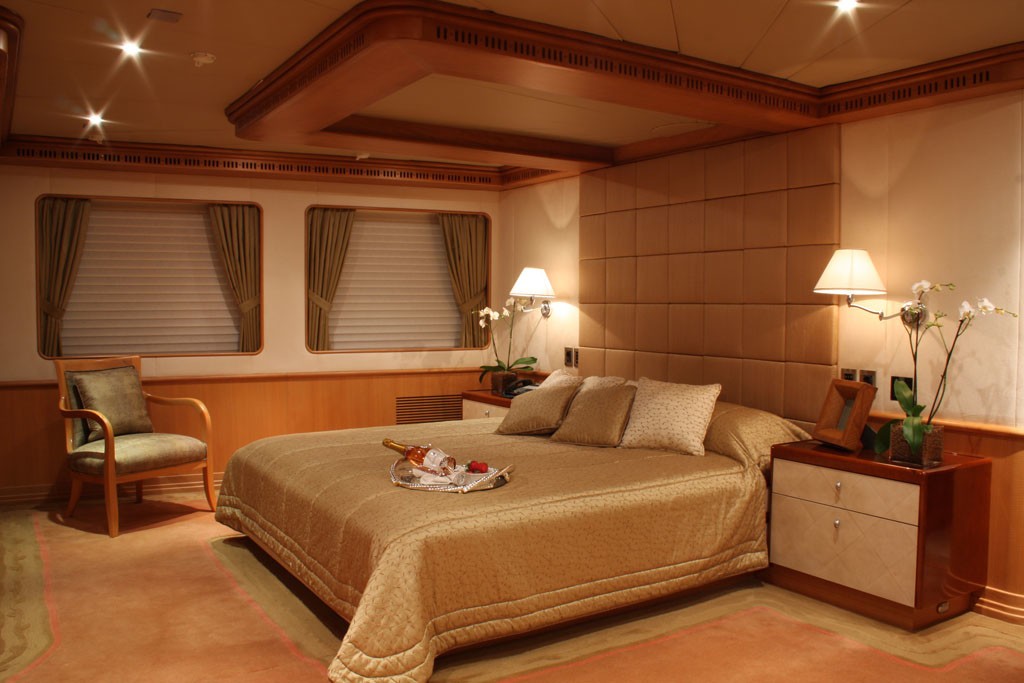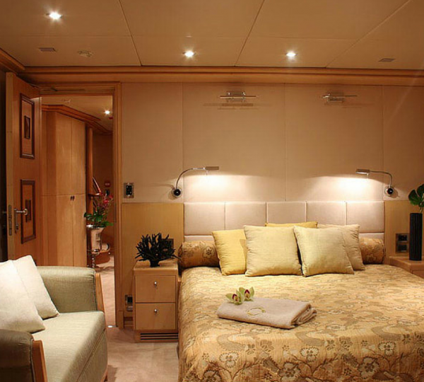 Once below decks, the first cabin is the twin cabin. Here, there are two very comfortable single beds and Pullman berth to accommodate an extra guest. This cabin has Satellite TV, DVD, audio player and air-conditioning. A small night table is situated between them and reading lights above each bed. The en-suite bathroom has one water basin and both a bath-tub and spacious glass case shower. Ample closet space is provided for your wardrobe.