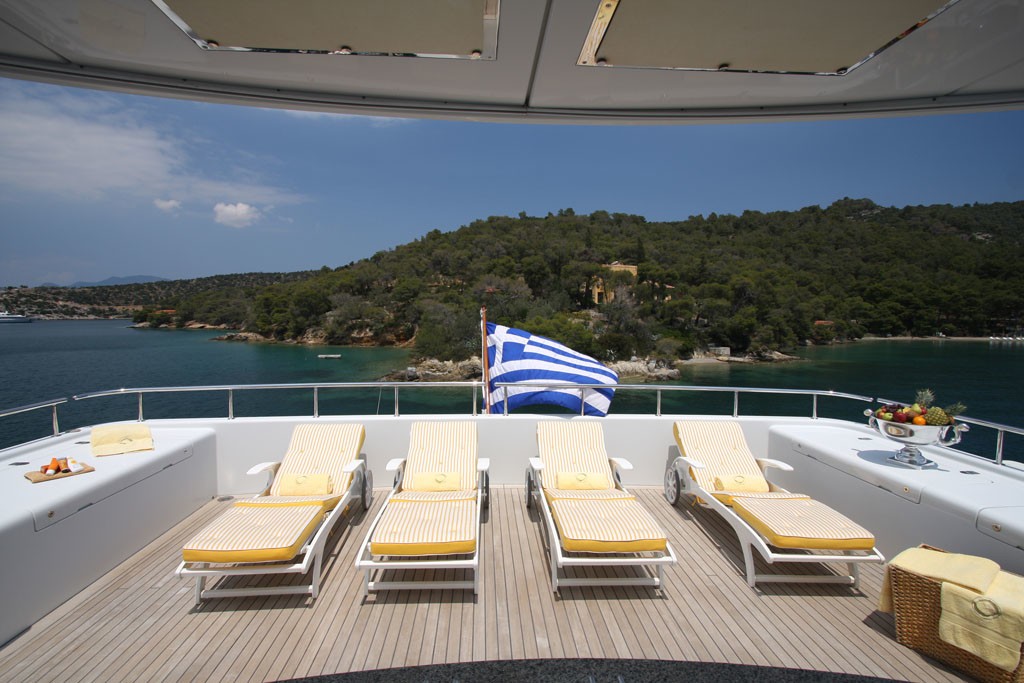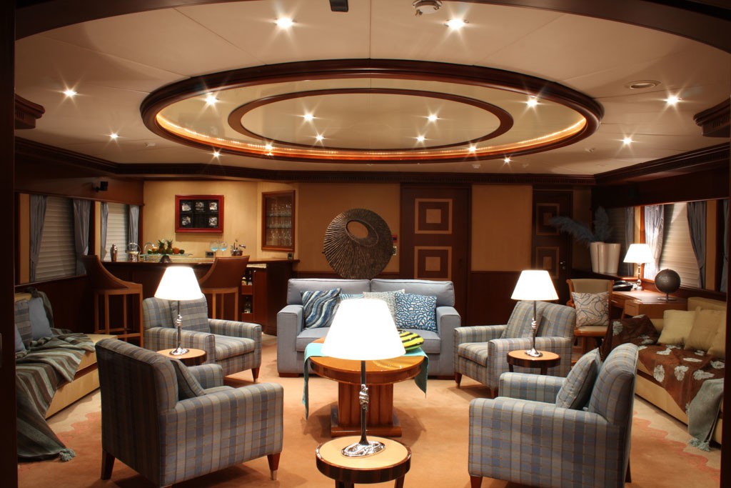 Above the main deck, there is a sky lounge which has a flat screen TV’s at both sides, DVD player, VCR and HIFI Audio System. There is also a bar at the back as well as a guest bathroom with a shower. The seating arrangement is similar to the main salons, but the sofas are not just sofas, but sofa beds. In front of the SKYLOUNGE, you will find the bridge.