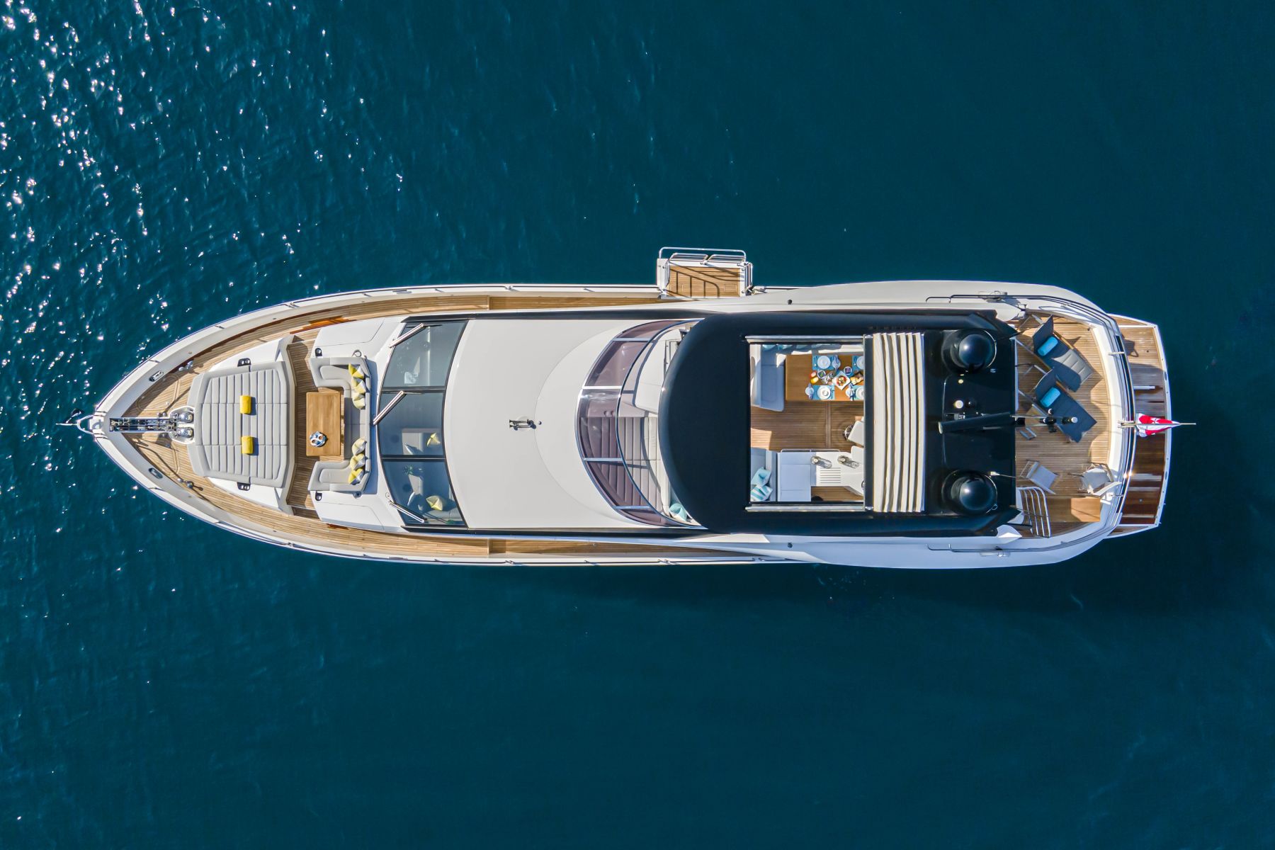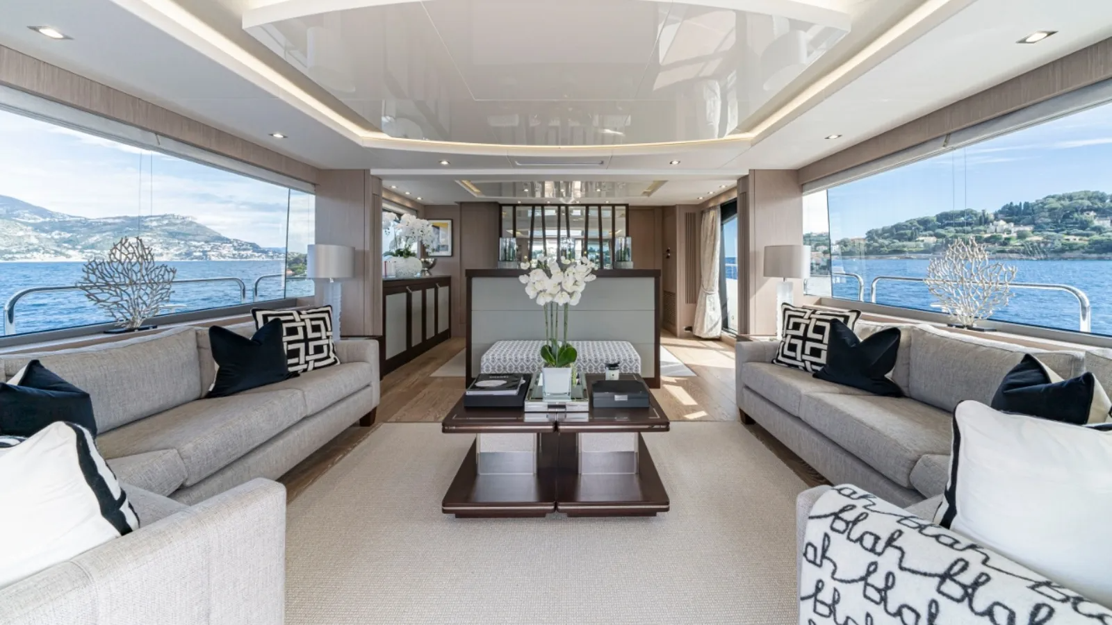 The main deck salon features and open plan living and dining area, with large windows encompassing the space and drenching it in sunlight. The amidships formal dining area features a large table, big enough to seat all 8 guests with ease. Space is maximized with the use of sliding doors leading out to the side walkway, giving the space a wonderful indoor-outdoor flow. Aft is the main living area, with a variety of comfortable couches and convenient coffee tables.