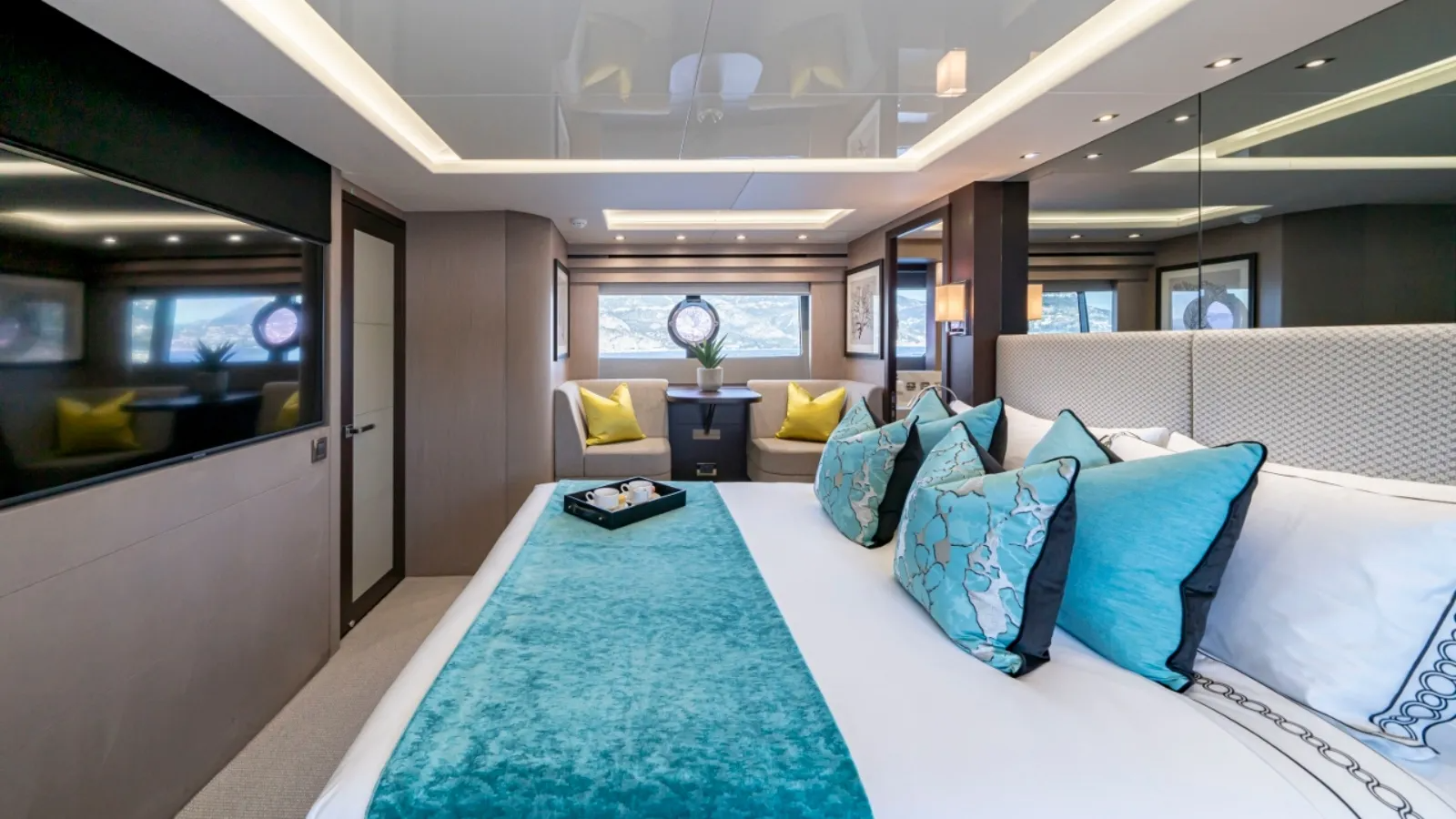The accommodation is for 8 guests across 4 cabins, which consist of: 1 Master cabin, 1 VIP cabins, and 2 twin cabins. The beautiful, full-beam Master cabin is incredibly spacious, and features a king-sized bed, TV, desk and seating areas, walk-in wardrobe, and its own en-suite. The en-suite bathroom features a large shower, sink and toilet. The VIP cabin sits forward at the bow, and has plenty of natural light thanks to the windows and overhead skylight. There is a king bed, plenty of storage, and an en-suite bathroom with shower. The remaining 2 cabins are both twin, conveniently allowing for a variety of family and friend group sizes. Both twin cabins have TVs, storage, and their own en-suites. A professional crew of 4 will provide 5 star service for guests during their stay.