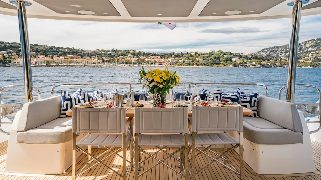 Beneath on the main deck is another sofa area, which is sheltered by the overhang of the upper deck. On either side of the deck are stairwells leading down to the swimming platform, providing easy access to the ocean and watertoys.