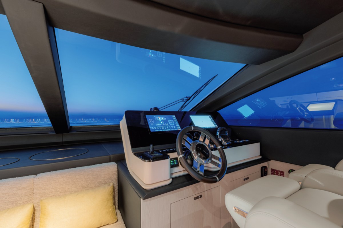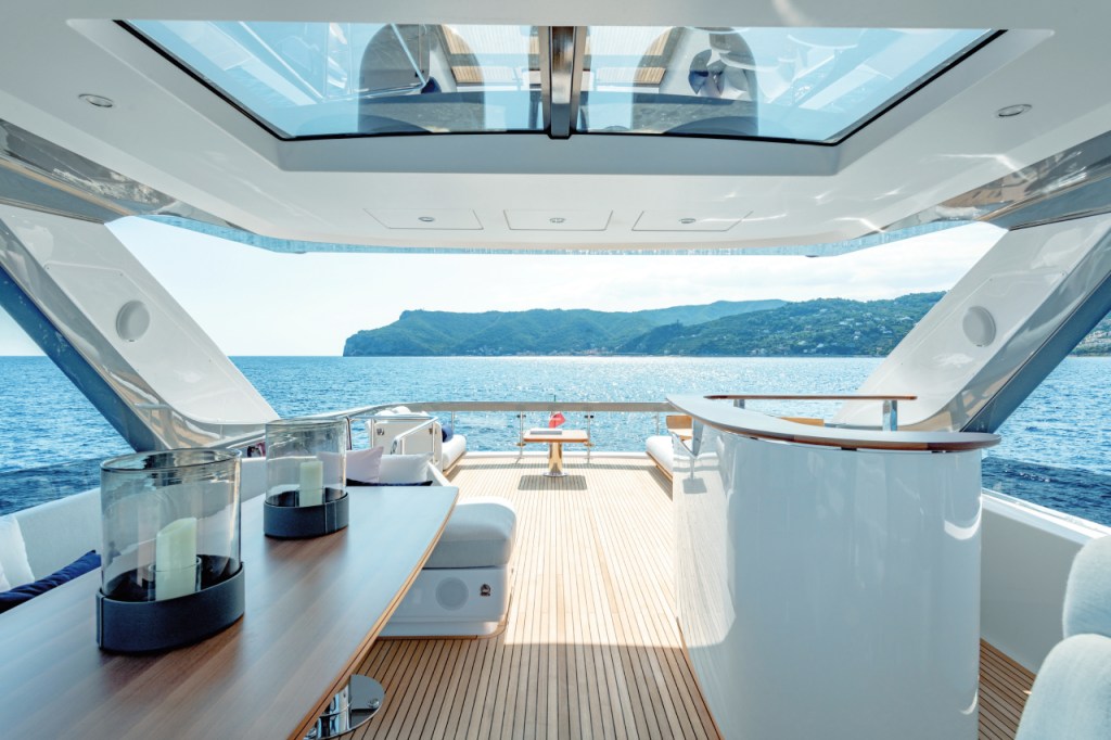 The flybridge is accessed via a starboard stairway from the main deck aft and comes with sun loungers along the stern, and a wet bar amidships to port and a C-shaped sofa and alfresco dining table amidships to starboard beneath the glass-panelled hardtop. The helm controls are forward to port, and a sunbed to starboard.