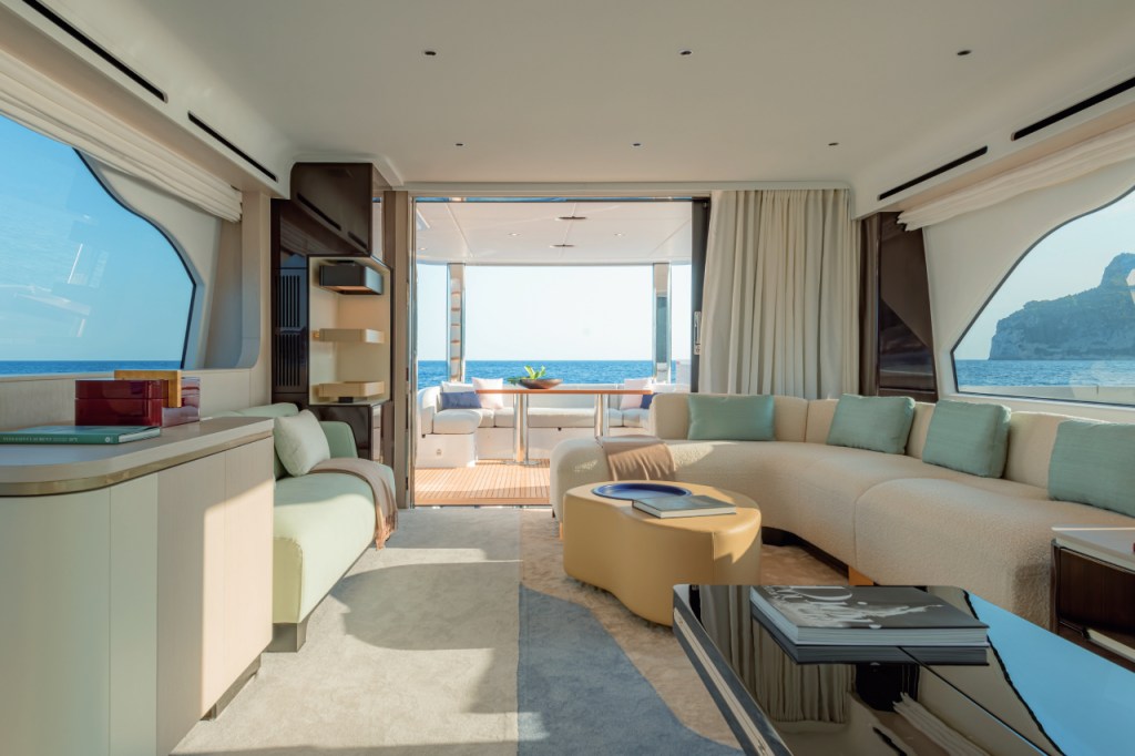 The guest accommodation stairway leads up to the main deck salon, while the crew stairway emerges beside the forward port galley and starboard helm station. A plush sofa and raised table close to the galley provides a casual place for a couple to have breakfast surrounded by bright sunshine. The lounge also enjoys an abundance of light thanks to the long windows down both sides of the interior.
