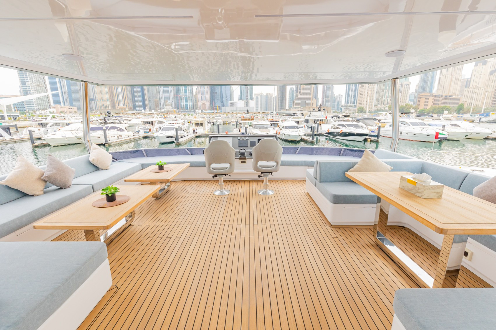 This wide beamed - 18.00 m (59' 1") – catamaran offers plenty of exterior deck space including a spacious sun deck. The deck includes two u-shaped seating areas, one with a dining table and the other with two coffee tables and both are sheltered by the hard roof.