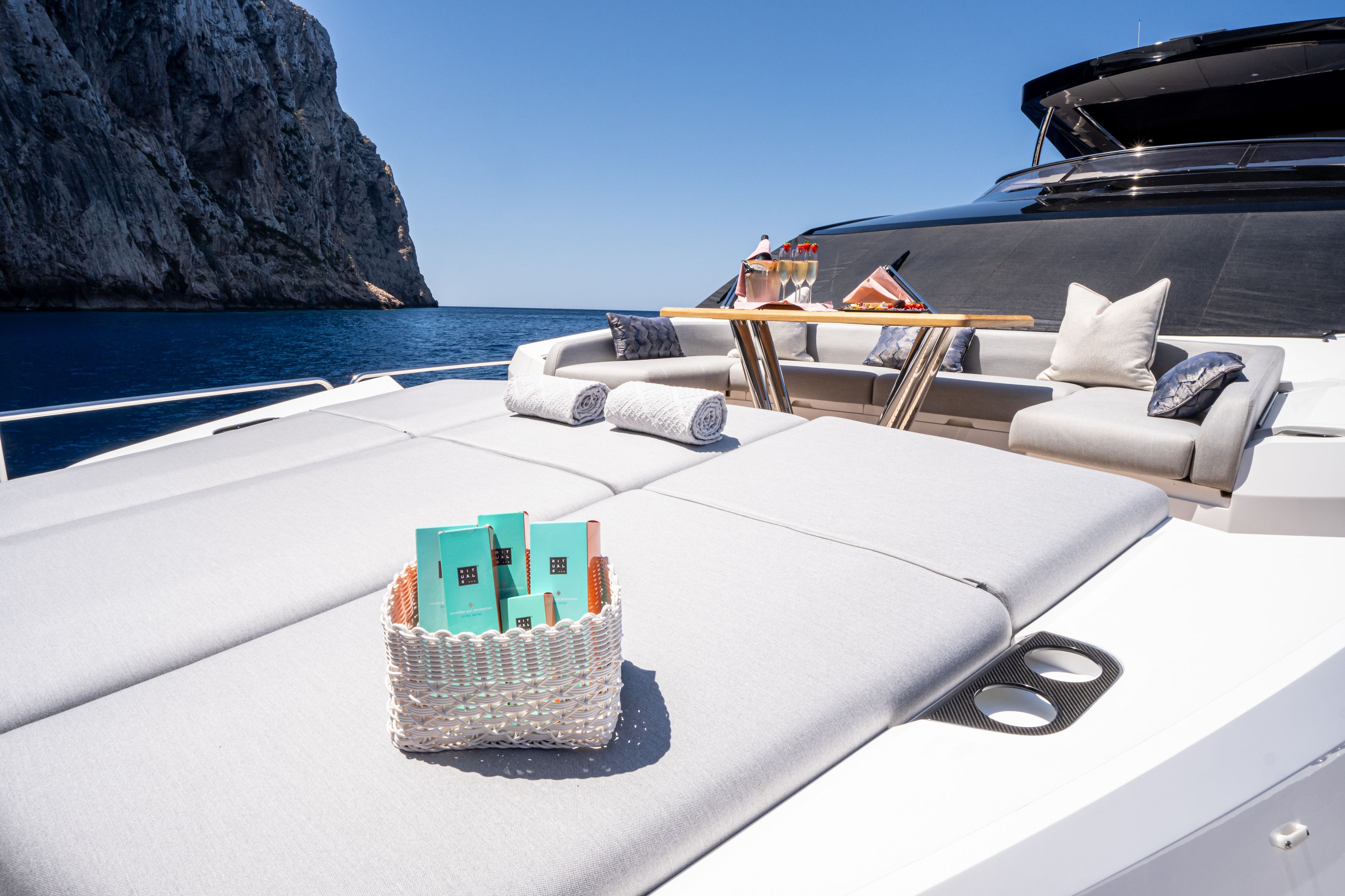 The spacious flybridge is another haven for entertaining, boasting abundant seating covered by a retractable awning, alongside a large dining table and a large sunpad, with room for additional sun loungers.