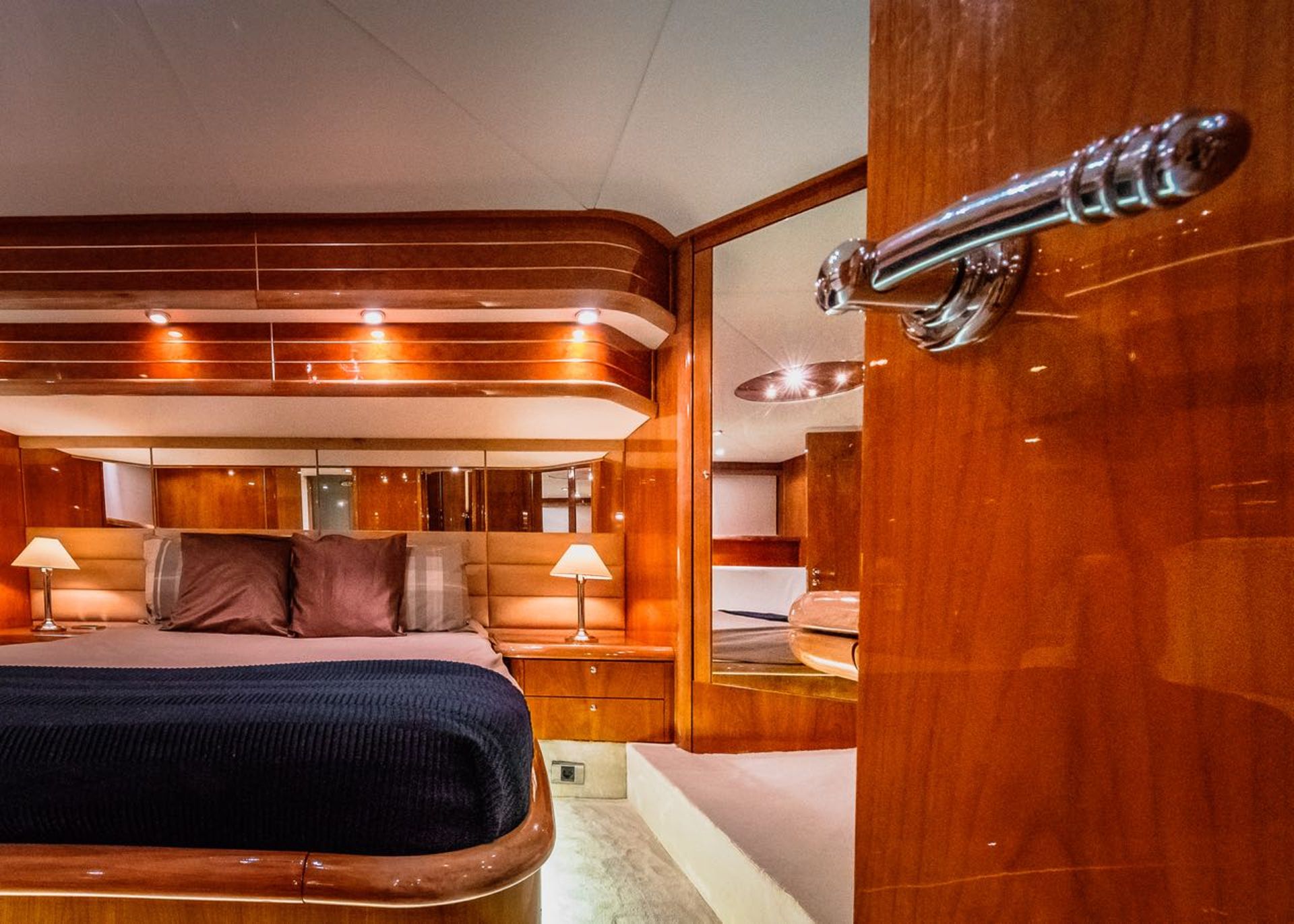 The accommodation sleeps a maximum of 7 guests over 3 en-suite cabins: 1 Master suite, 1 VIP stateroom and 1 twin cabin with an additional berth. ~ The Master suite is placed amidships to make use of the full beam. Within, there is a double bed, plenty of wardrobe space, a desk/vanity and an en-suite bathroom with a toilet, sink and shower. ~ The VIP stateroom is placed within the bow and also comes with plenty of wardrobe space and an en-suite bathroom with a toilet, sink and shower. ~ The twin cabin has an additional fixed berth, storage and a bathroom with a toilet, sink and shower. ~ The professional crew of 3 will provide fast and discreet service throughout every journey.