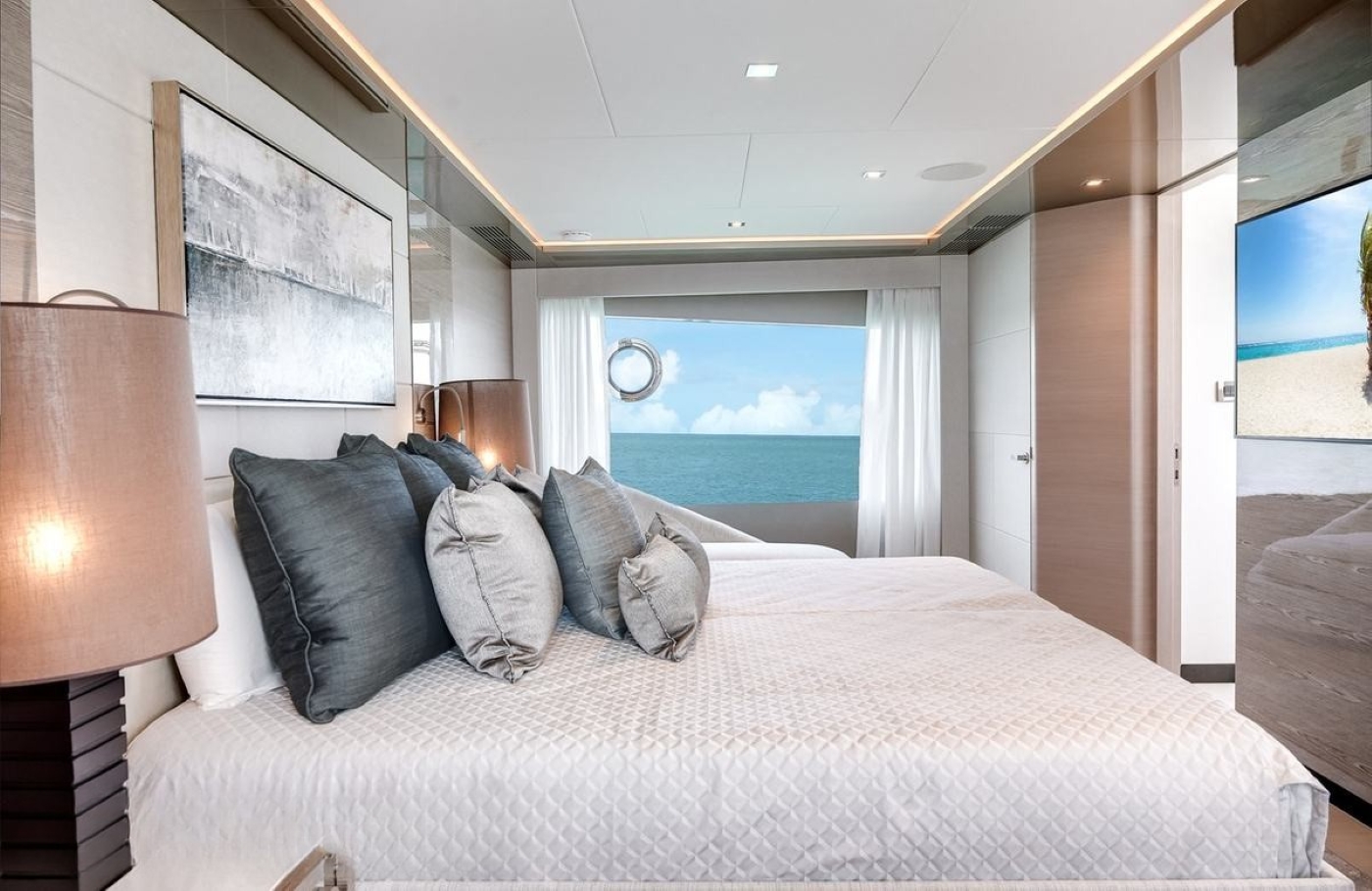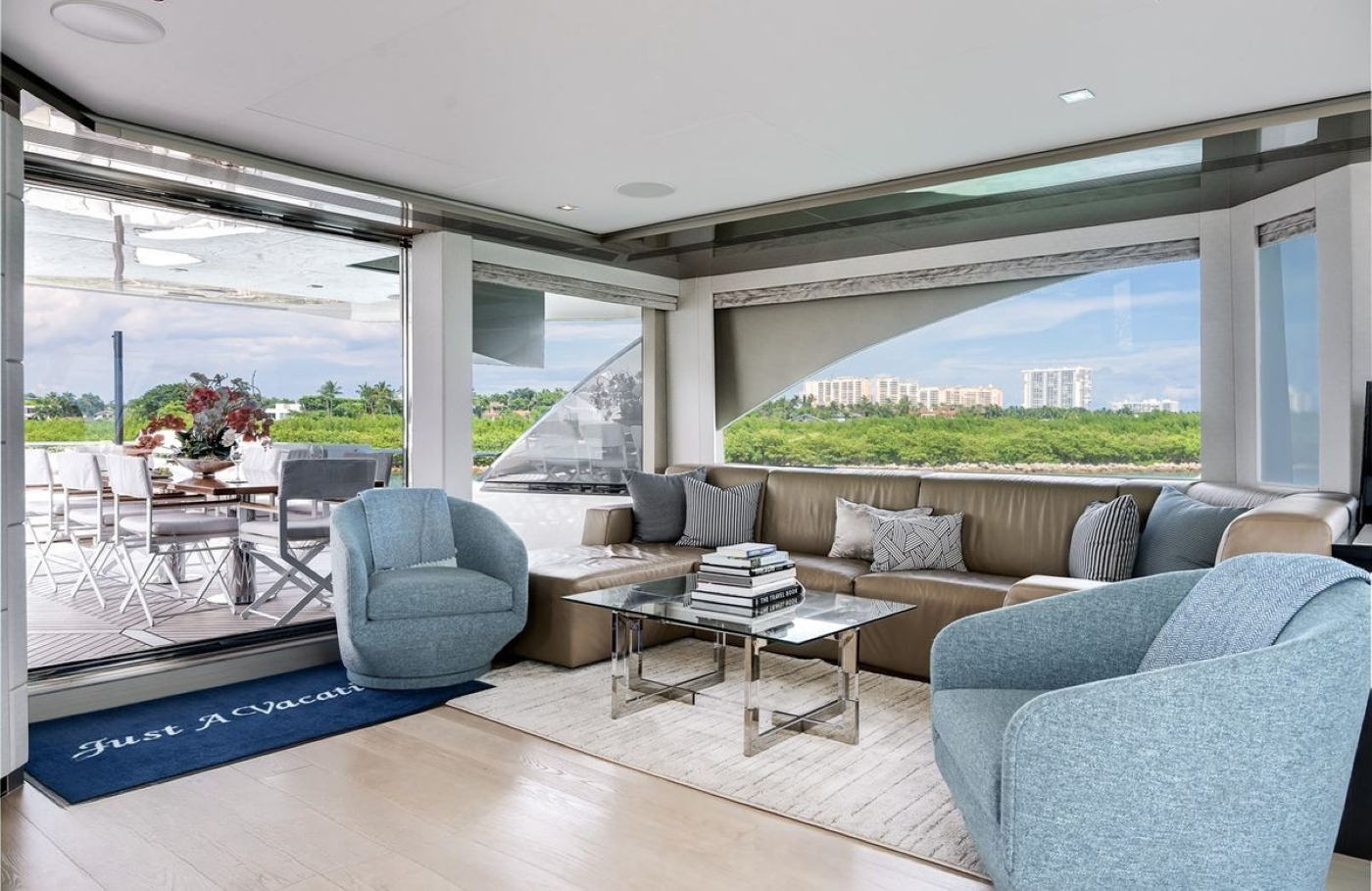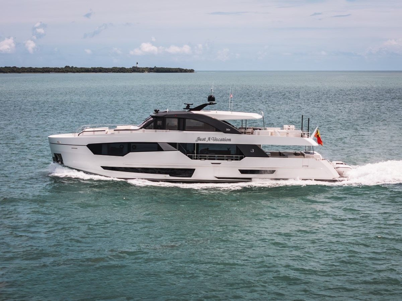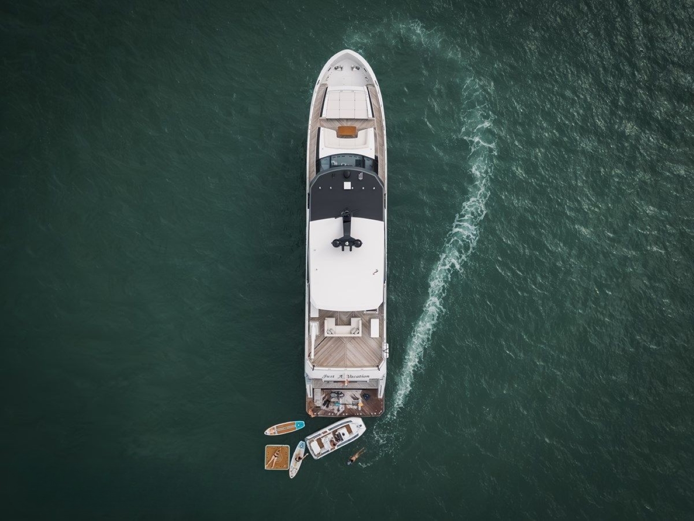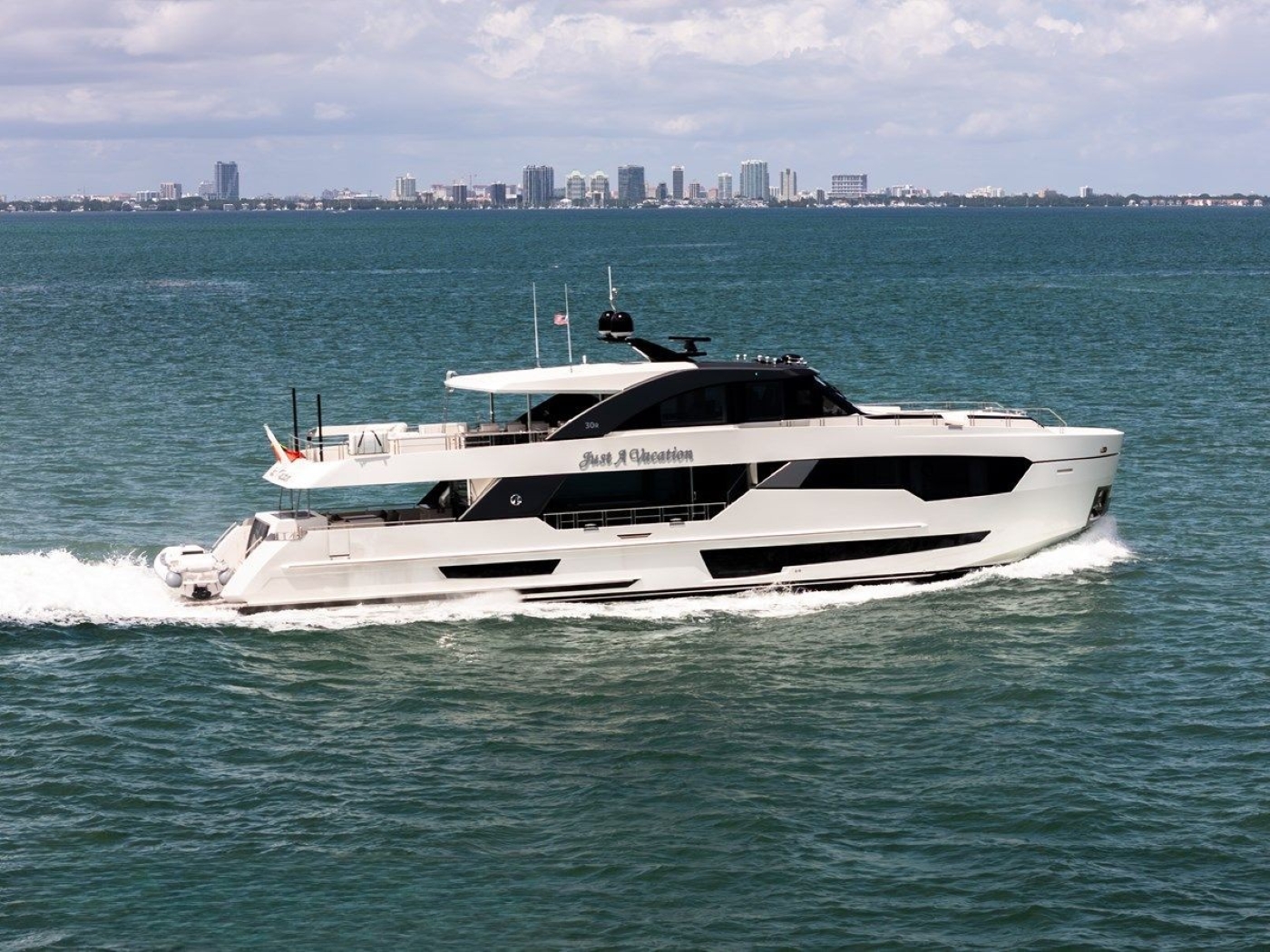 NOTABLE FEATURES OF JUST A VACATION: ~Generous al fresco spaces ~Beach club with skylight ~Large sky lounge ~Main deck master suite ~Wide variety of water toys ~At anchor and underway stabilisers ~Air conditioning ~WiFi