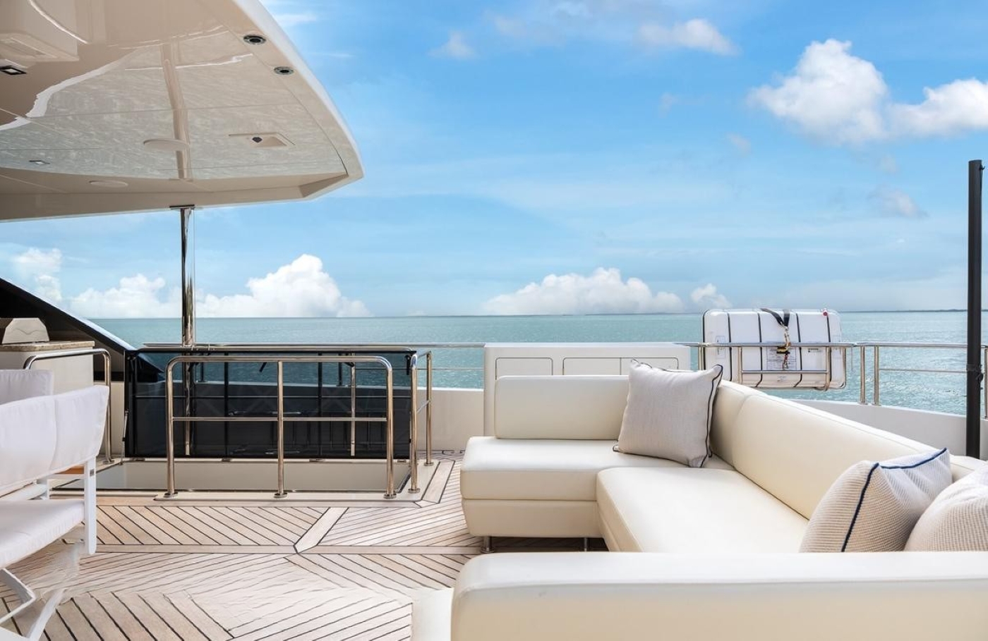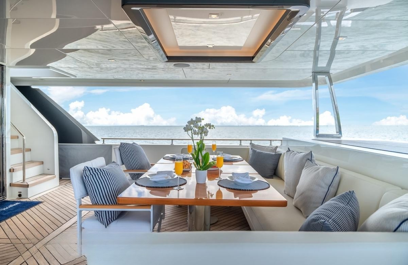 The yacht’s contemporary profile makes the most of both the bow and stern deck areas and offers plenty of al fresco entertainment and relaxation space. Starting on the bow, there is a u-shaped seating area with a flexible table and a wide expanse of built-in sun pads – wonderful for soaking up the sun and making the most of the views.