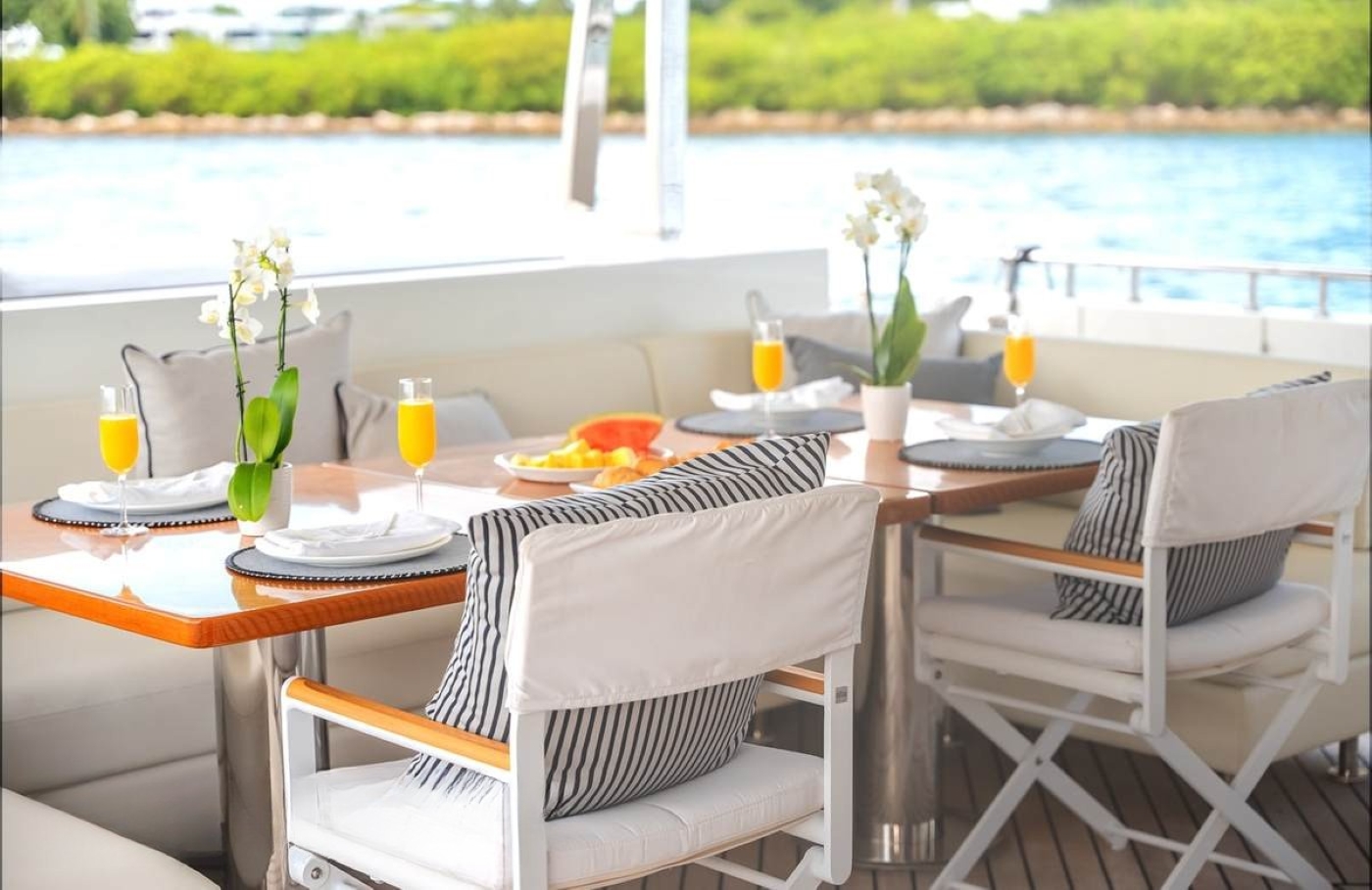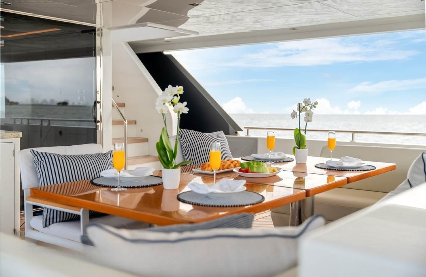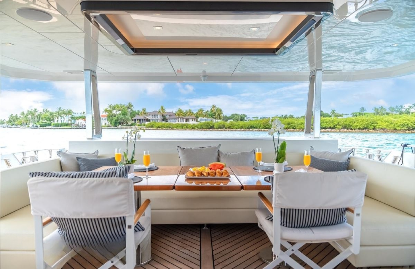 The main deck features another dining setting with a u-shaped sofa wrapping around an adjustable up/down table – additional moveable chairs offer additional seating. Steps on either side lead down to the waters edge swim platform with doors into the beach club.