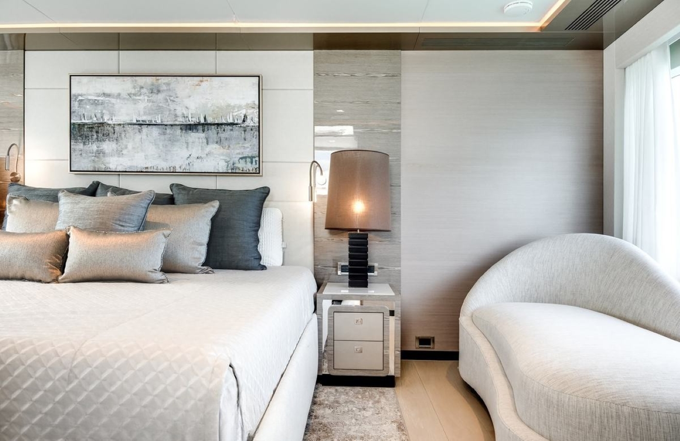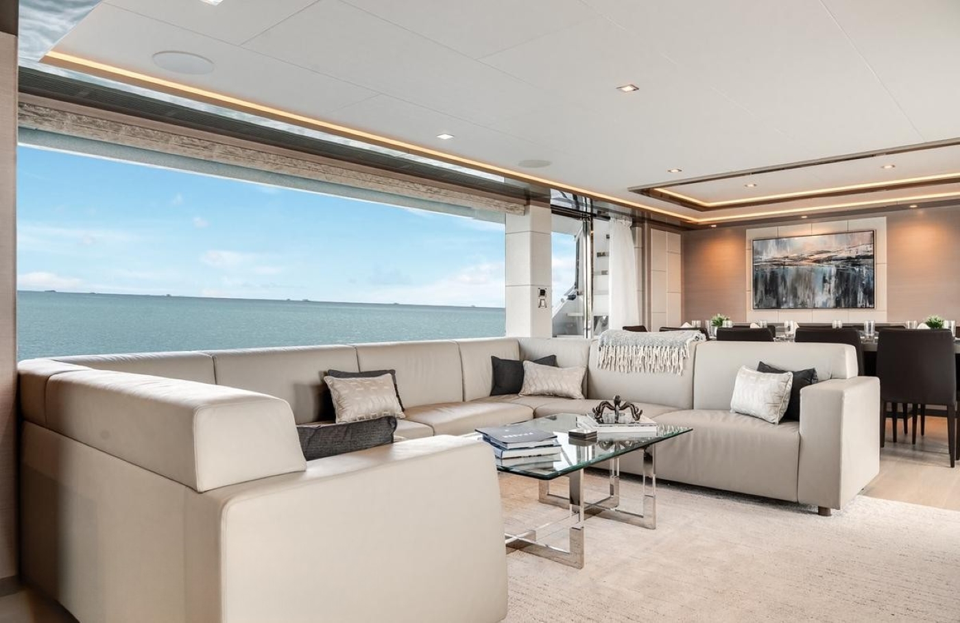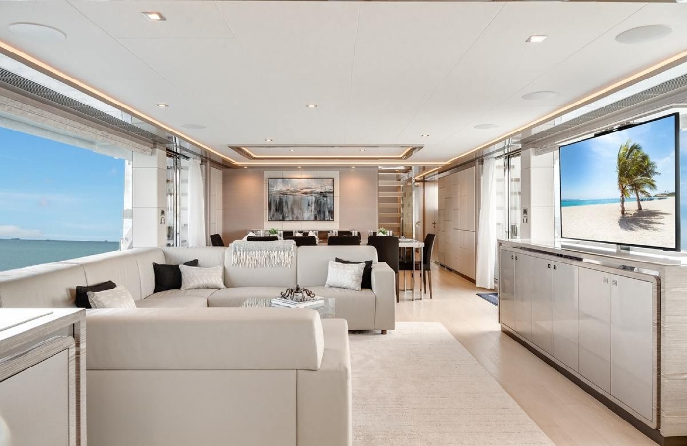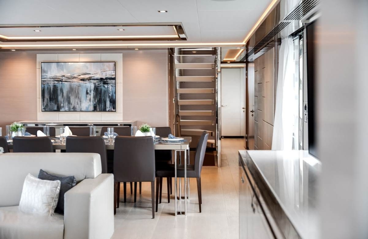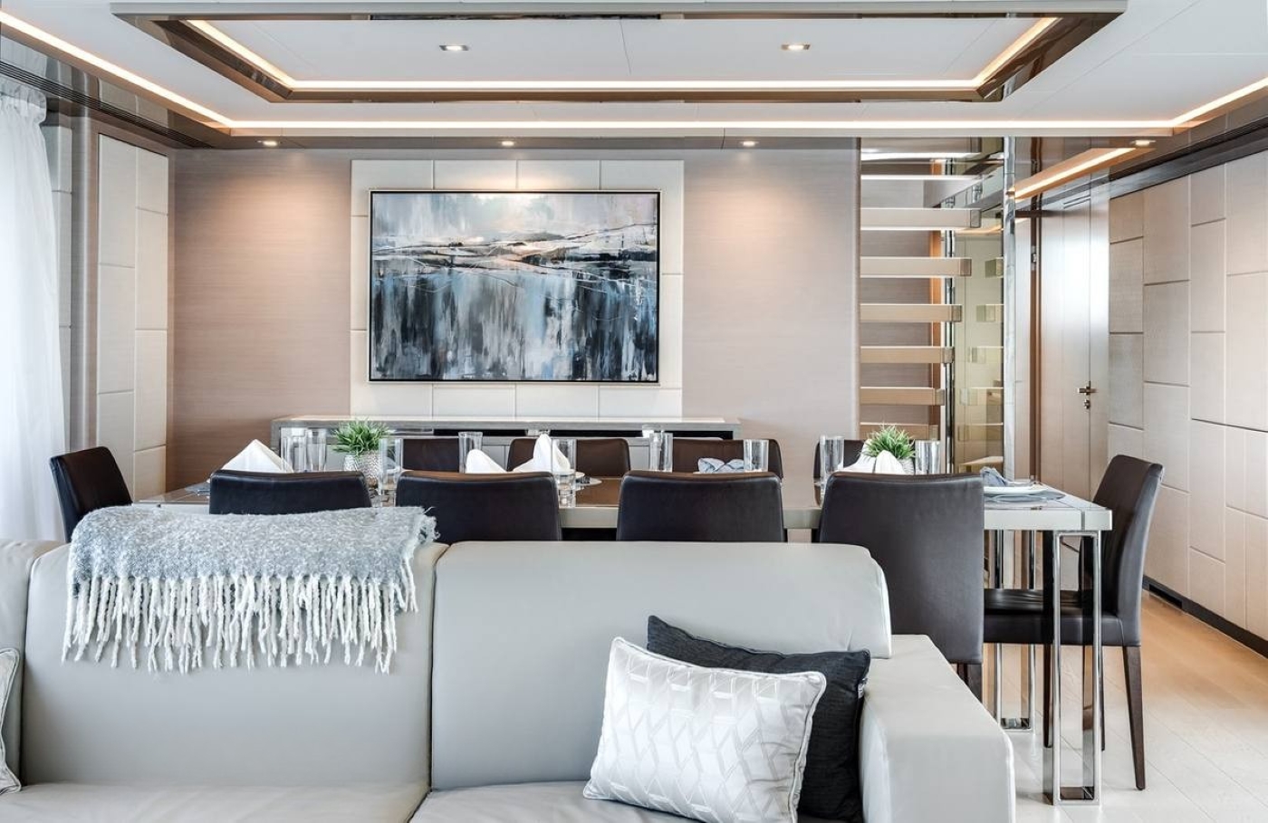 The bright and contemporary interior is well lit by the expansive glazing by day and thoughtful lighting by night and blends a palette of neutral colours with a variety of finishes and upholstery. The main salon is a generous size with a lounge aft and dining setting forward accessed via doors to aft and on each side adjacent to the dining table.