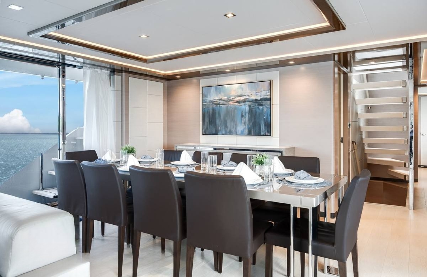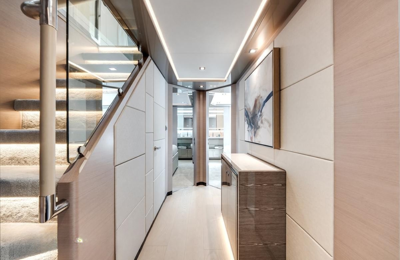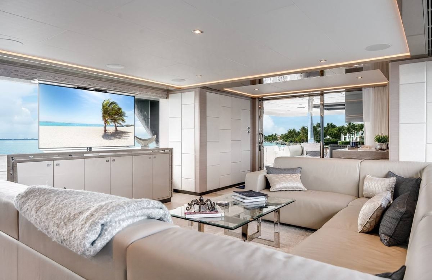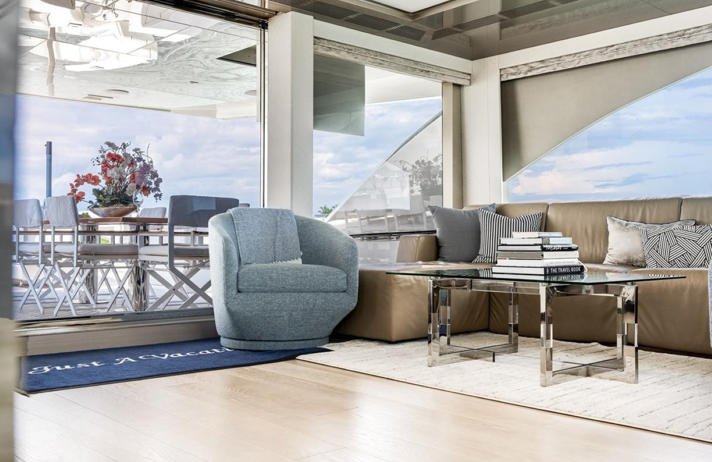 The bright and contemporary interior is well lit by the expansive glazing by day and thoughtful lighting by night and blends a palette of neutral colours with a variety of finishes and upholstery. The main salon is a generous size with a lounge aft and dining setting forward accessed via doors to aft and on each side adjacent to the dining table.