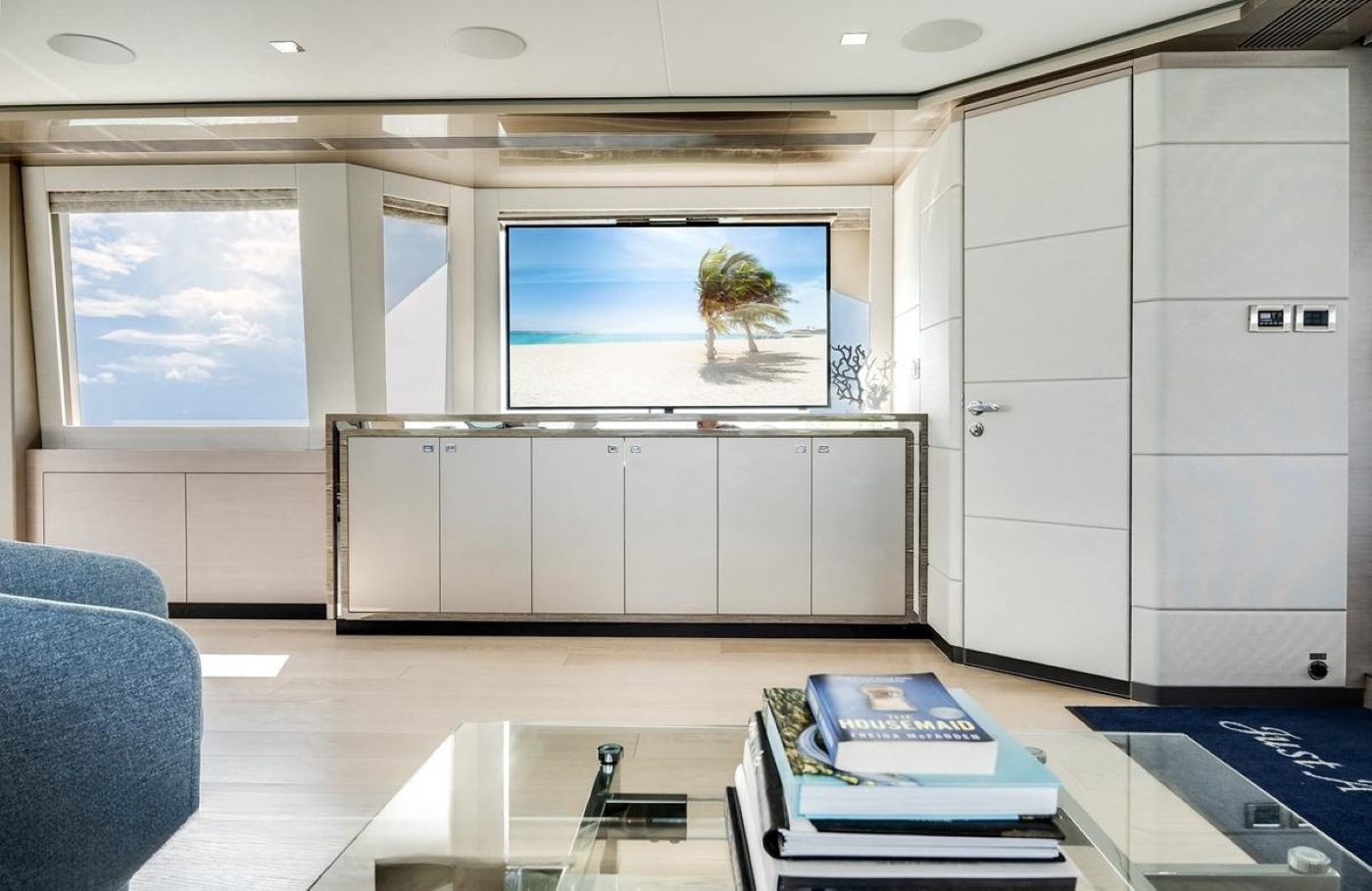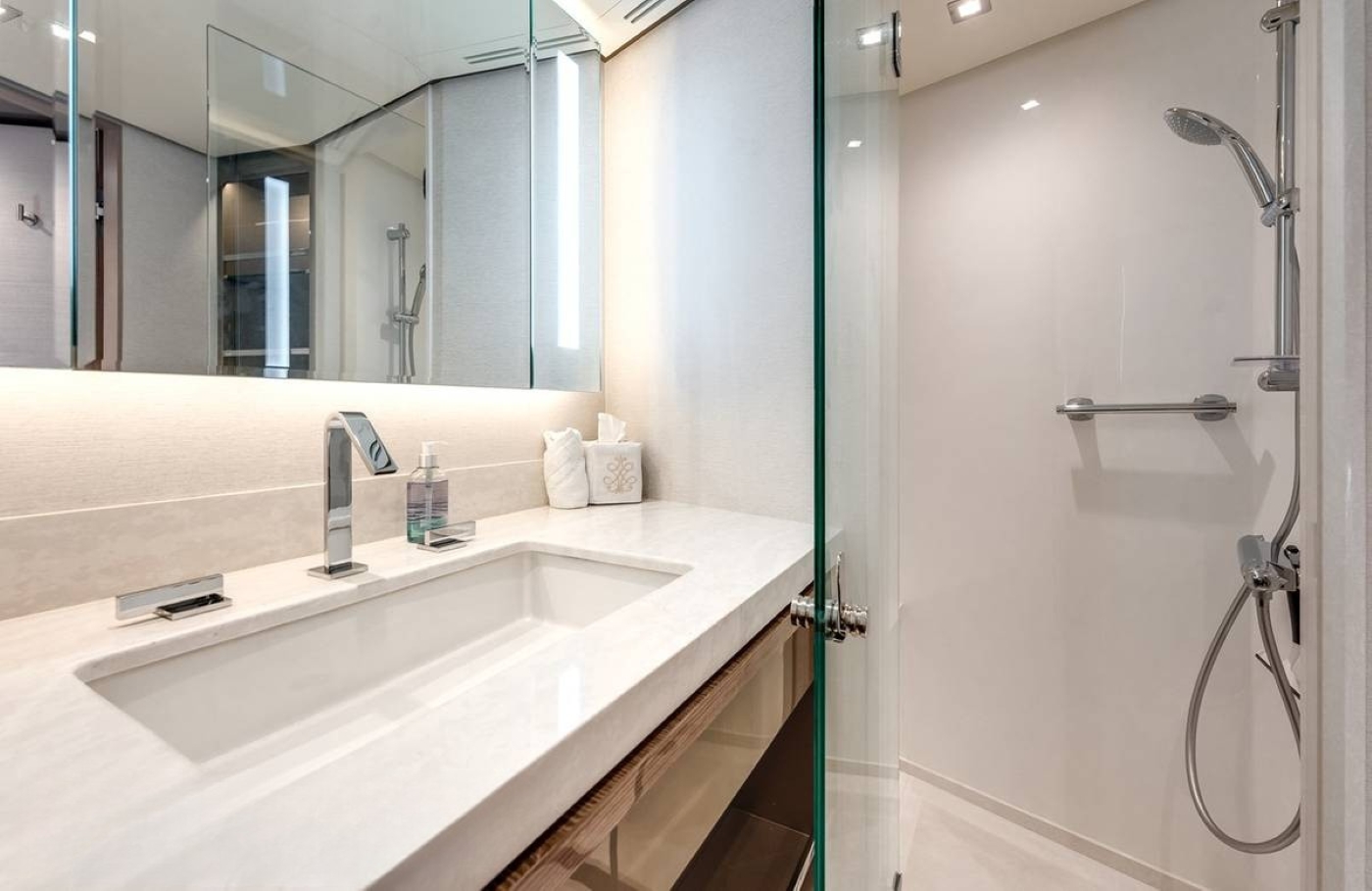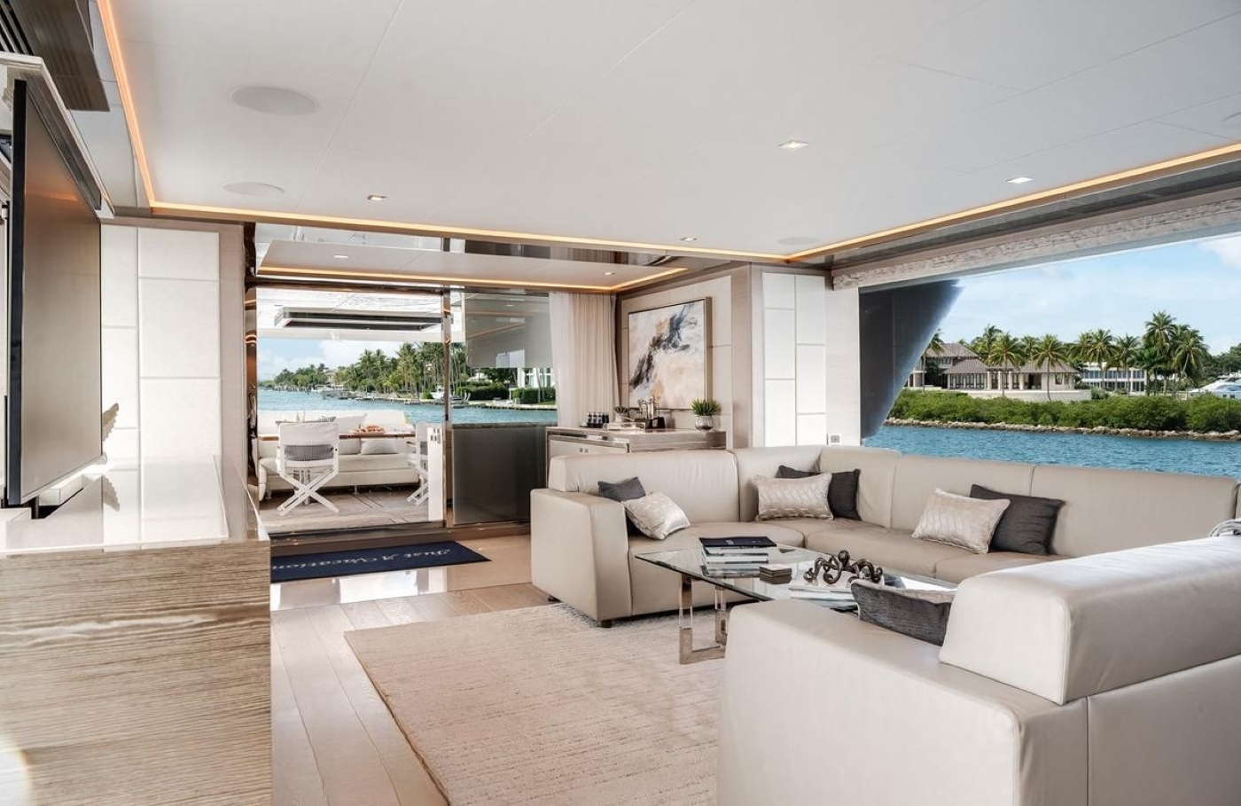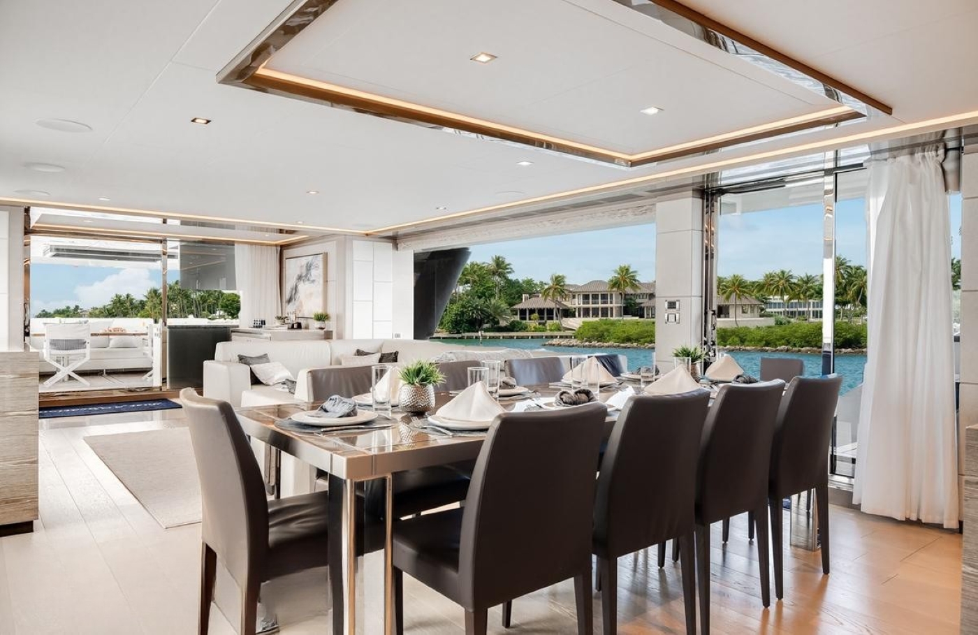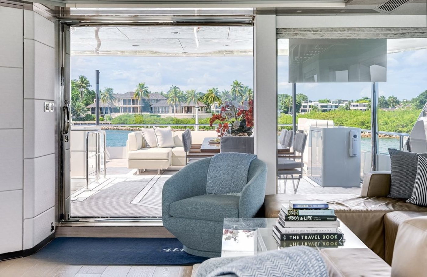 The bright and contemporary interior is well lit by the expansive glazing by day and thoughtful lighting by night and blends a palette of neutral colours with a variety of finishes and upholstery. The main salon is a generous size with a lounge aft and dining setting forward accessed via doors to aft and on each side adjacent to the dining table.