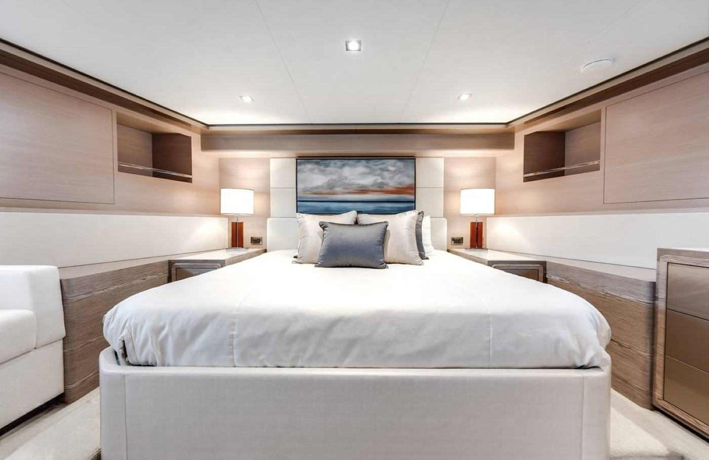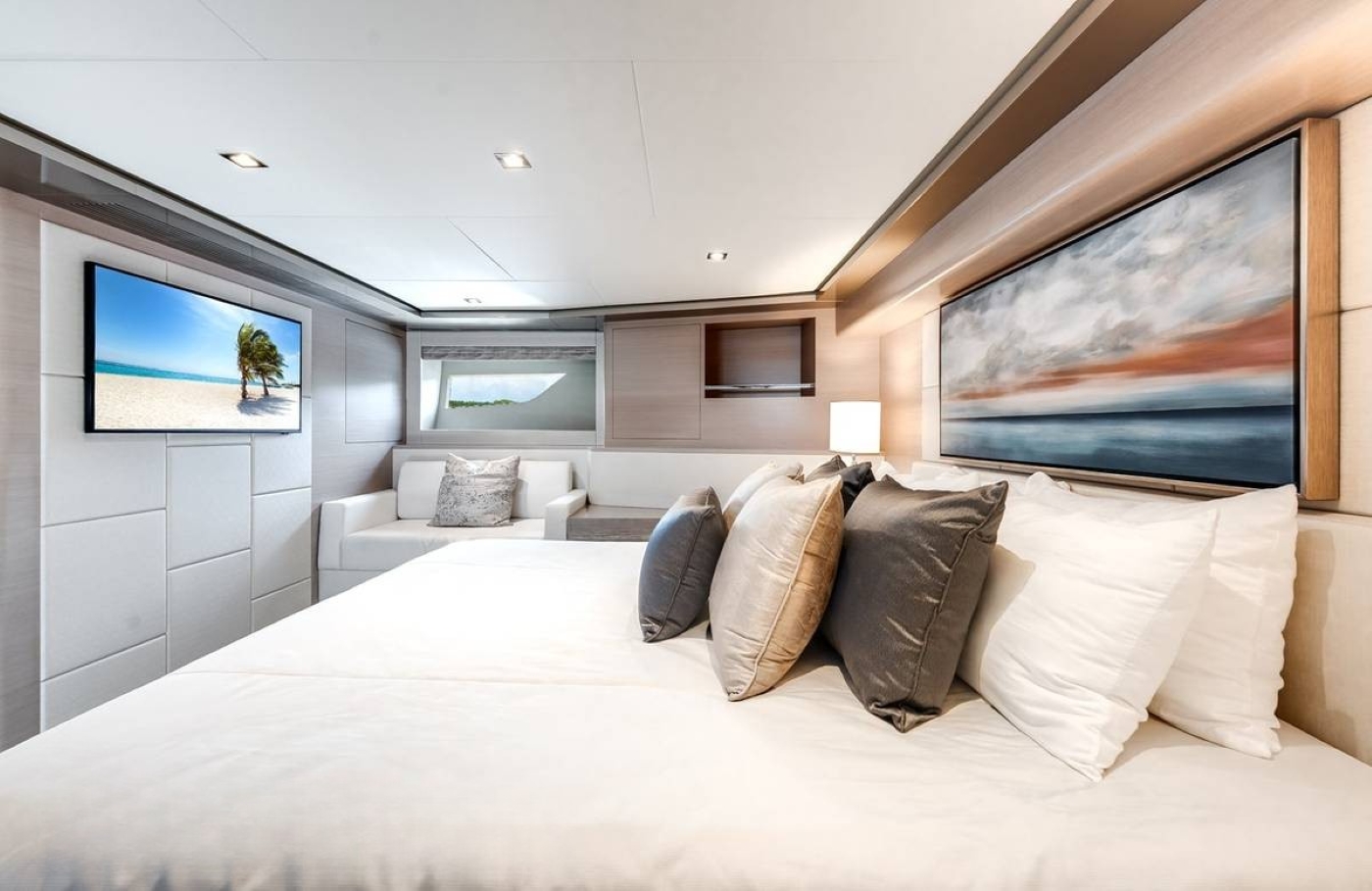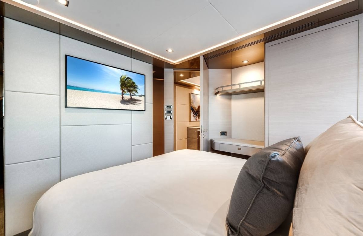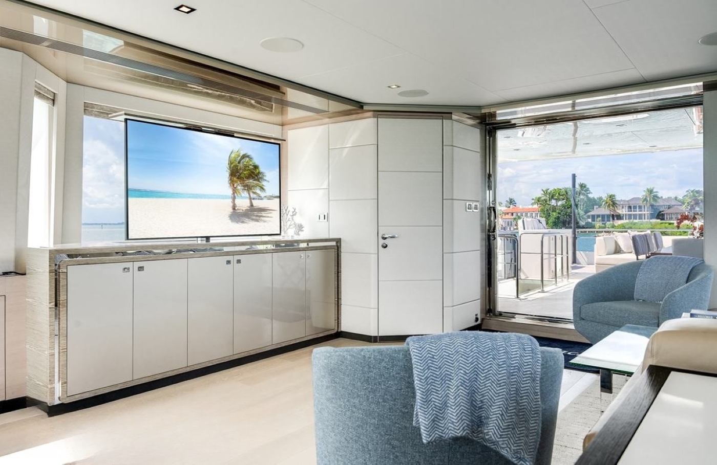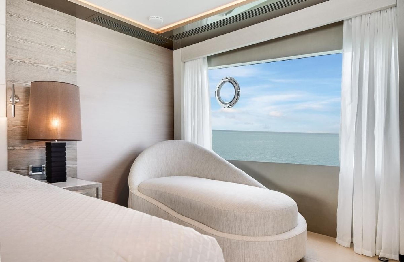The bright and contemporary interior is well lit by the expansive glazing by day and thoughtful lighting by night and blends a palette of neutral colours with a variety of finishes and upholstery. The main salon is a generous size with a lounge aft and dining setting forward accessed via doors to aft and on each side adjacent to the dining table.