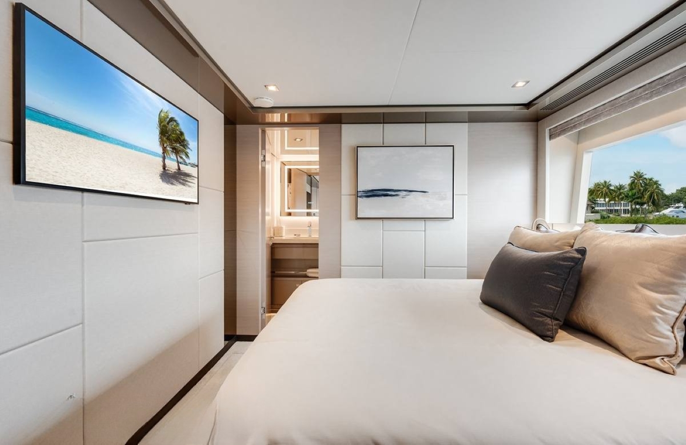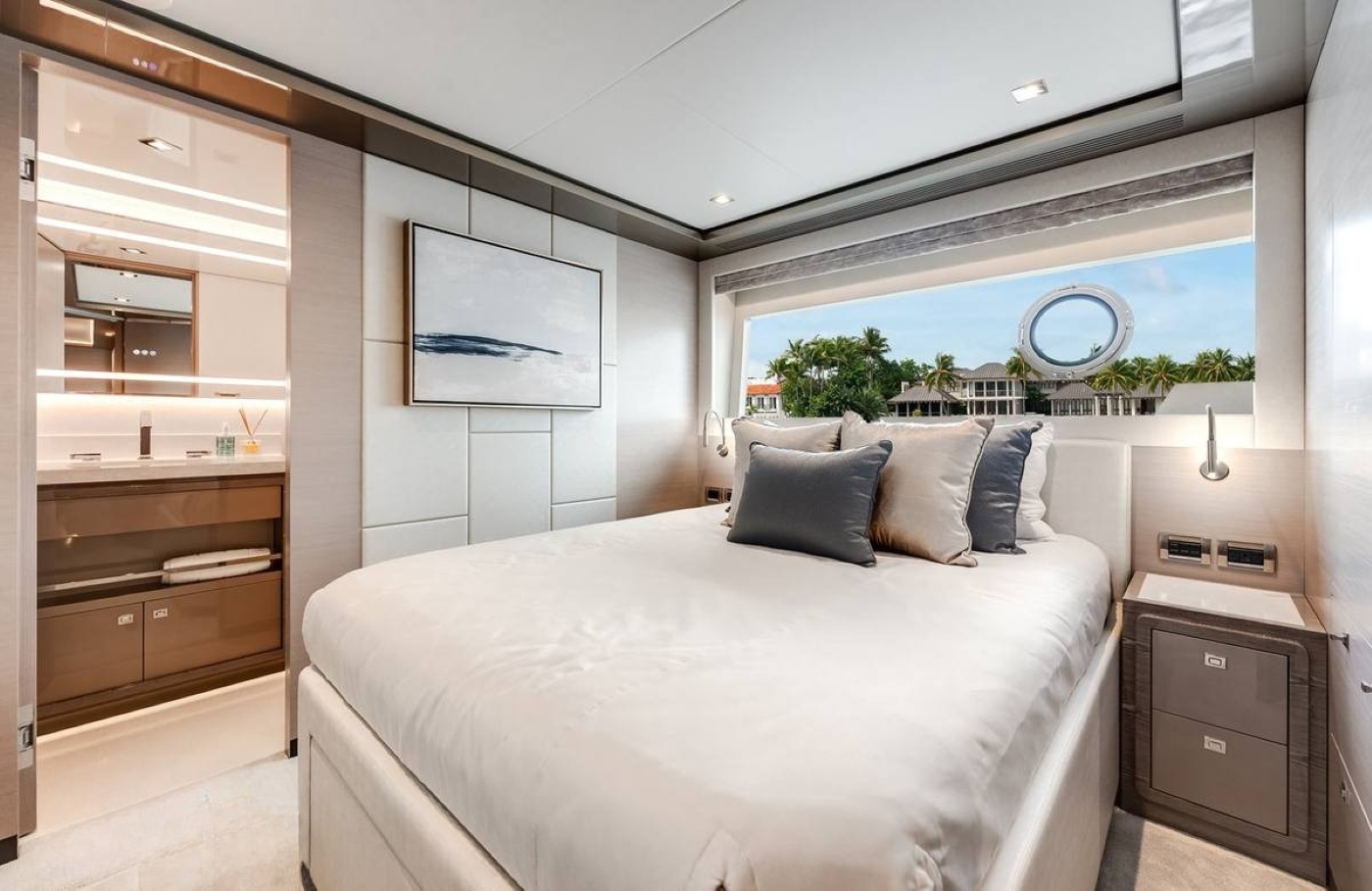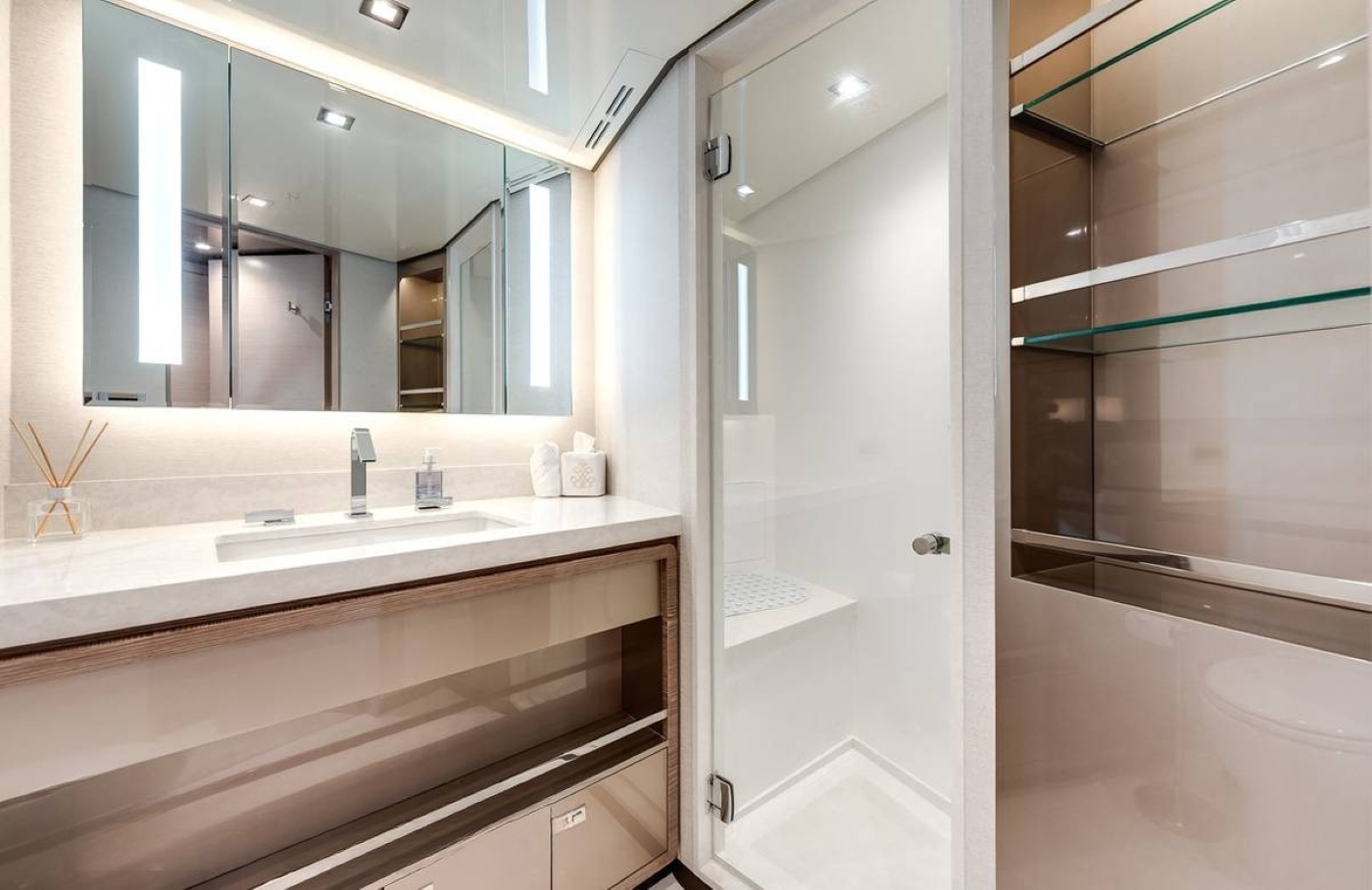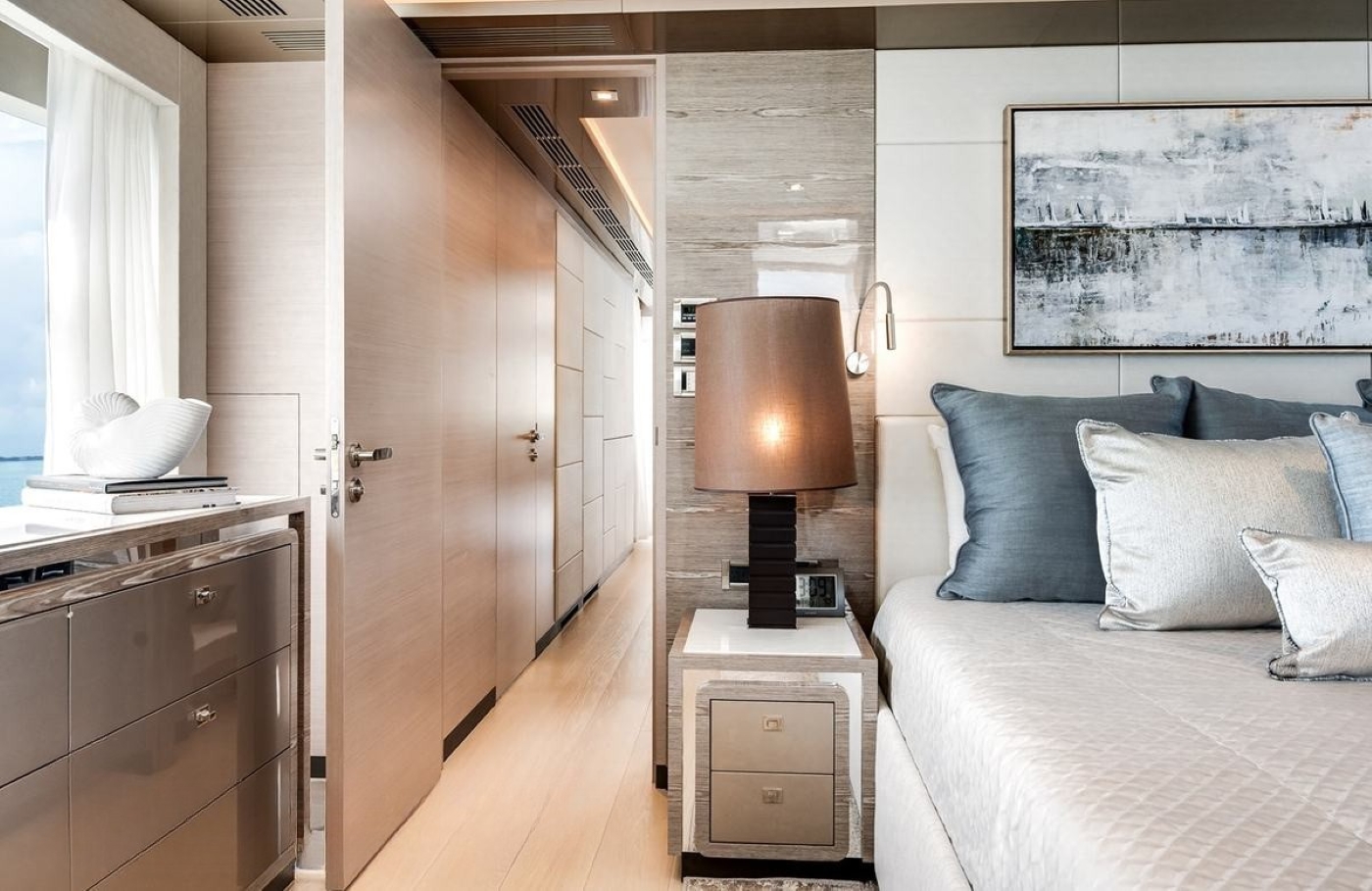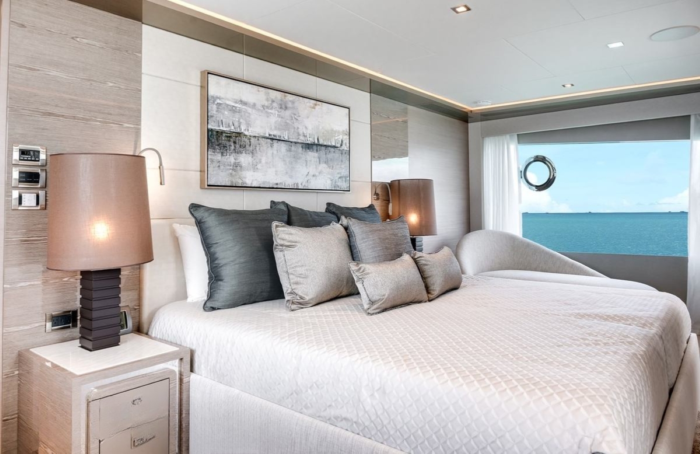 The bright and contemporary interior is well lit by the expansive glazing by day and thoughtful lighting by night and blends a palette of neutral colours with a variety of finishes and upholstery. The main salon is a generous size with a lounge aft and dining setting forward accessed via doors to aft and on each side adjacent to the dining table.