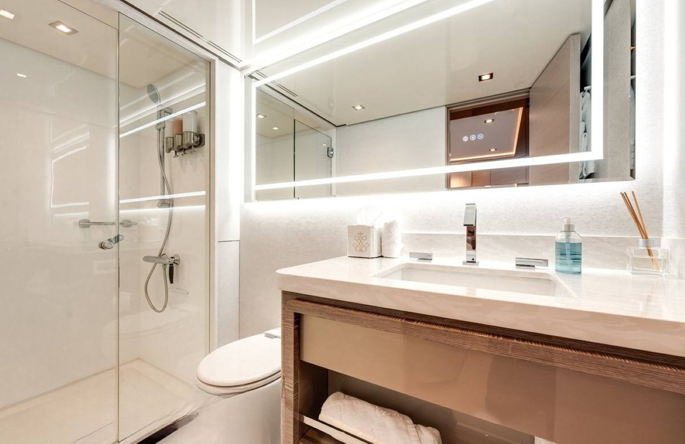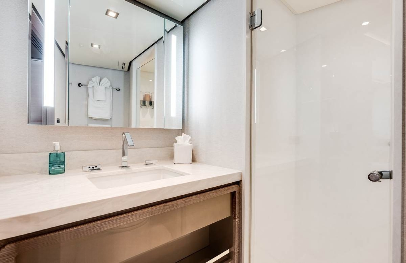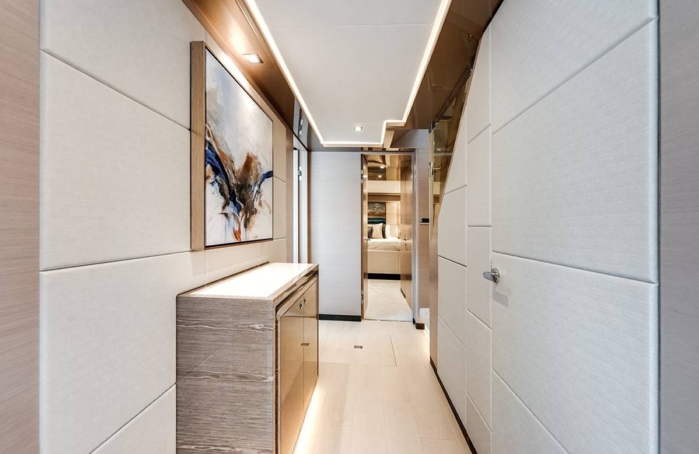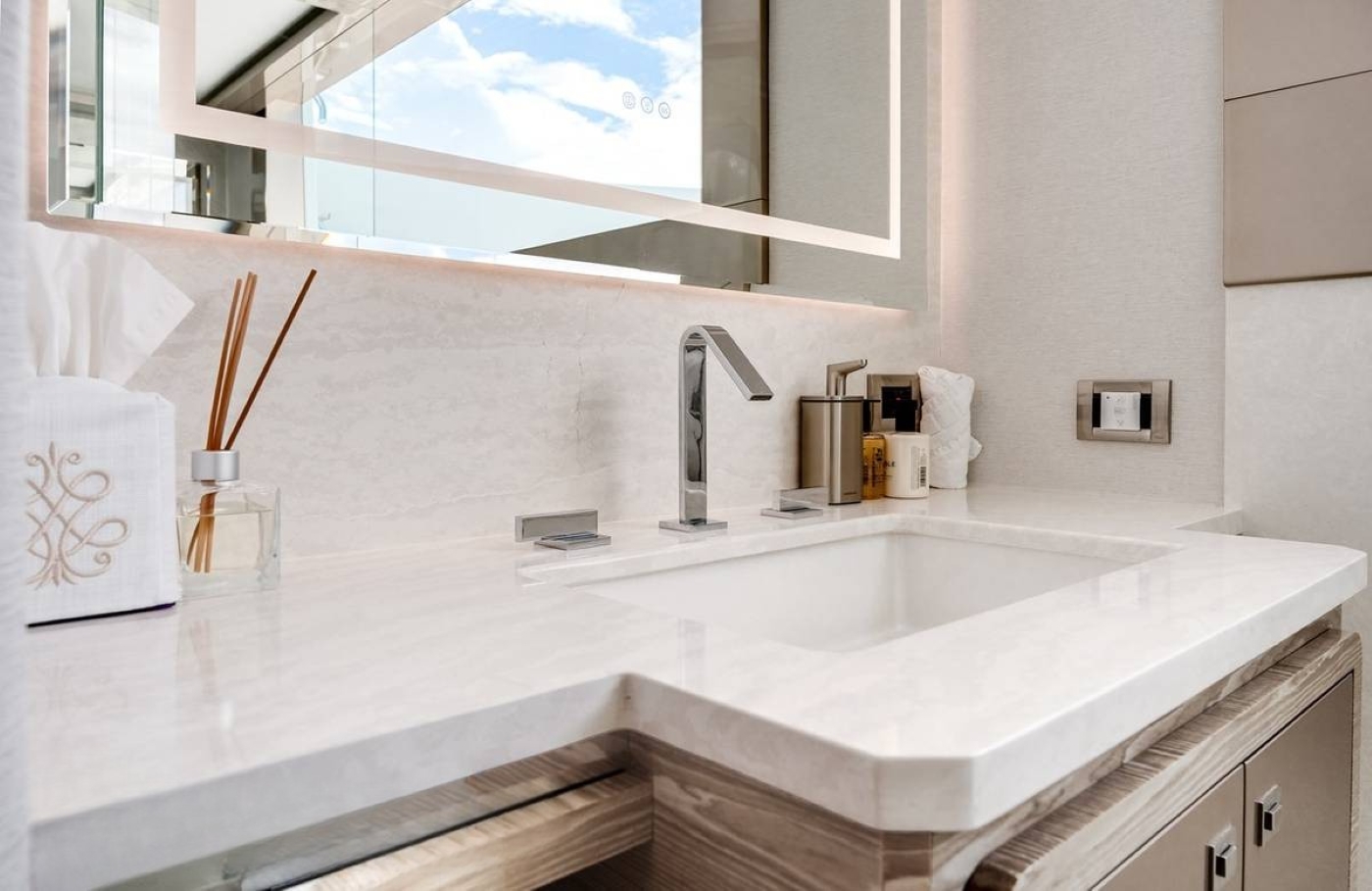 The bright and contemporary interior is well lit by the expansive glazing by day and thoughtful lighting by night and blends a palette of neutral colours with a variety of finishes and upholstery. The main salon is a generous size with a lounge aft and dining setting forward accessed via doors to aft and on each side adjacent to the dining table.
