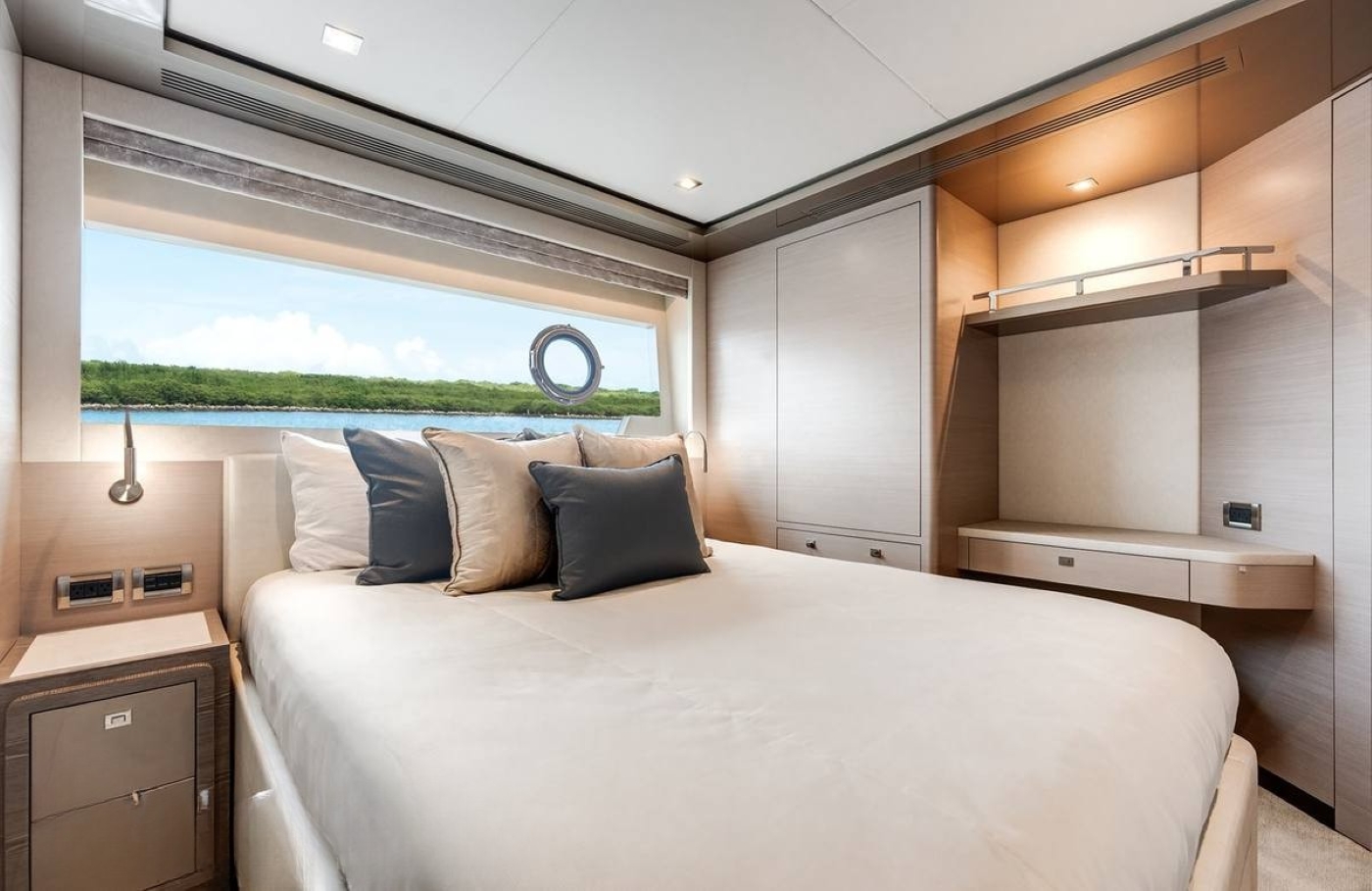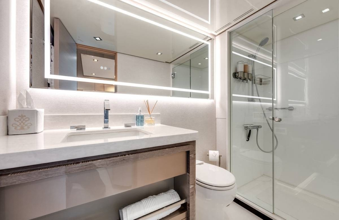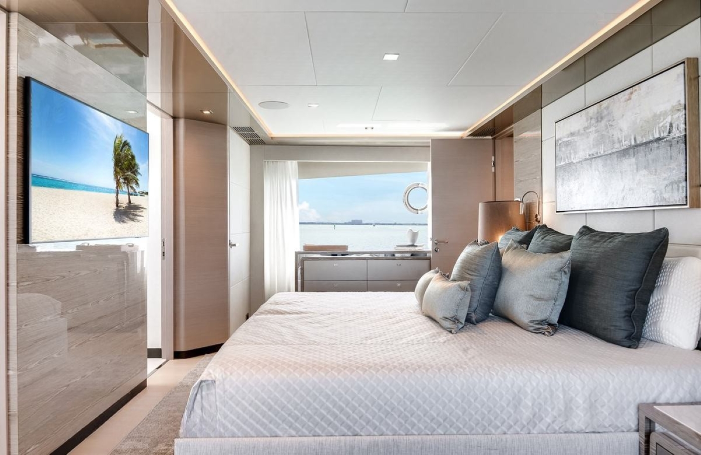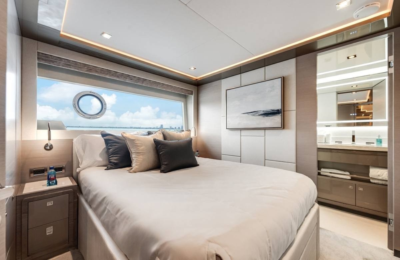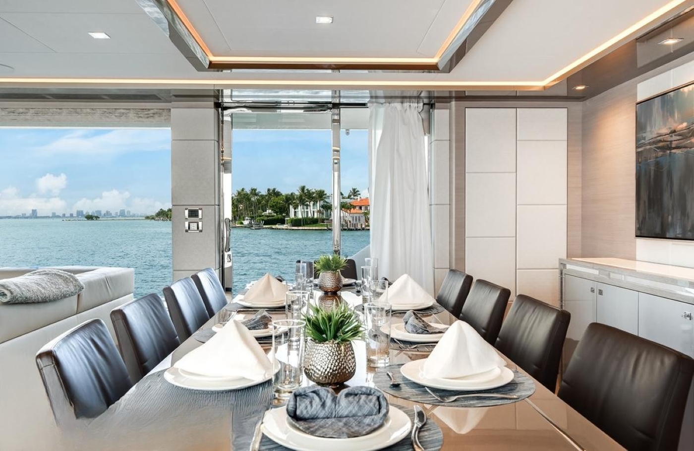 The bright and contemporary interior is well lit by the expansive glazing by day and thoughtful lighting by night and blends a palette of neutral colours with a variety of finishes and upholstery. The main salon is a generous size with a lounge aft and dining setting forward accessed via doors to aft and on each side adjacent to the dining table.