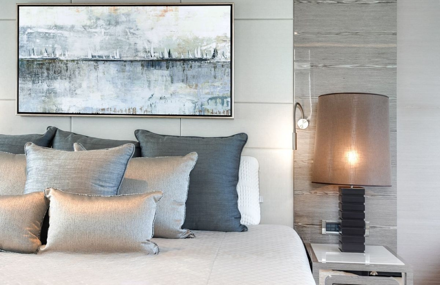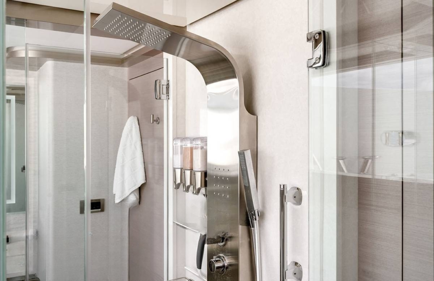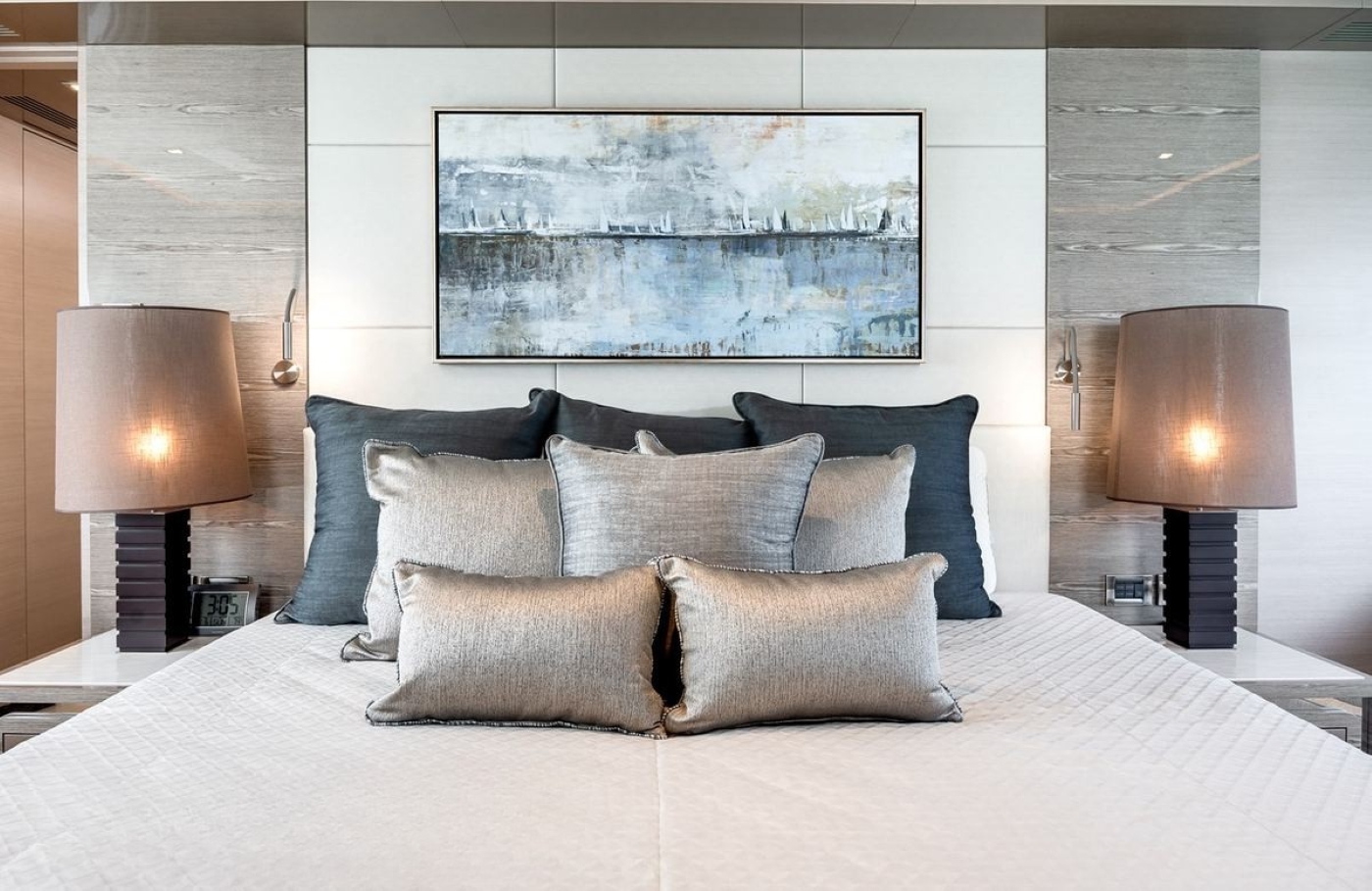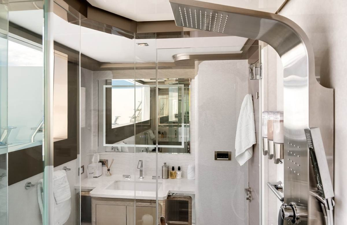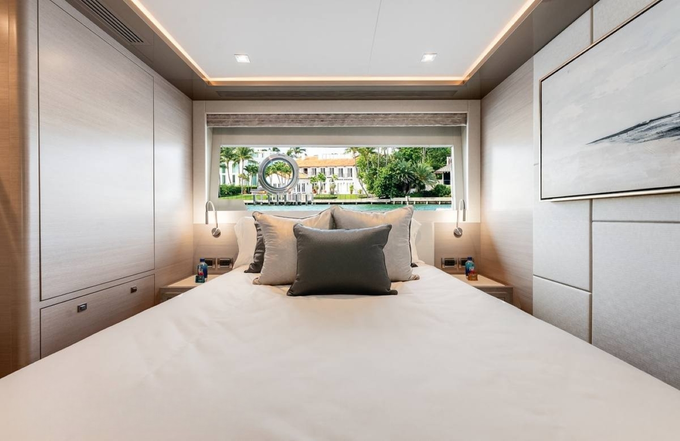 The bright and contemporary interior is well lit by the expansive glazing by day and thoughtful lighting by night and blends a palette of neutral colours with a variety of finishes and upholstery. The main salon is a generous size with a lounge aft and dining setting forward accessed via doors to aft and on each side adjacent to the dining table.