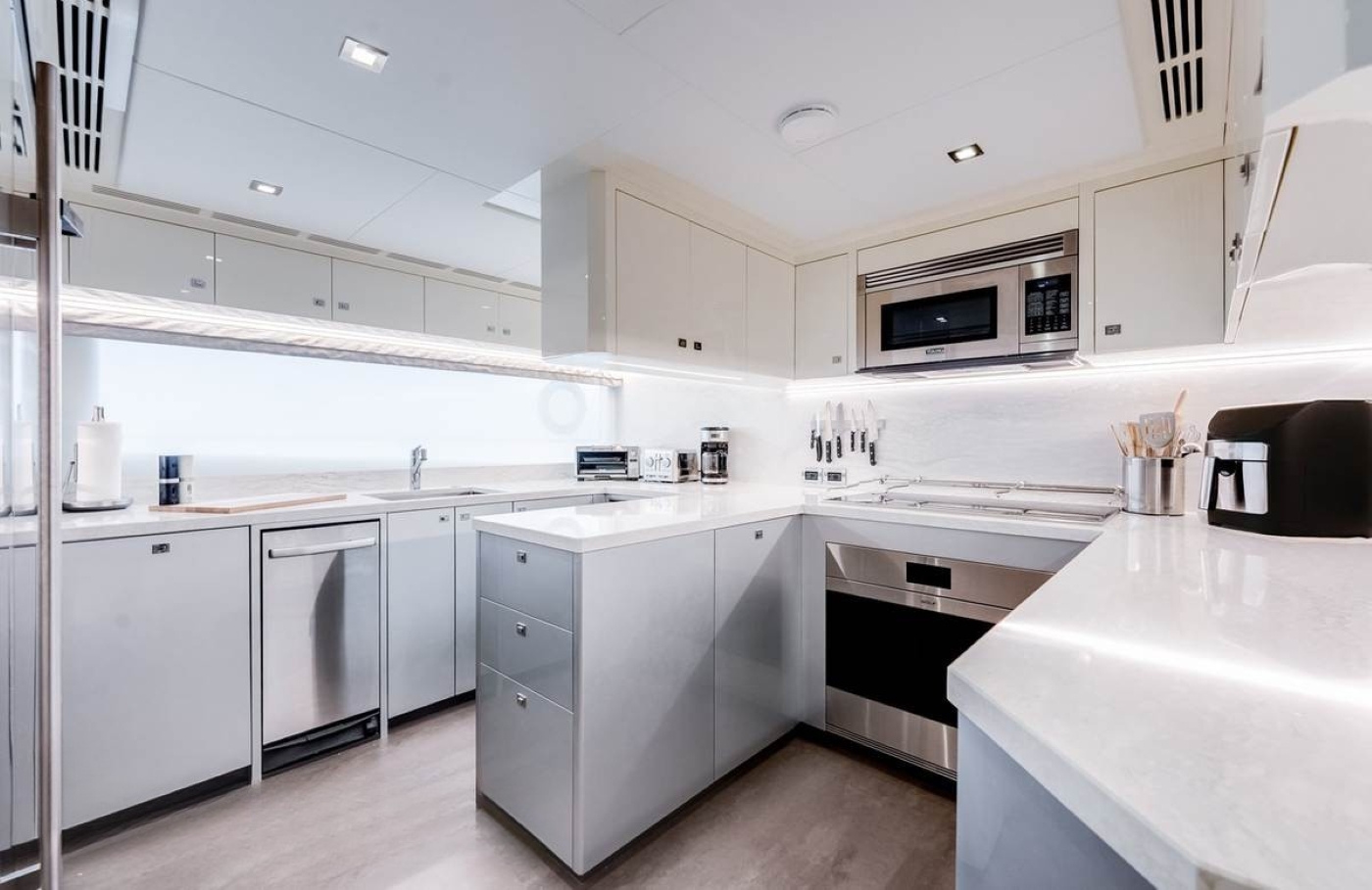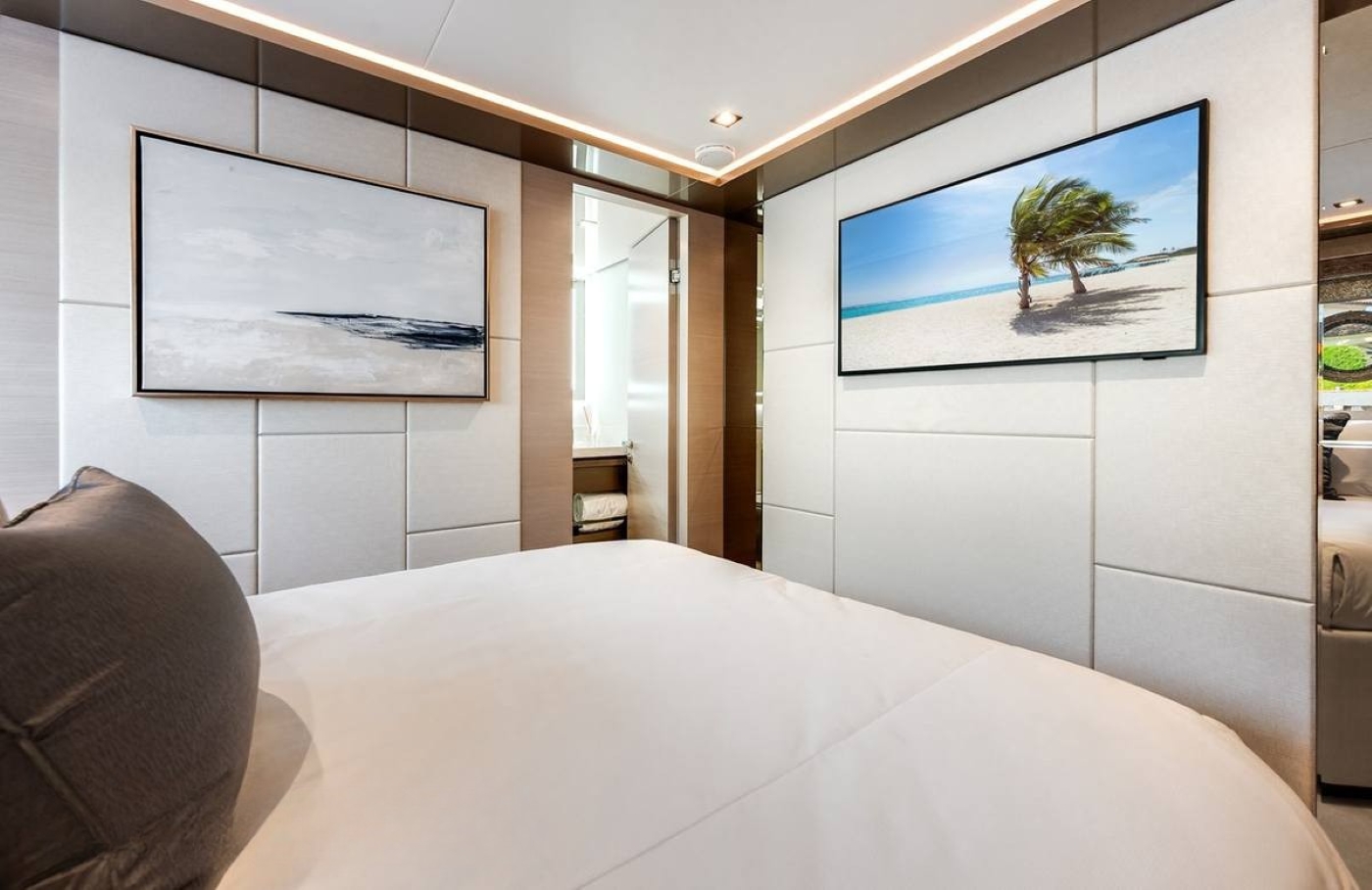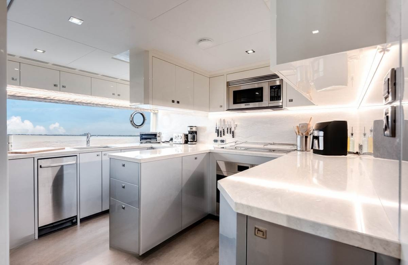 The galley, day head and master suite are on the main deck while the lower deck plays host to the additional guest suites and the aft beach club which boasts a sky light, wet bar and air conditioning.