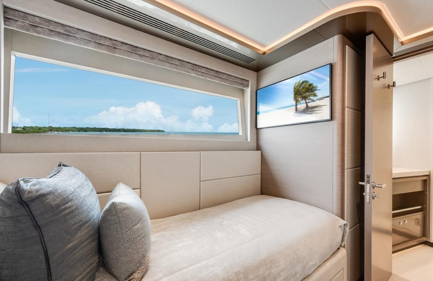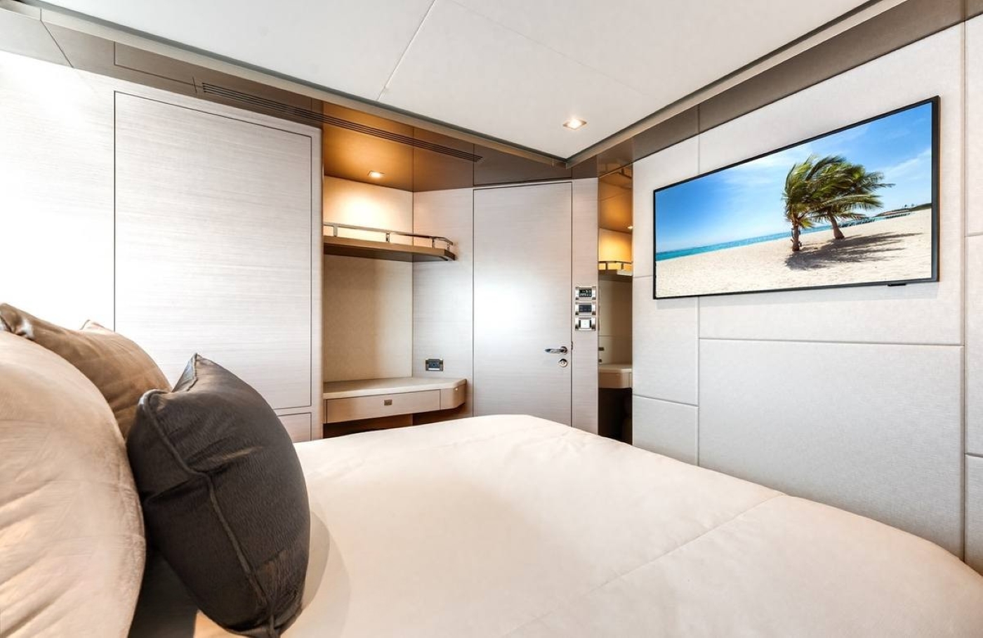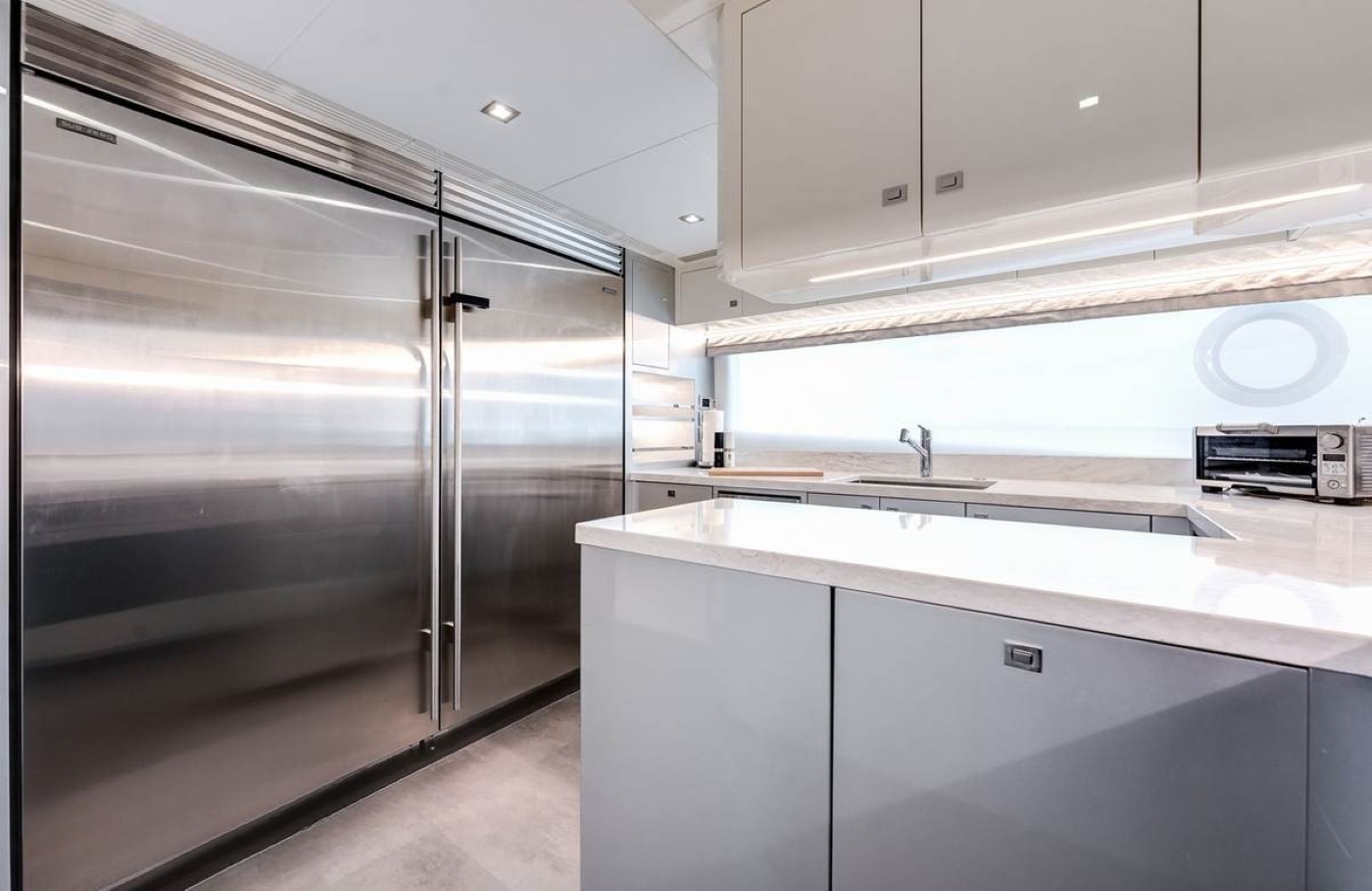 The galley, day head and master suite are on the main deck while the lower deck plays host to the additional guest suites and the aft beach club which boasts a sky light, wet bar and air conditioning.