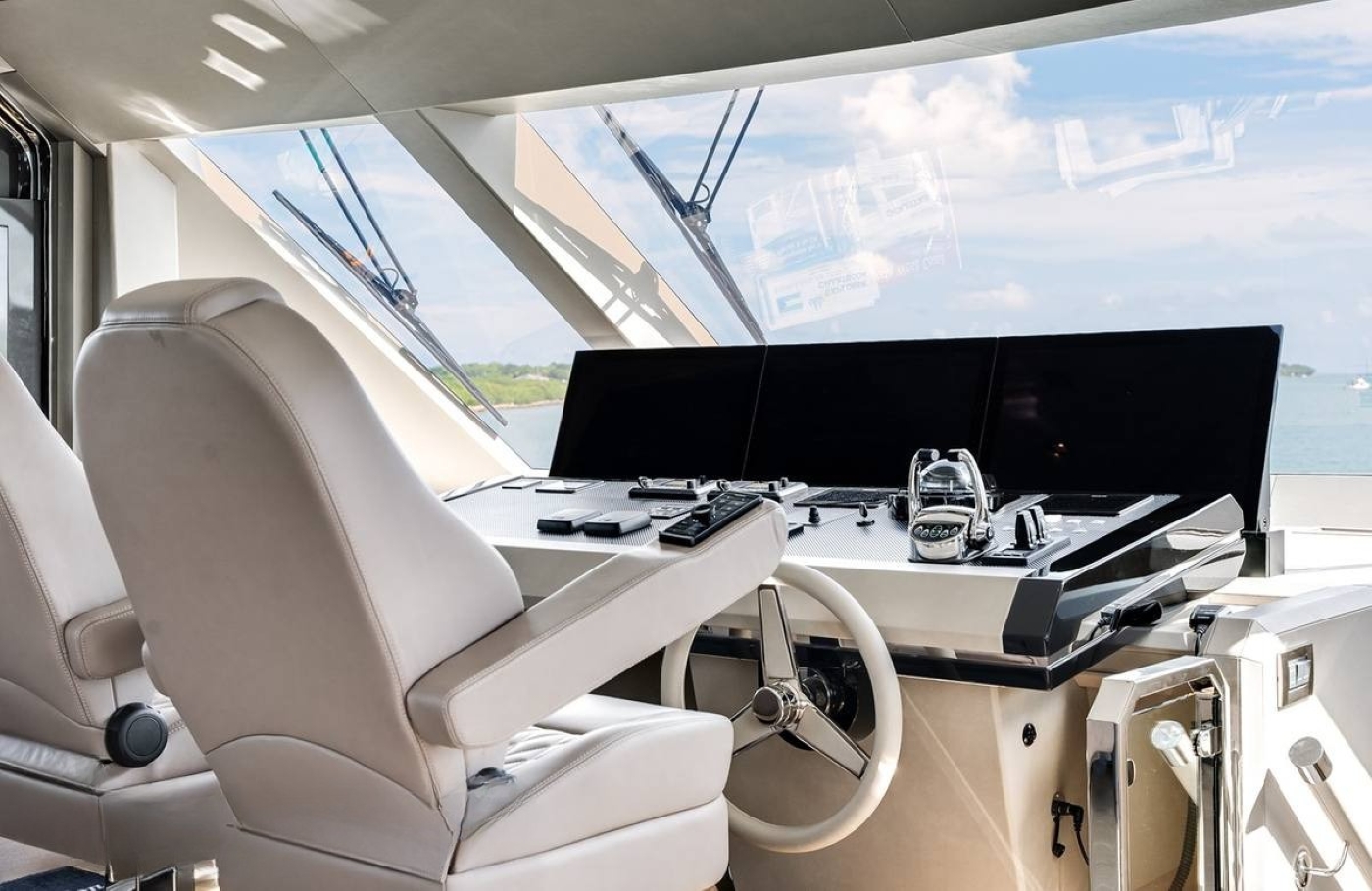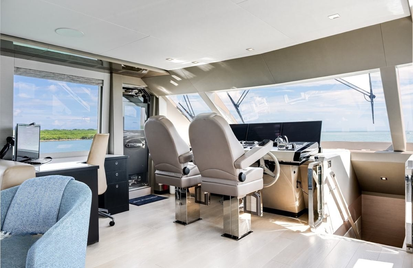 The sky lounge on the bridge deck is a versatile space including a lounge area - with sofa, armchairs and large TV - office space and forward helm controls. Panoramic windows and glass doors out to the deck offer fabulous views of the surroundings.