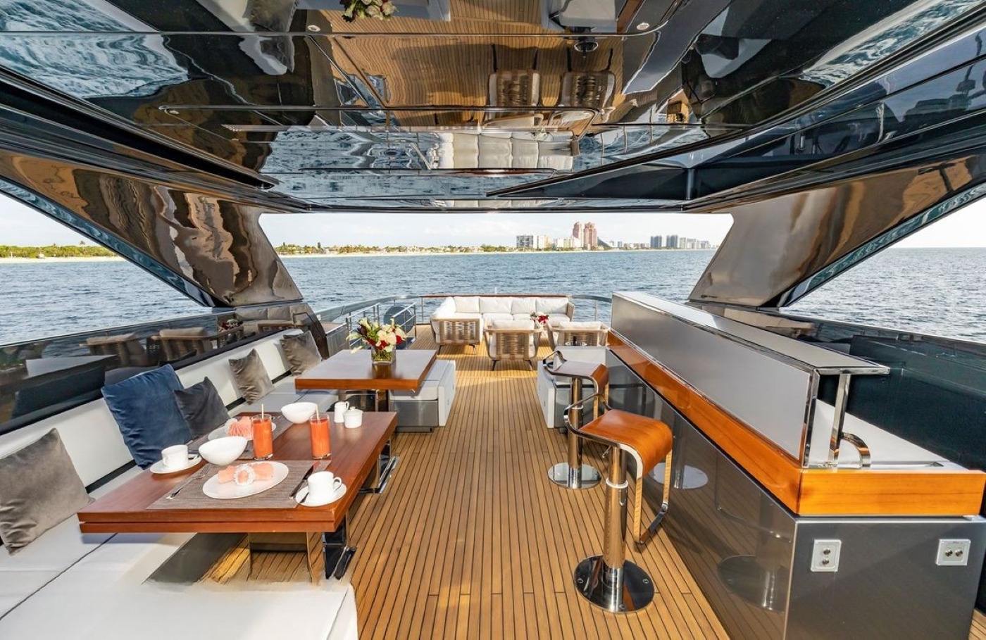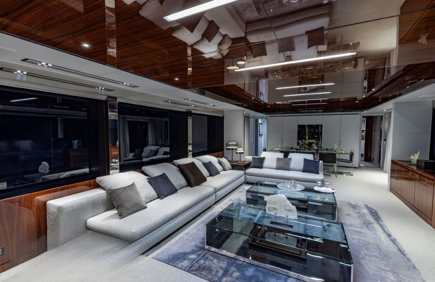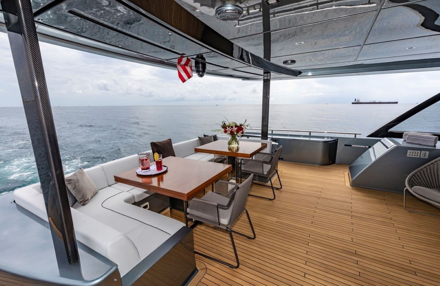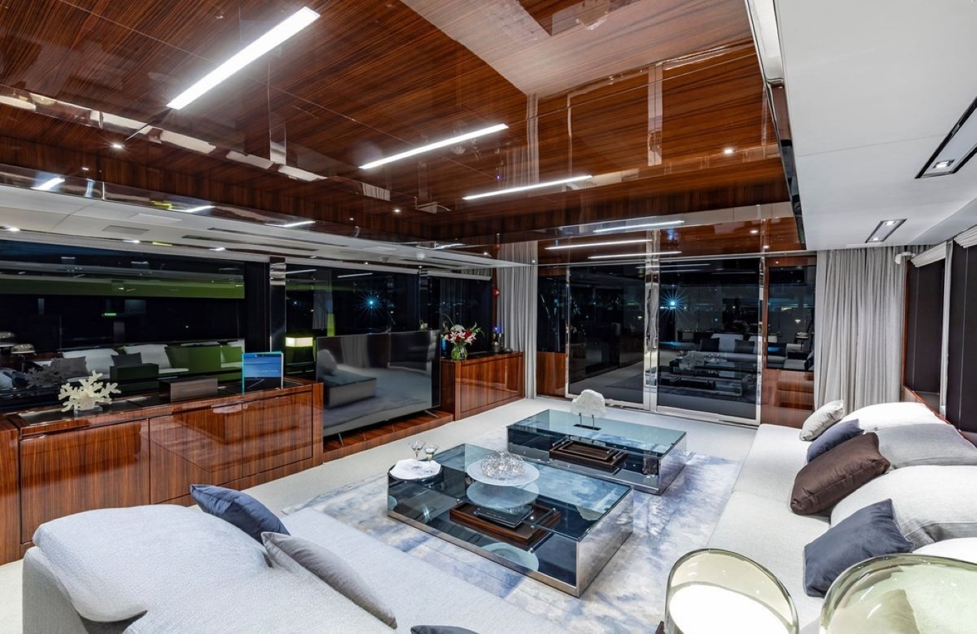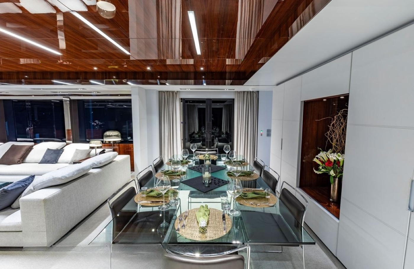 Moving up to the sun deck, guests will find an expanse of cushioned sun pads and sofas to aft, an alfresco dining area under the shade of the flybridge bimini and another bar counter with stools. Retractable panoramic windows provide an interrupted view and the elevated position offers an unencumbered vantage point.