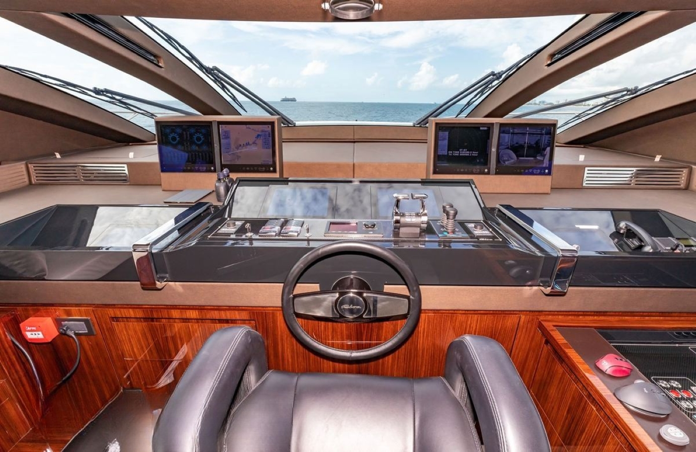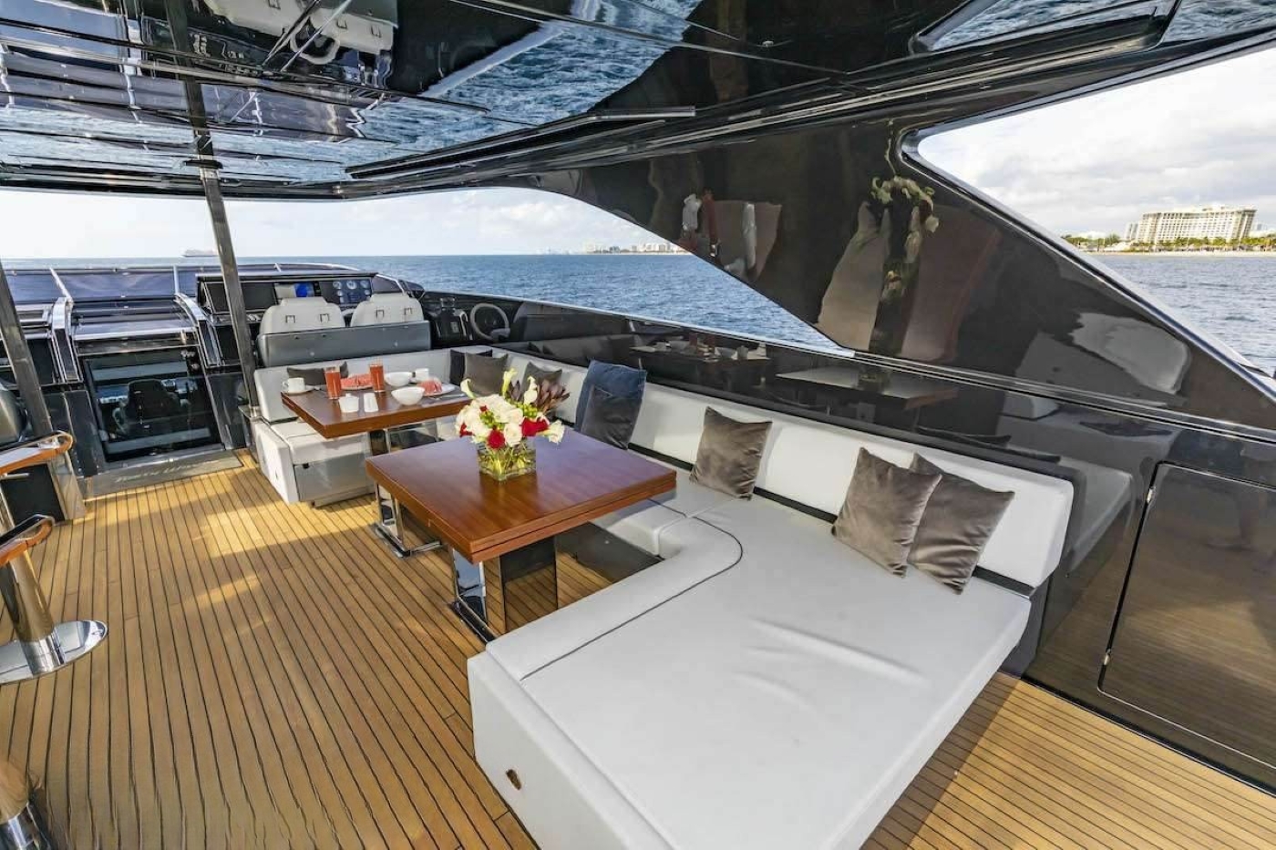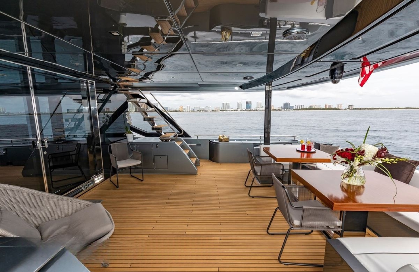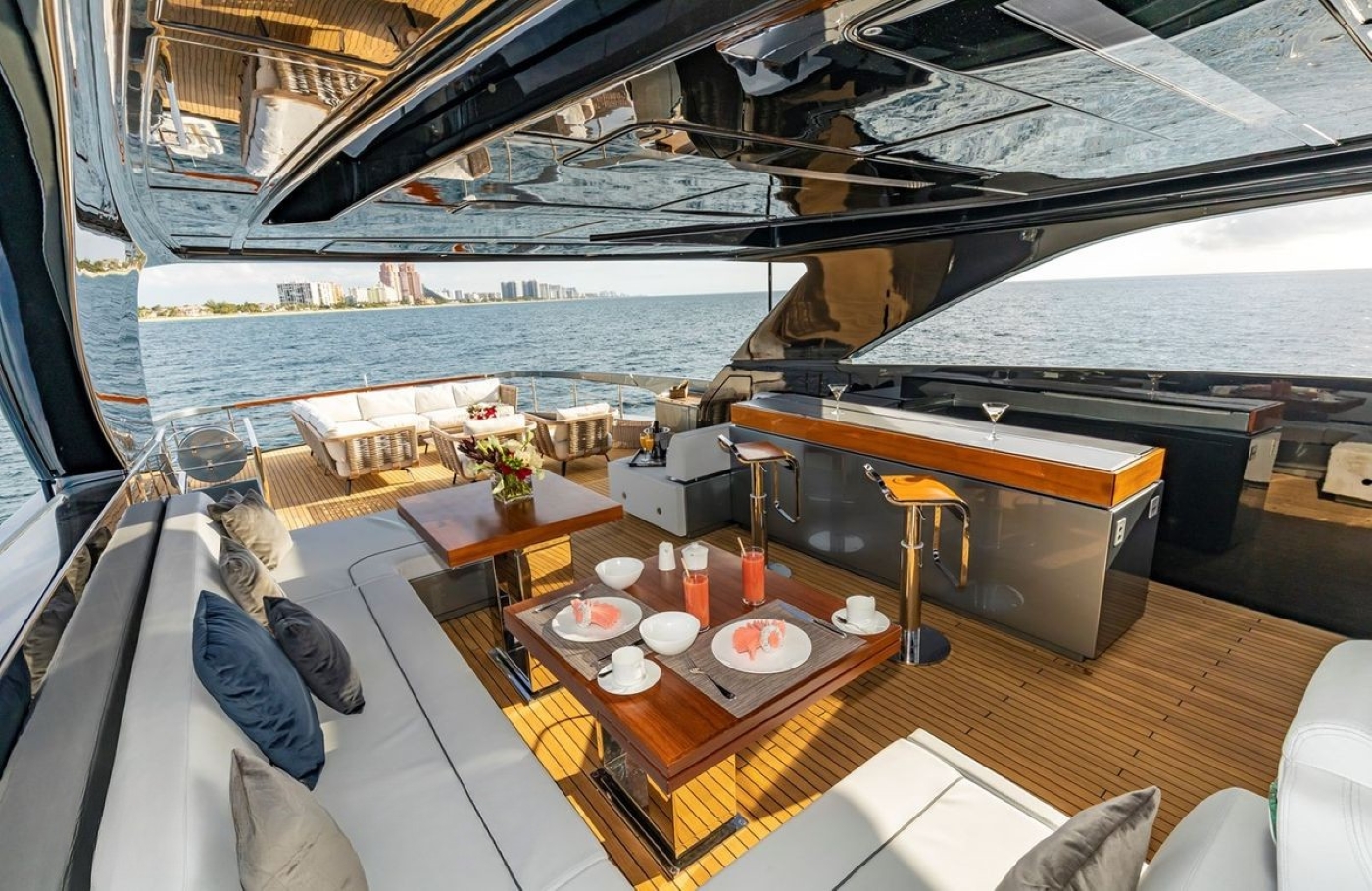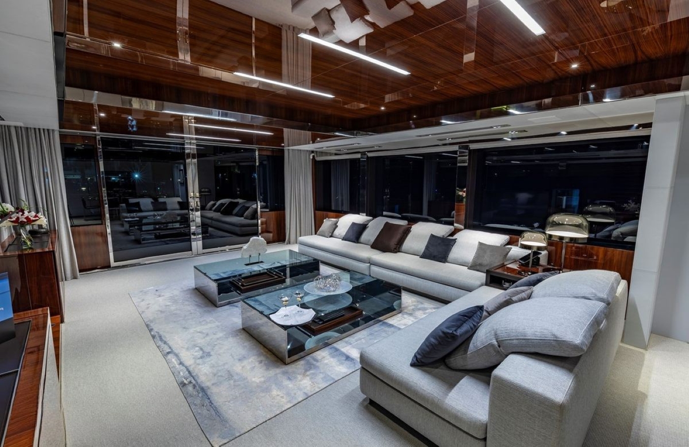 Moving up to the sun deck, guests will find an expanse of cushioned sun pads and sofas to aft, an alfresco dining area under the shade of the flybridge bimini and another bar counter with stools. Retractable panoramic windows provide an interrupted view and the elevated position offers an unencumbered vantage point.