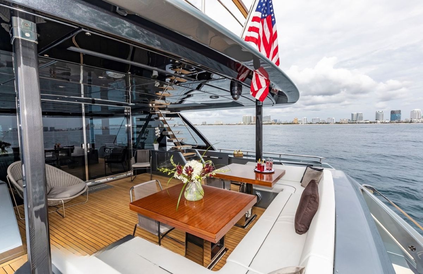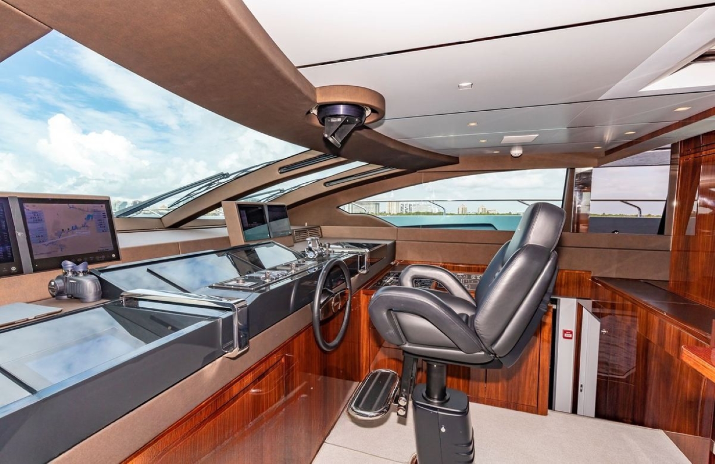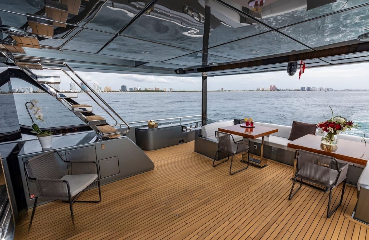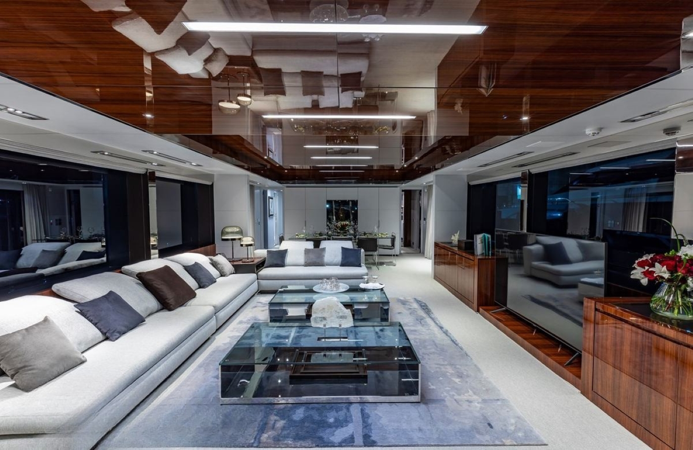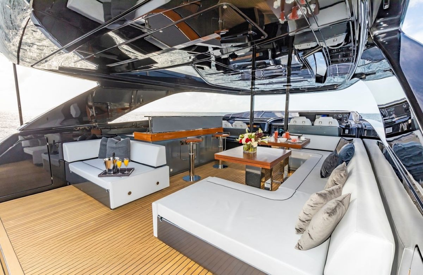 Moving up to the sun deck, guests will find an expanse of cushioned sun pads and sofas to aft, an alfresco dining area under the shade of the flybridge bimini and another bar counter with stools. Retractable panoramic windows provide an interrupted view and the elevated position offers an unencumbered vantage point.