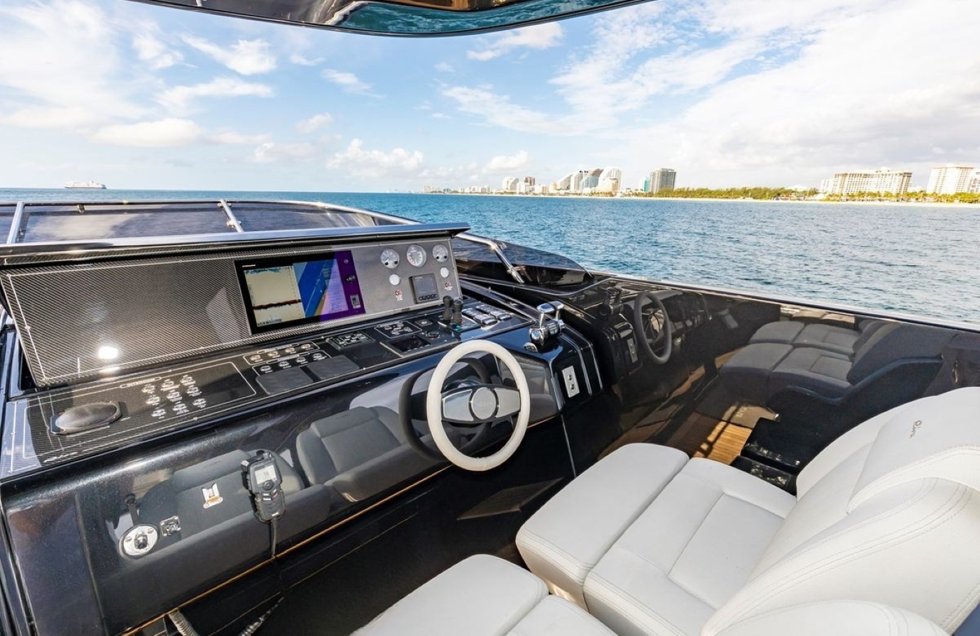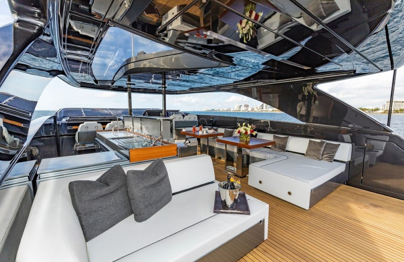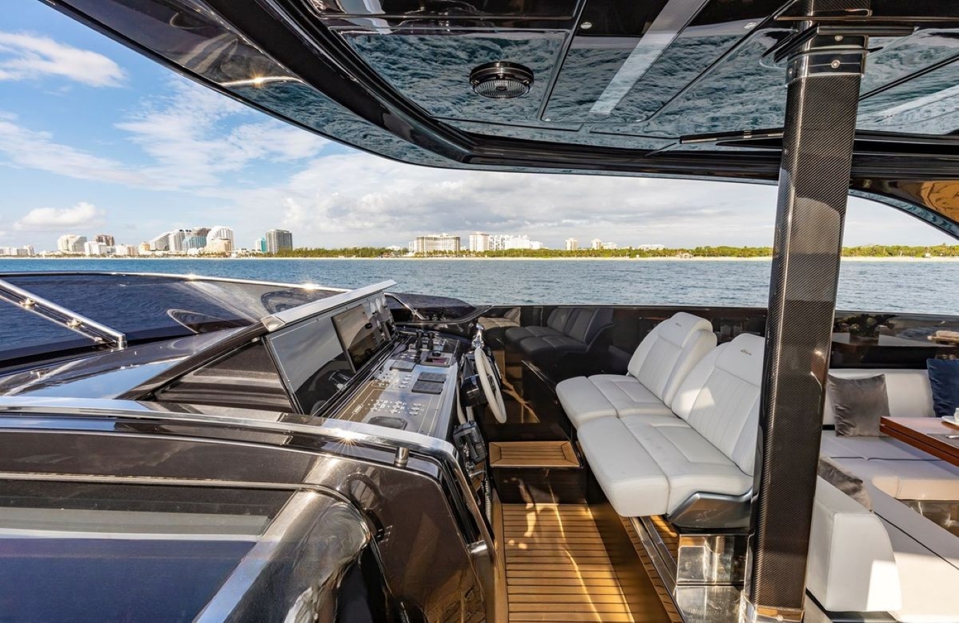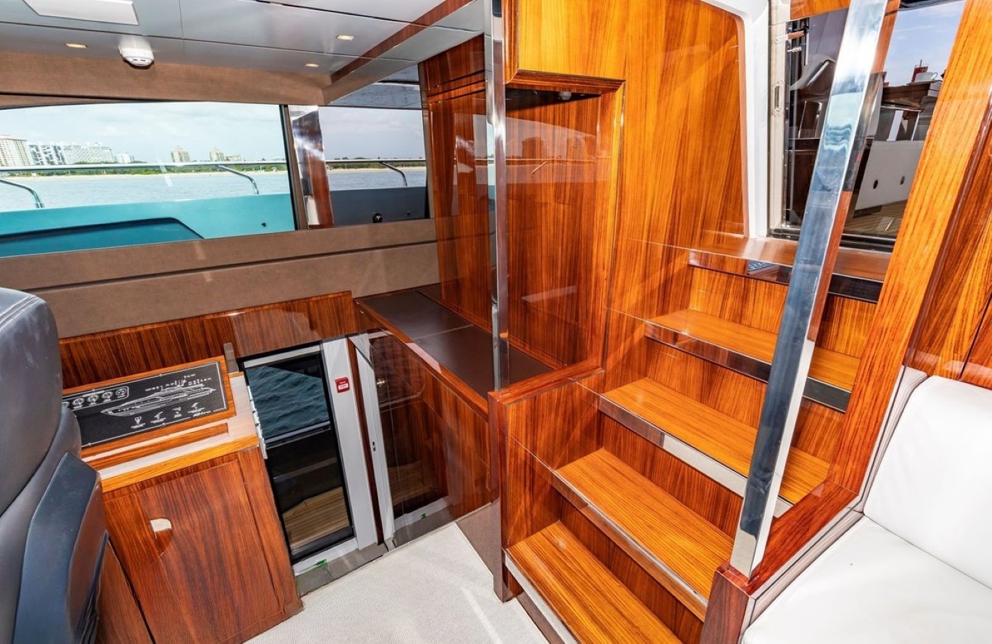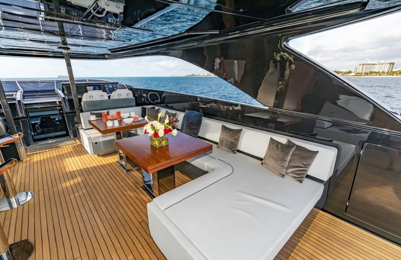 Moving up to the sun deck, guests will find an expanse of cushioned sun pads and sofas to aft, an alfresco dining area under the shade of the flybridge bimini and another bar counter with stools. Retractable panoramic windows provide an interrupted view and the elevated position offers an unencumbered vantage point.