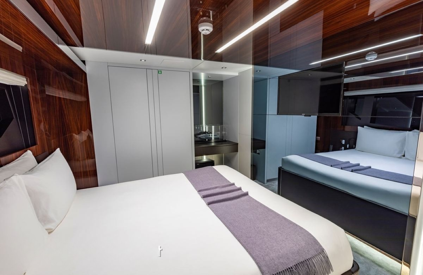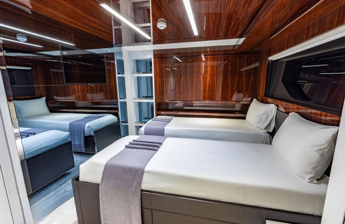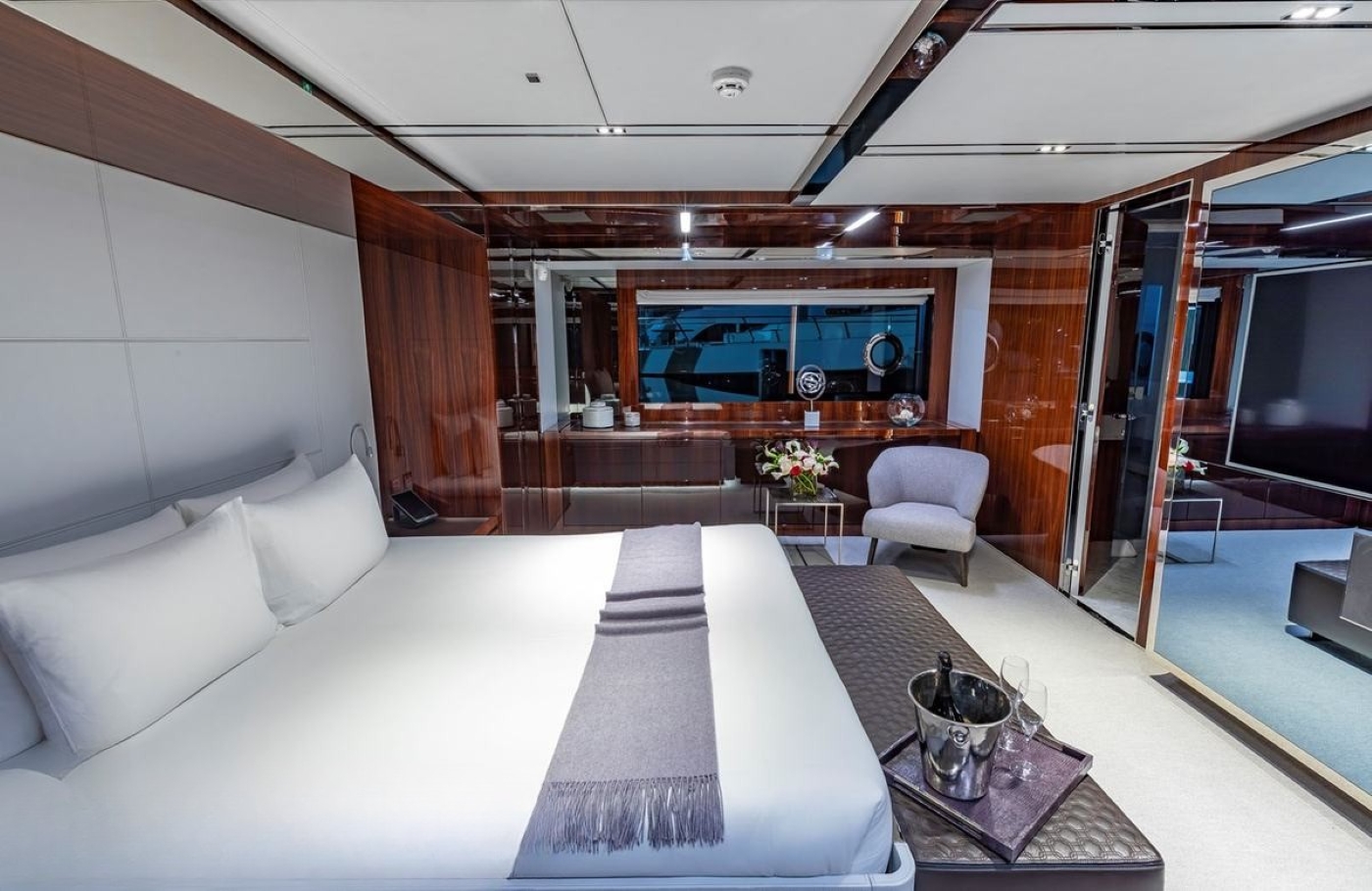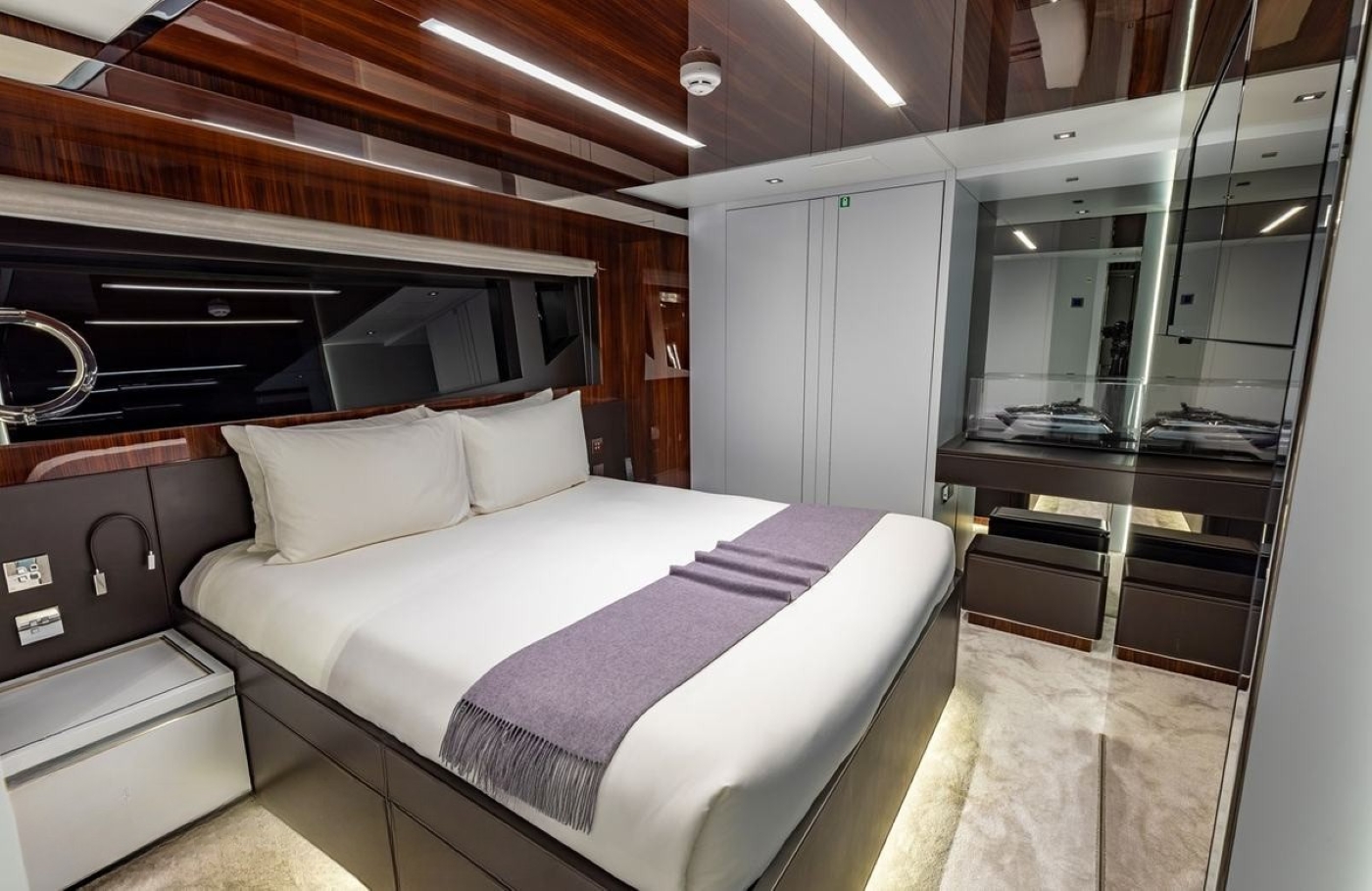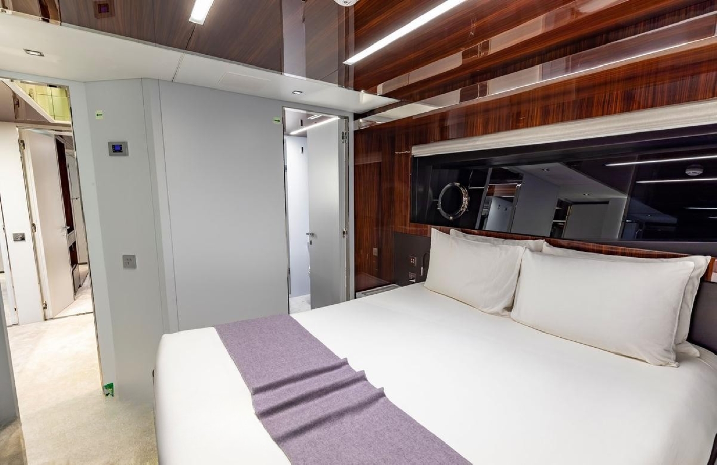 Launched in 2019, NO SURRENDER is in impeccable condition and offers spacious accommodation for eight guests. The arrangement comprises a master suite, a VIP double and two guest cabins that can be configured as double or twin berths. All of the accommodation is en suite, with plenty of wardrobe space and large windows in the port or starboard side.