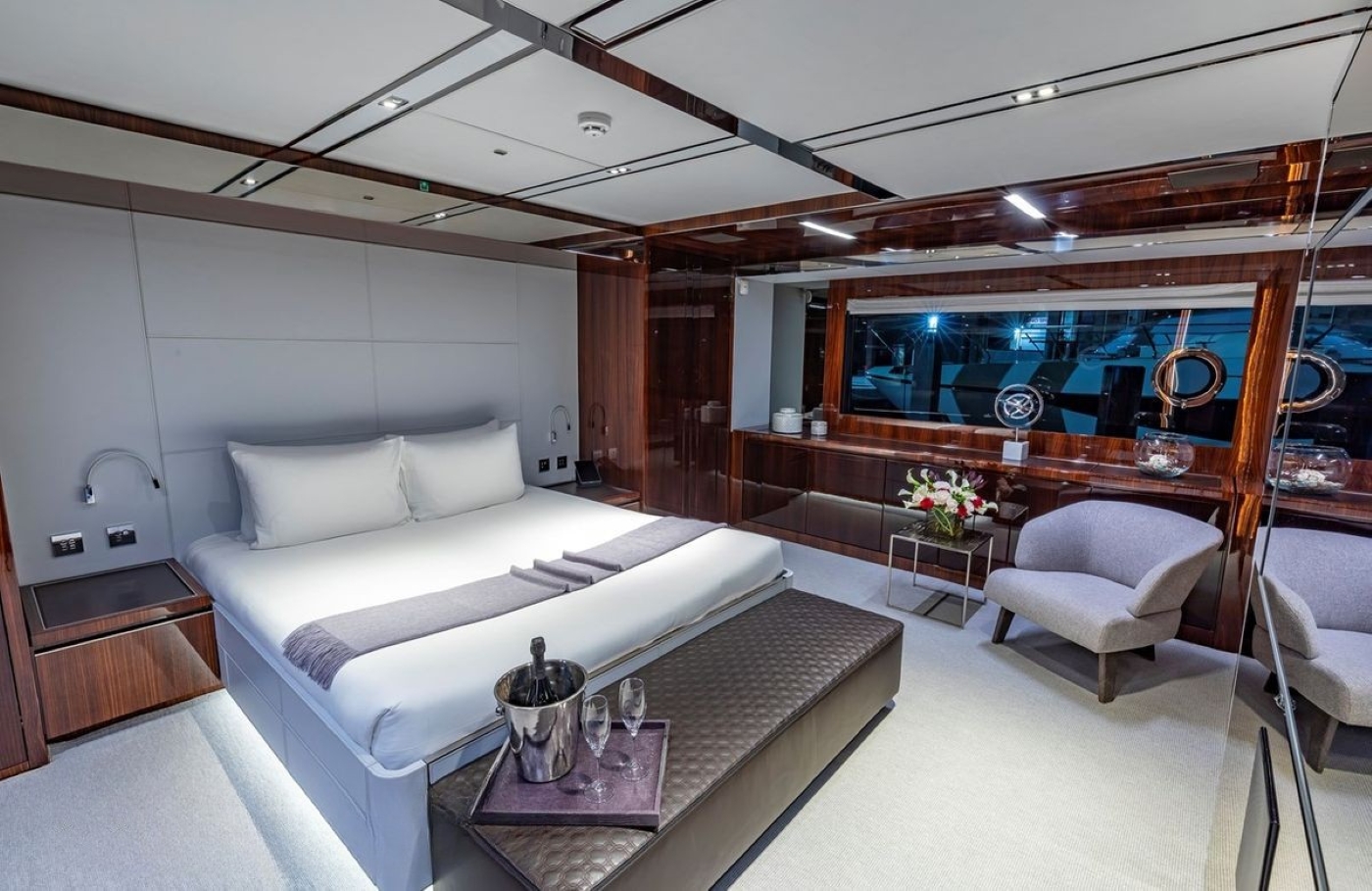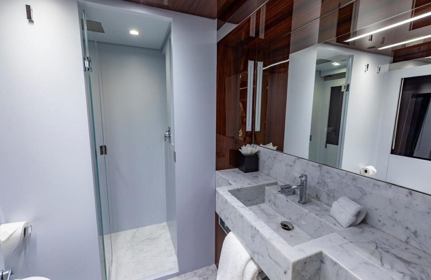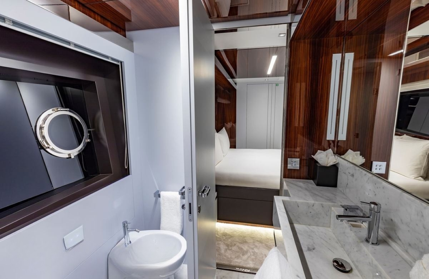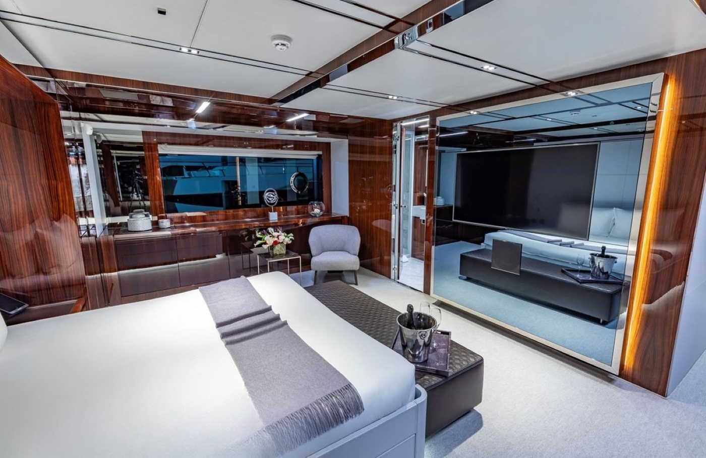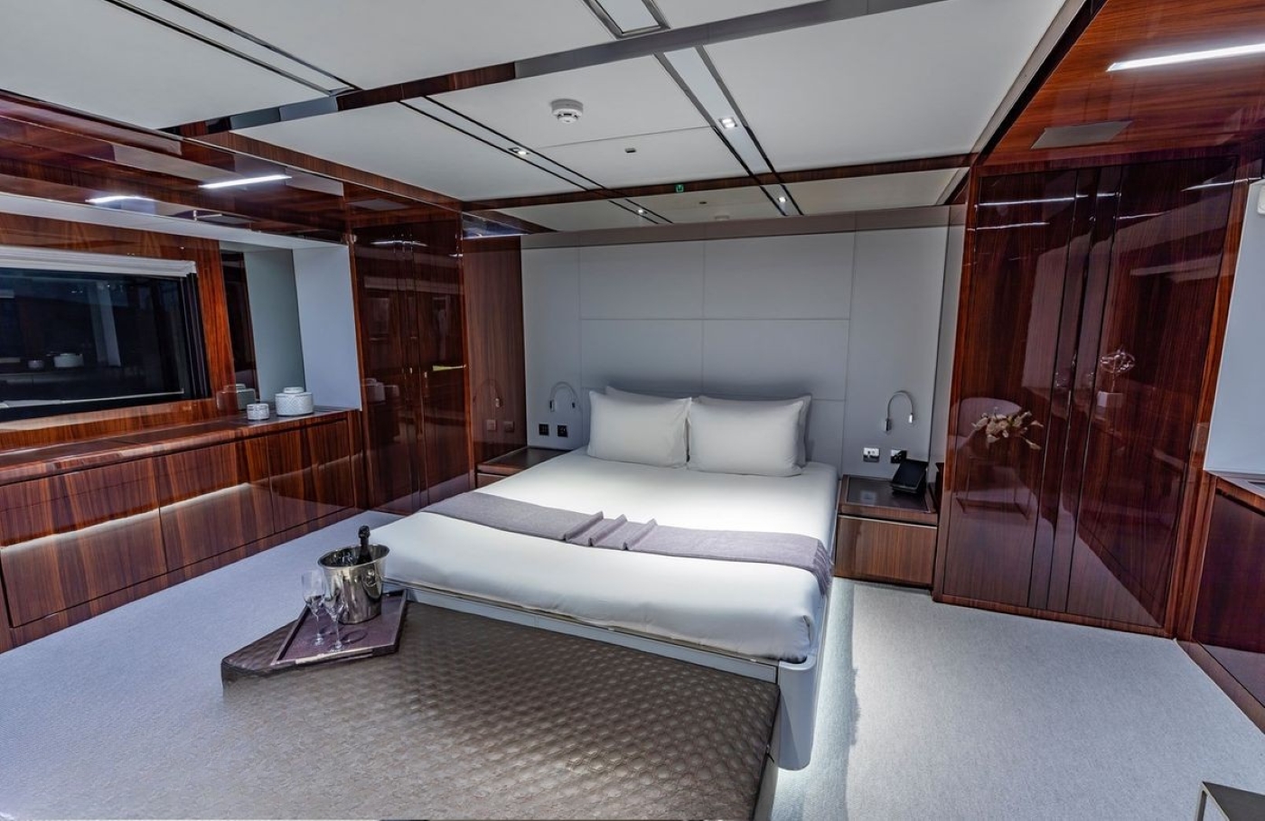 Launched in 2019, NO SURRENDER is in impeccable condition and offers spacious accommodation for eight guests. The arrangement comprises a master suite, a VIP double and two guest cabins that can be configured as double or twin berths. All of the accommodation is en suite, with plenty of wardrobe space and large windows in the port or starboard side.