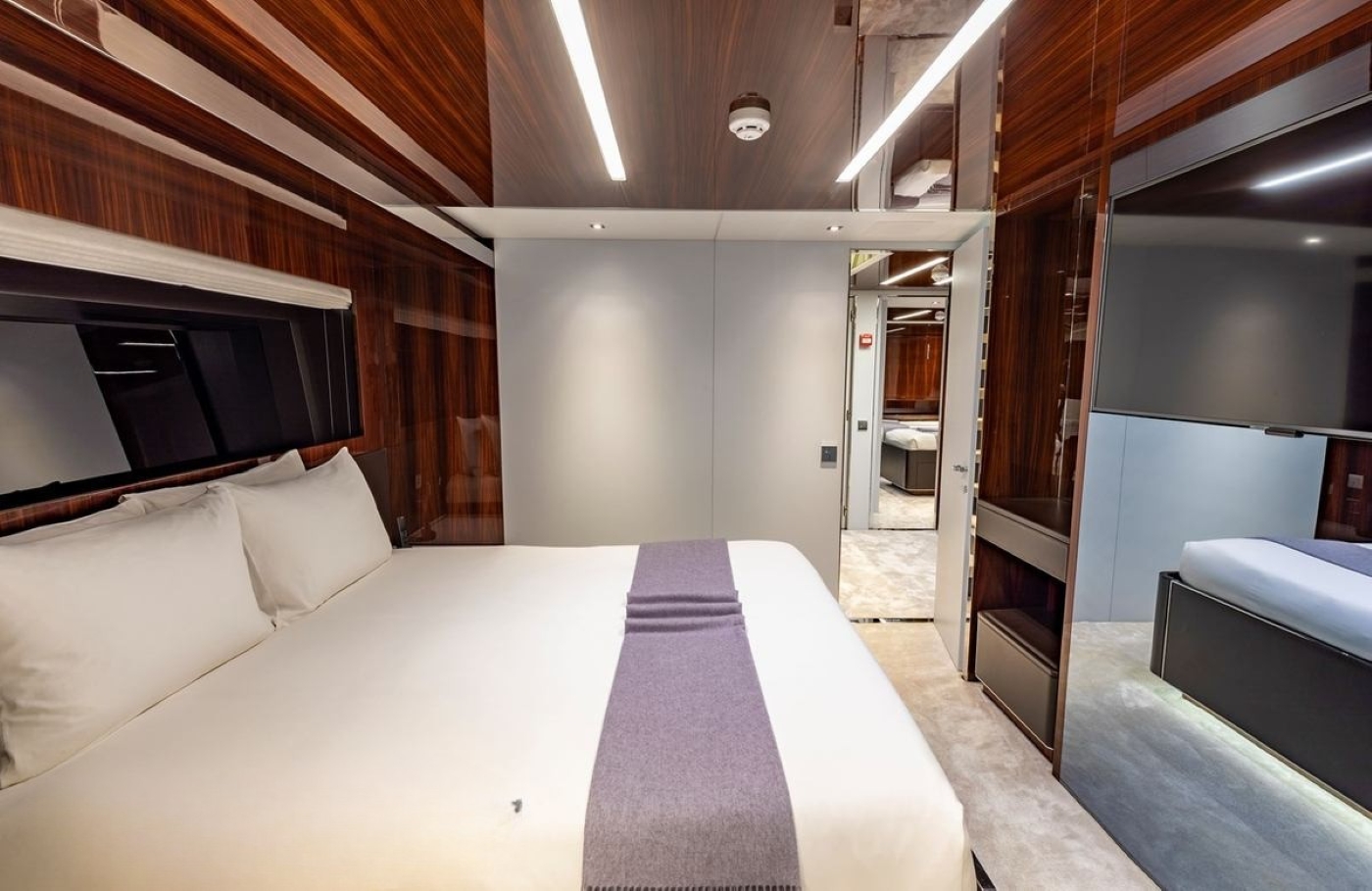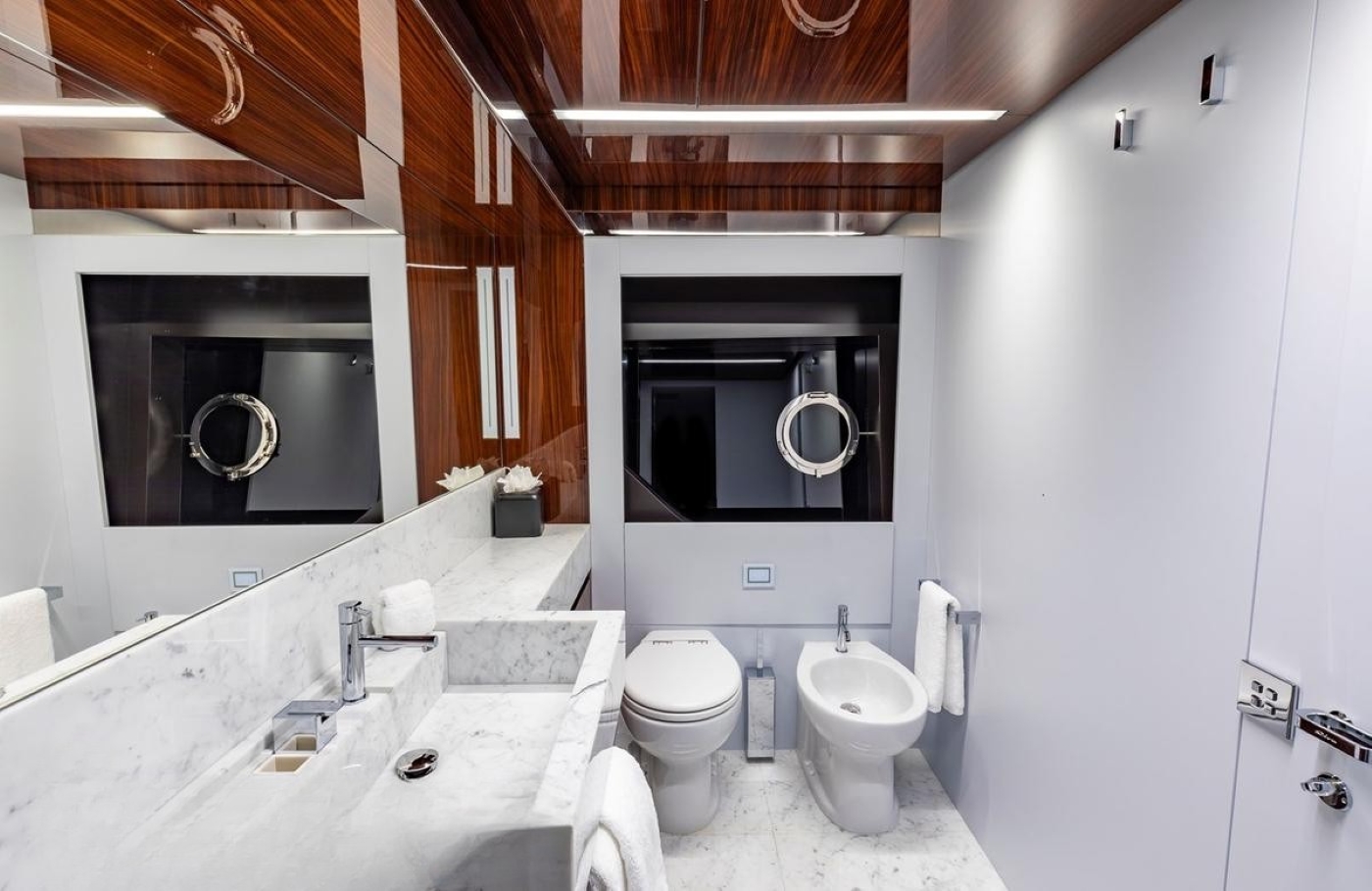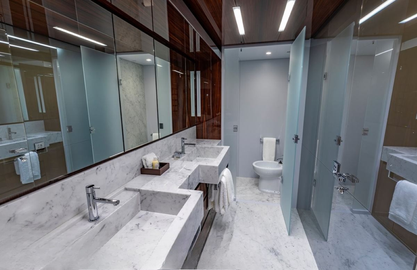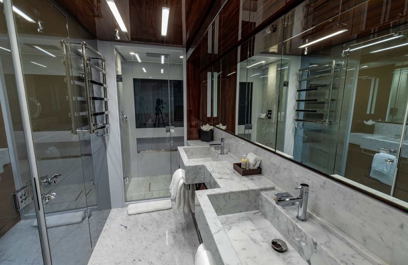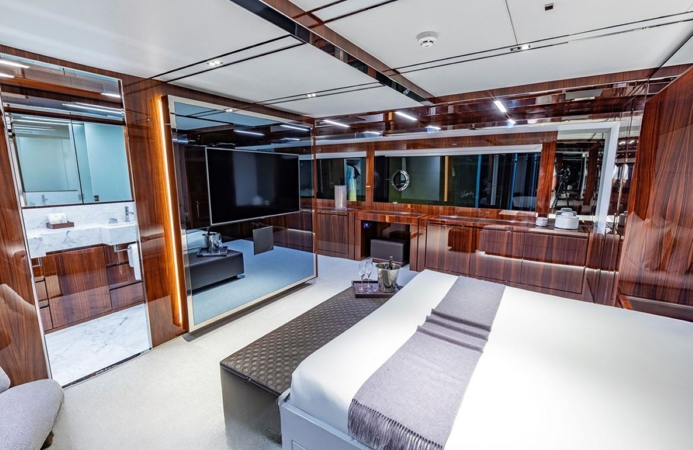 Launched in 2019, NO SURRENDER is in impeccable condition and offers spacious accommodation for eight guests. The arrangement comprises a master suite, a VIP double and two guest cabins that can be configured as double or twin berths. All of the accommodation is en suite, with plenty of wardrobe space and large windows in the port or starboard side.