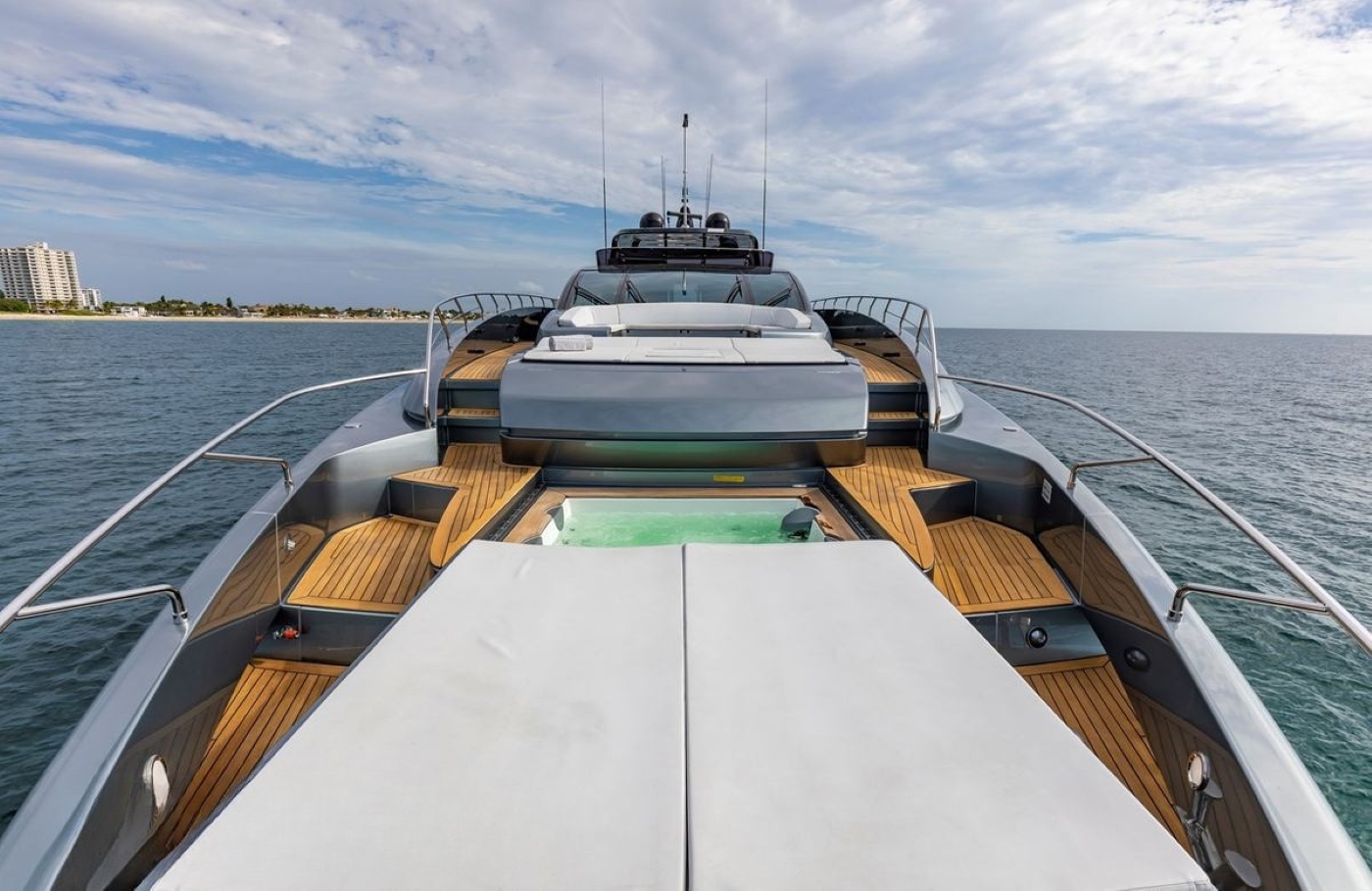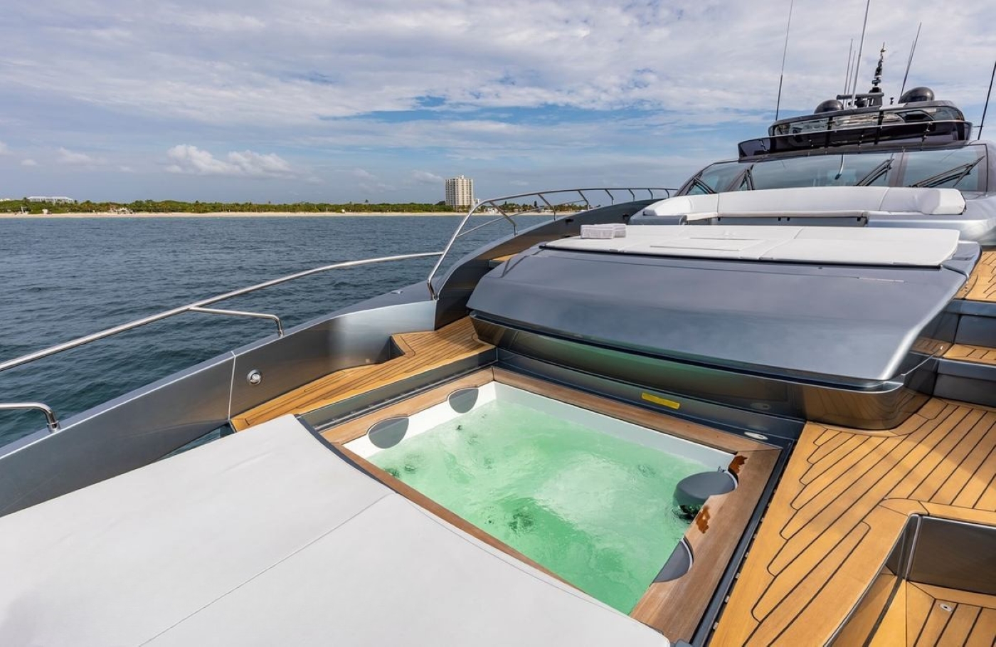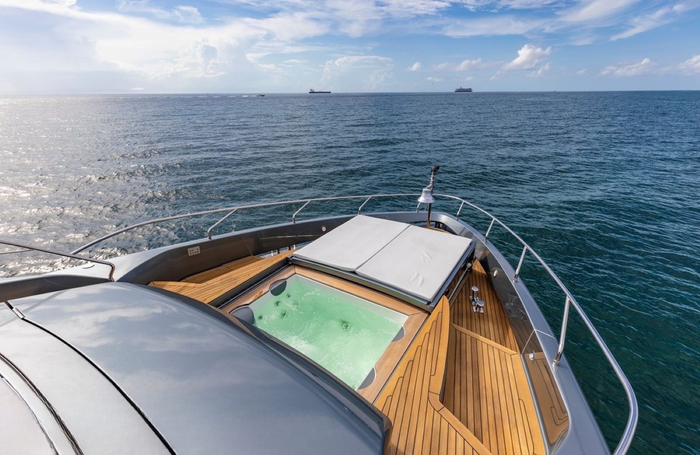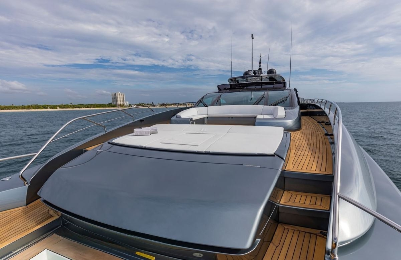 On the bow, a bank of sun pads provides a prime sunbathing spot and thrilling place to feel the full force of NO SURRENDER’s 30-knot top speed when underway. A removable sun shade provides respite from the sun if desired.