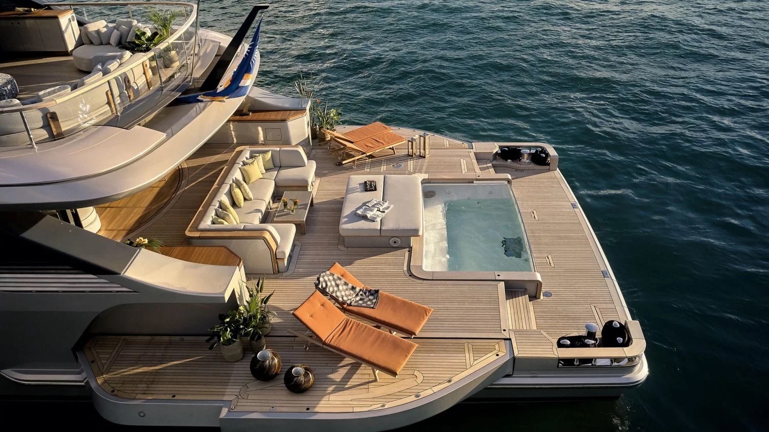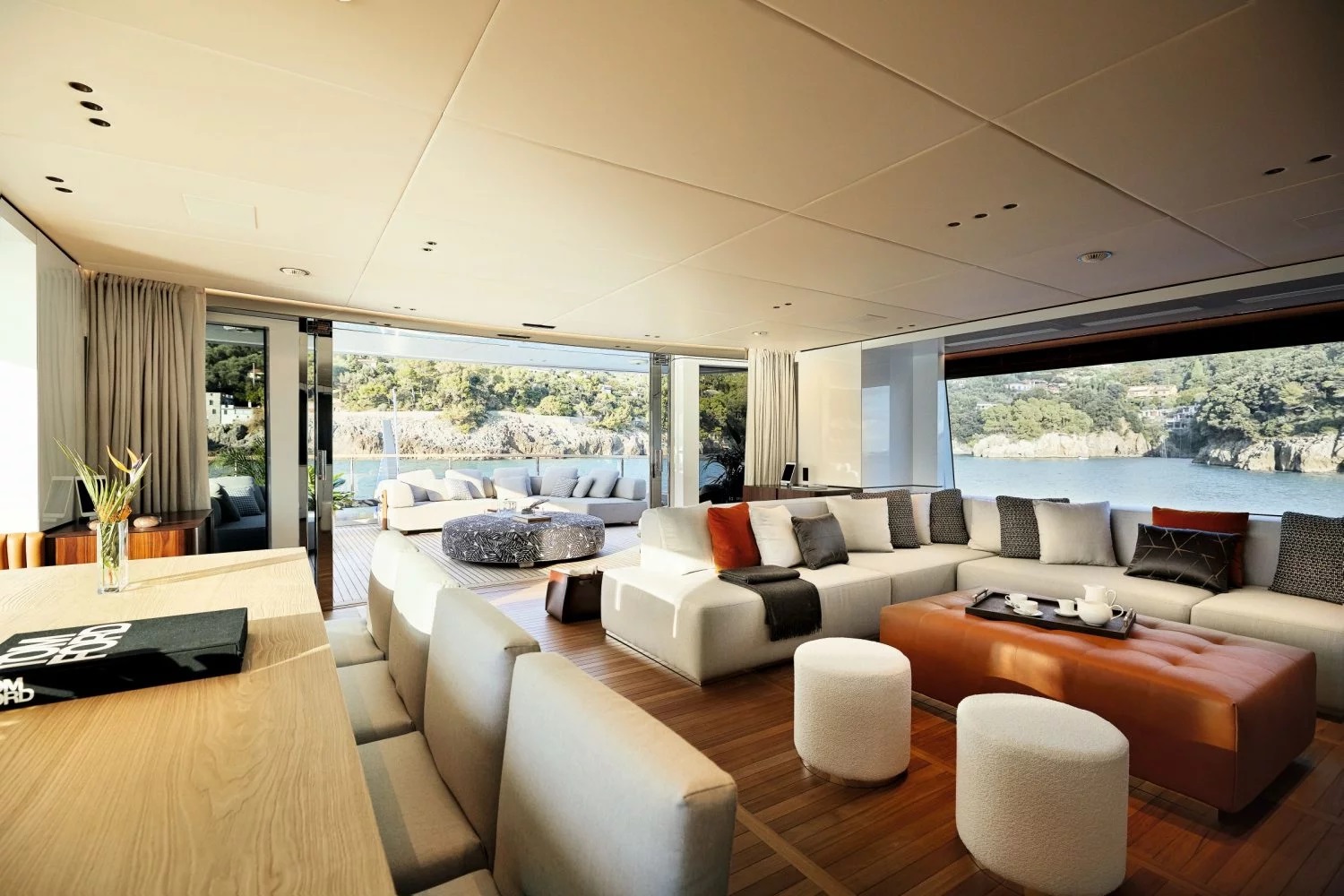 Across her three deck levels this superb Benetti yacht offers tranquil and sociable spaces for guests to enjoy their time on board. The most outstanding feature is the Oasis Deck, a brand-new philosophy which connects the main salon through to an outdoor lounge and terrace and steps leading down to the water in an unbroken flow. The space also boasts a central, glass fronted pool and two-fold out sides to further increase the area.