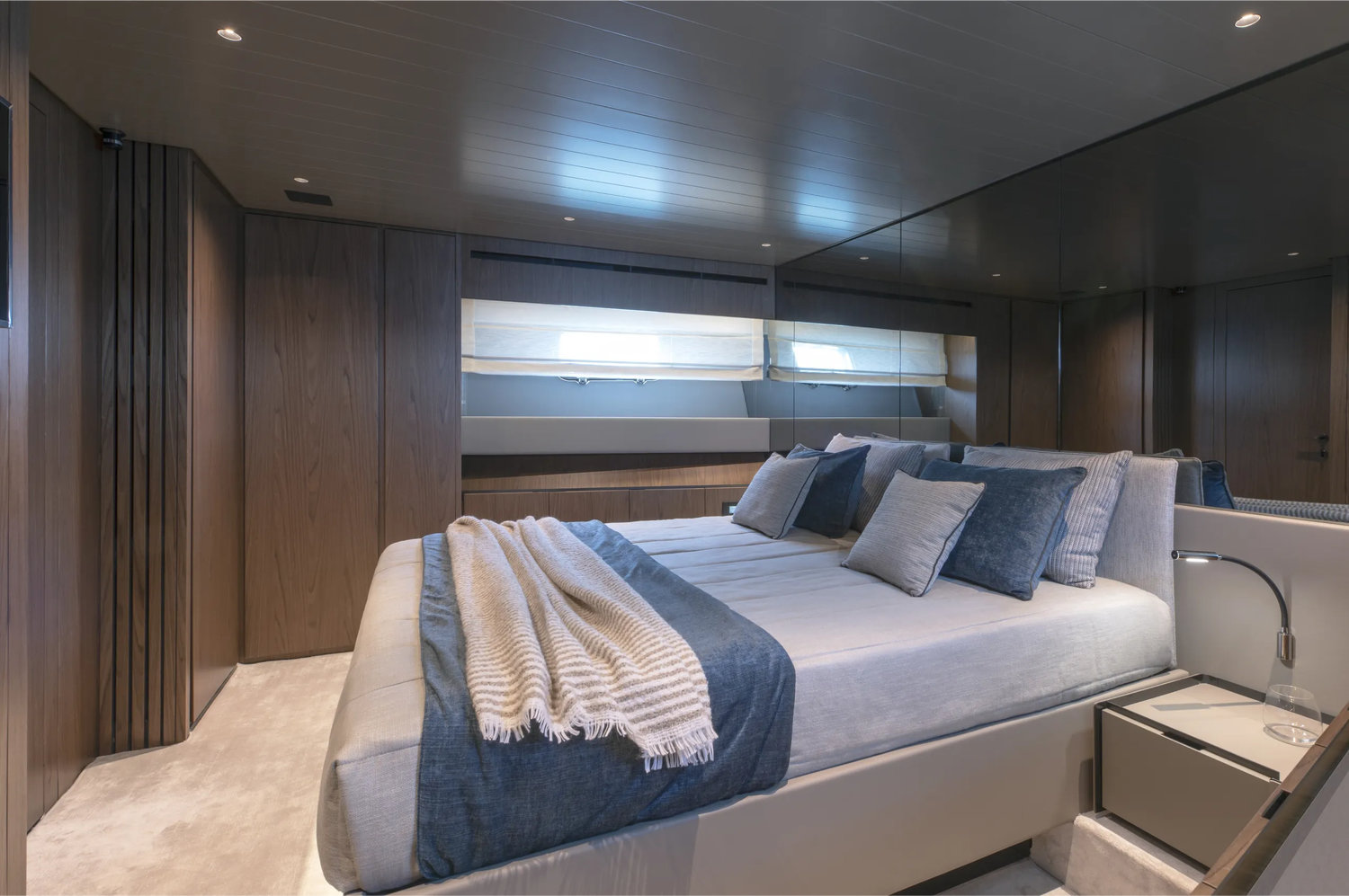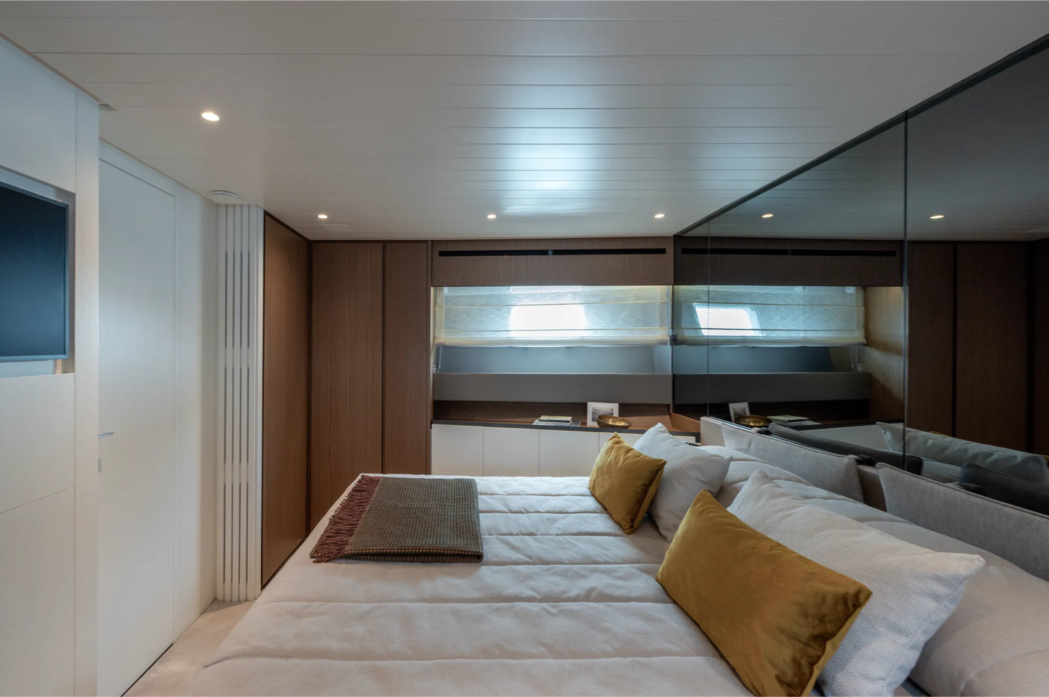 Guest accommodation aboard KIMANI comprises: ~1 full-beam Master suite with double bed and ensuite bathroom ~1 VIP cabin with double bed and ensuite bathroom ~1 Twin cabin accommodating two guests, also with ensuite bathroom Each cabin is tastefully styled with contemporary finishes, air conditioning, and private entertainment systems. The layout is designed to comfortably accommodate up to six guests with absolute privacy and style.