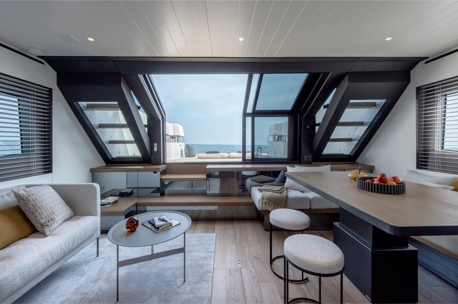 Decks are arranged across three levels, each maximising space for convivial gatherings or peaceful repose. At water level, guests can launch the AGILIS Jet Tender or paddleboard with ease—while the shallow draft allows access to secluded bays that larger vessels cannot reach.